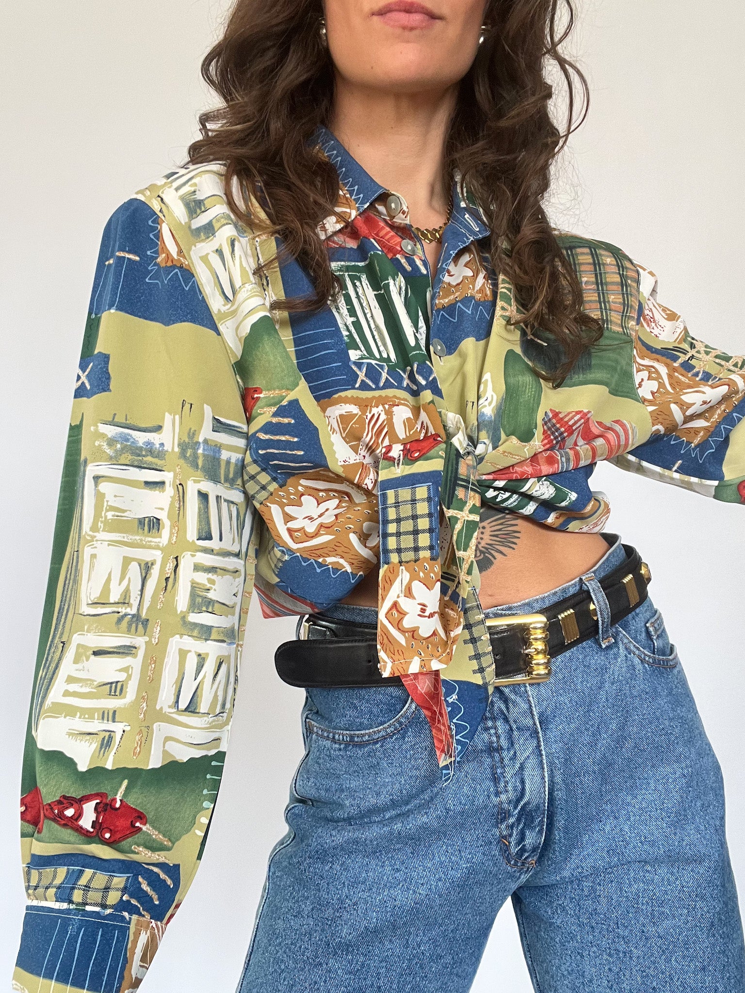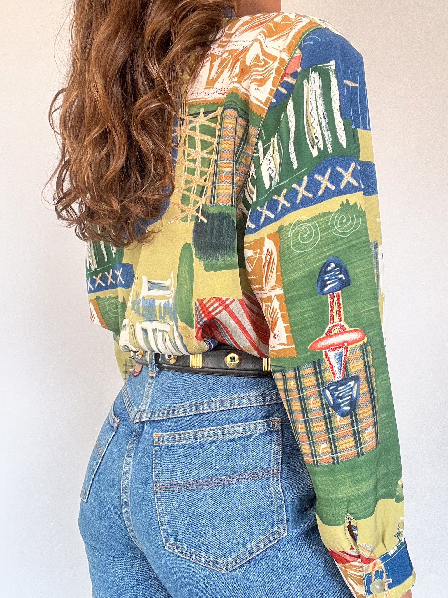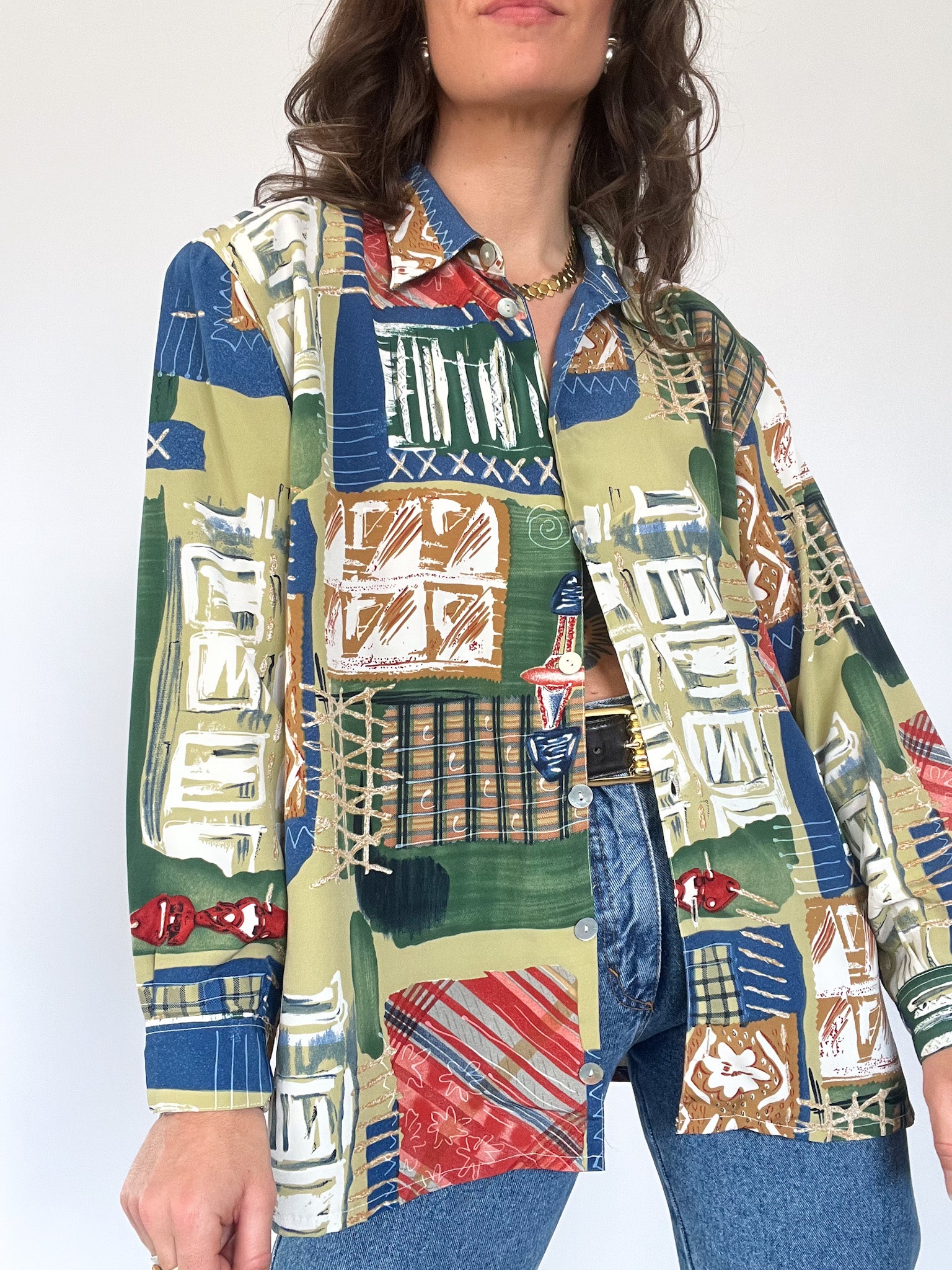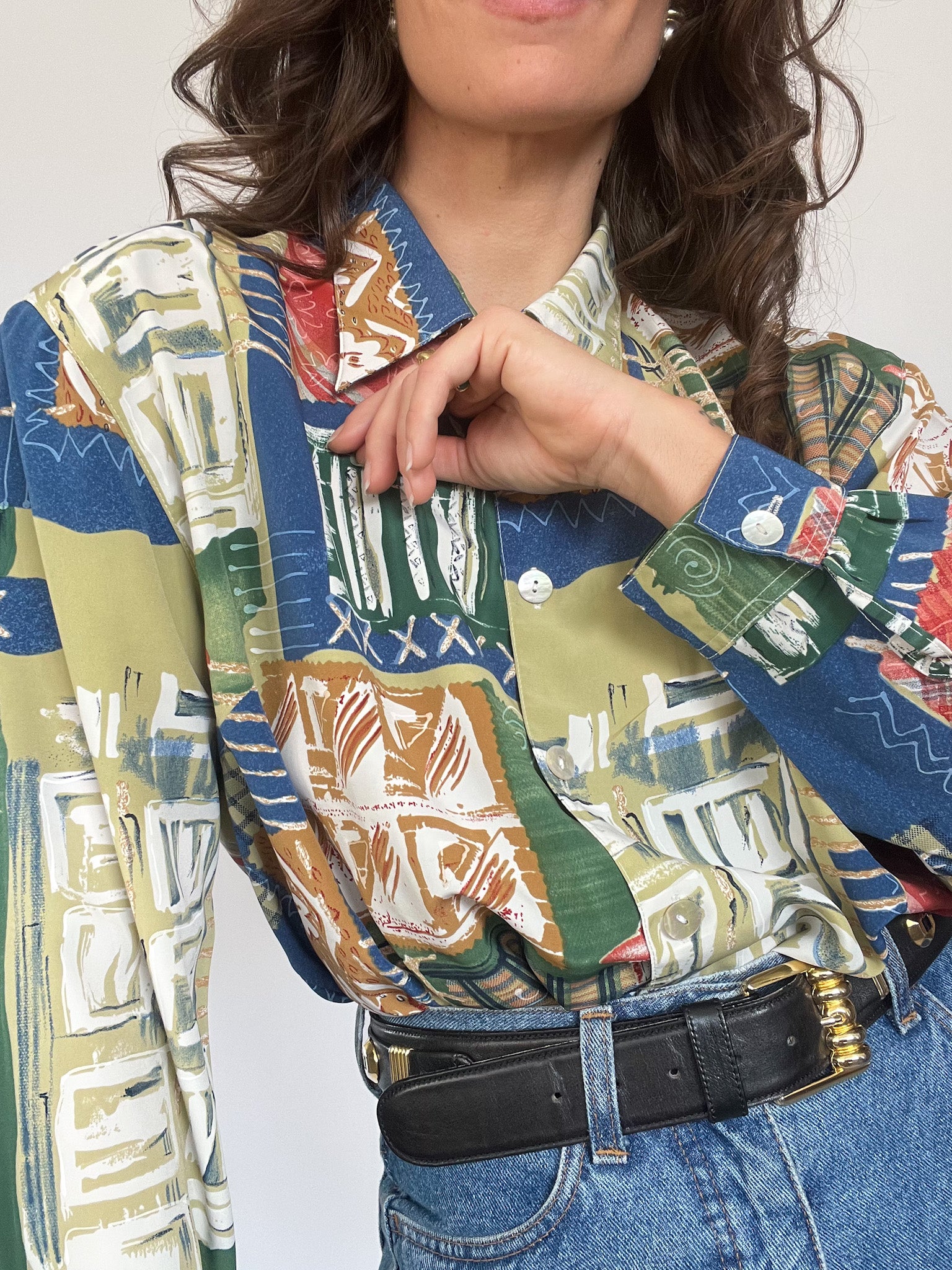 Bold, artsy, and full of attitude—this vintage shirt is an ode to expressive 80s fashion. Covered in a striking patchwork of abstract shapes, brushstrokes, and textured patterns in earthy tones—olive green, navy, terracotta, cream and hints of red—it’s the kind of piece that turns heads effortlessly. The fluid cut and lightweight fabric offer ease and comfort, while the structured collar and buttoned cuffs add a touch of sharpness. Tucked into high-waisted jeans or worn loose over a tank, it brings a fresh edge to your everyday looks.