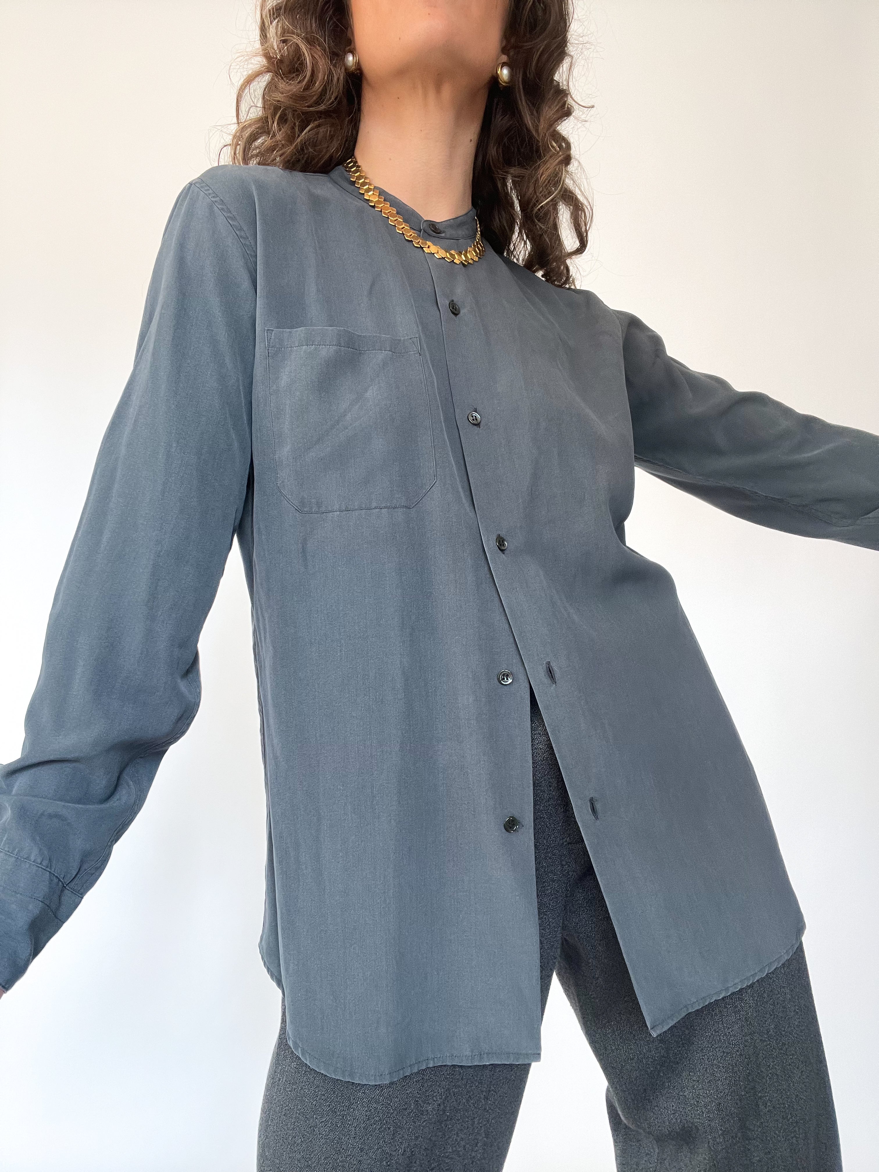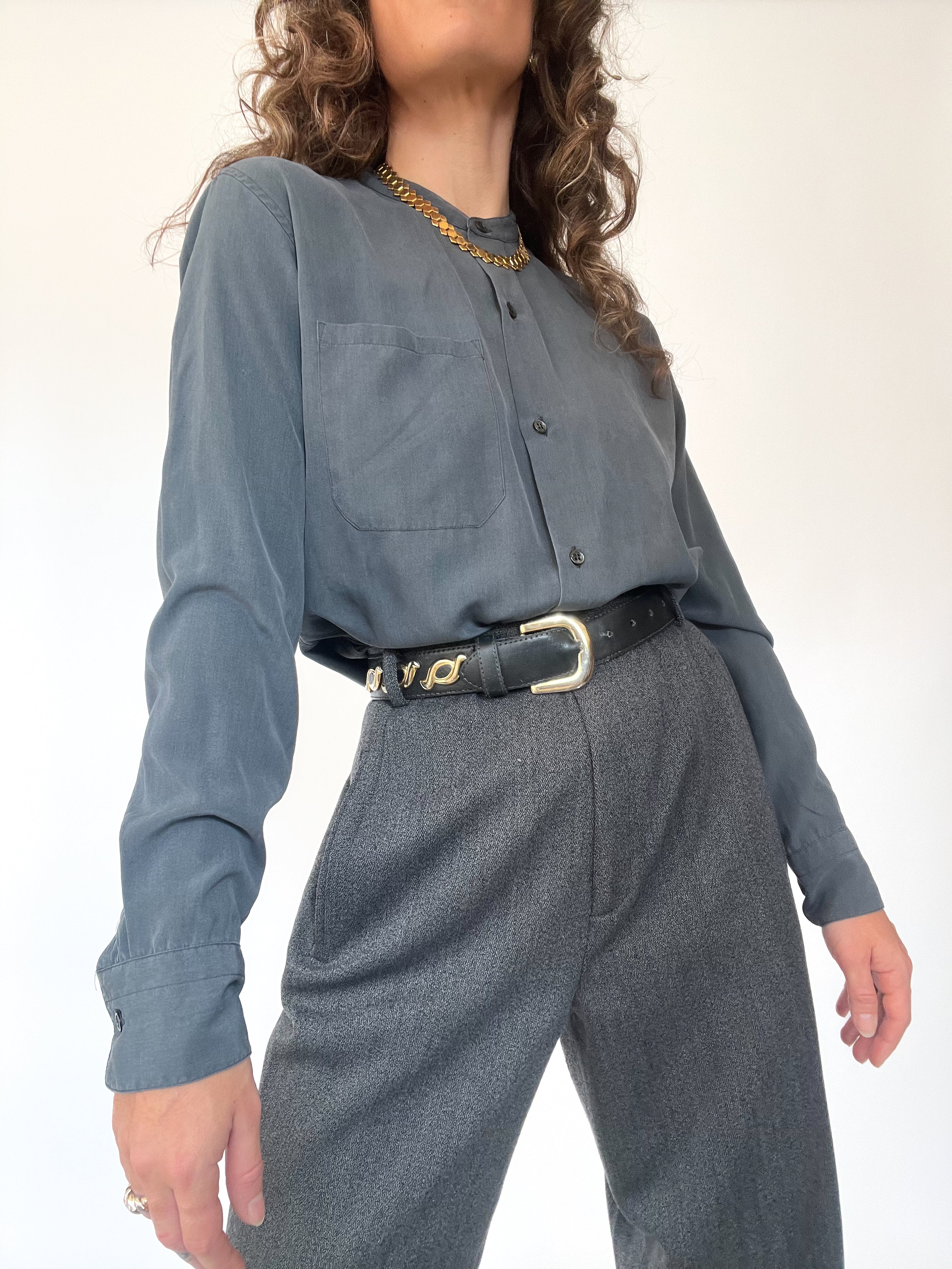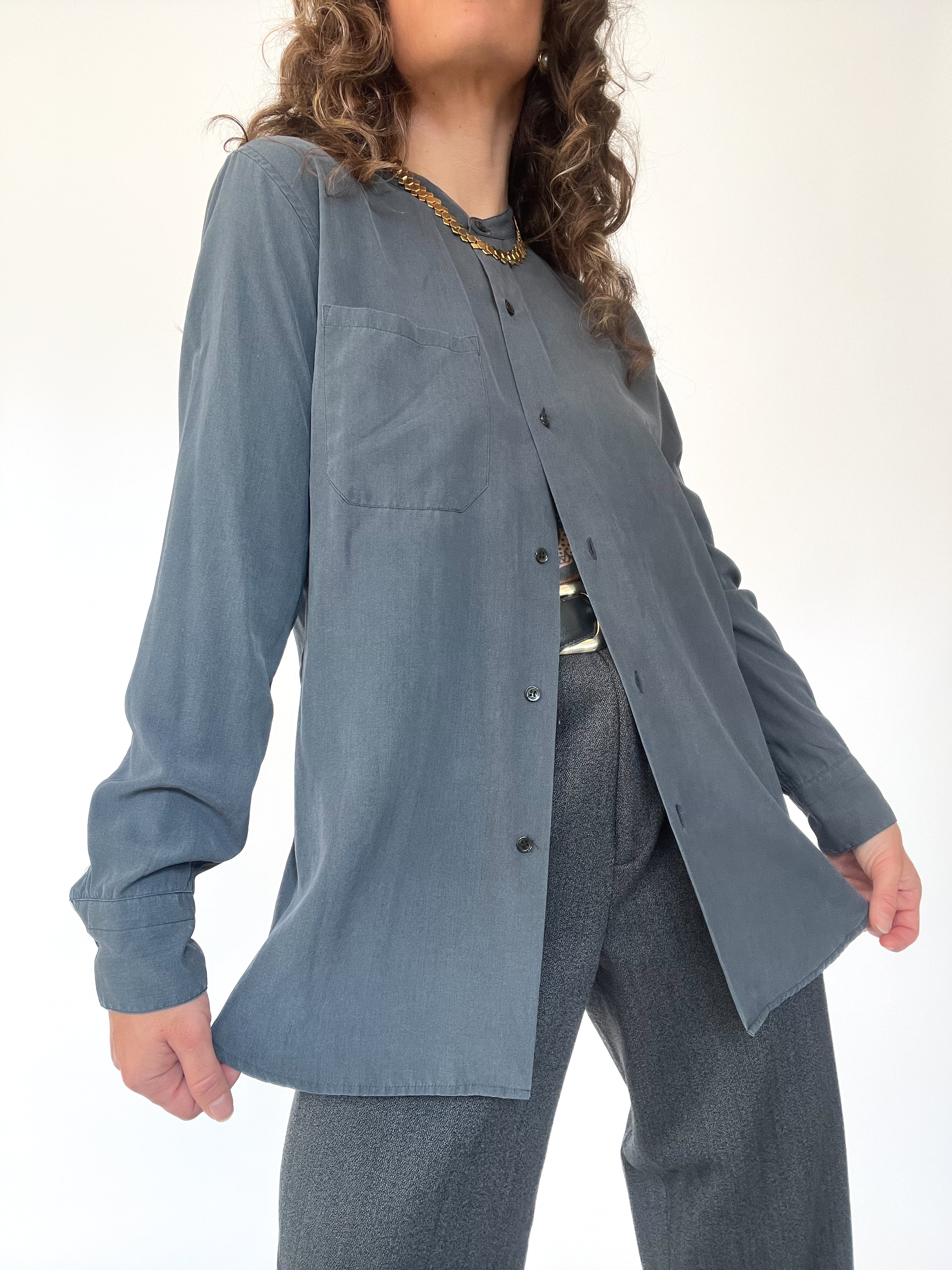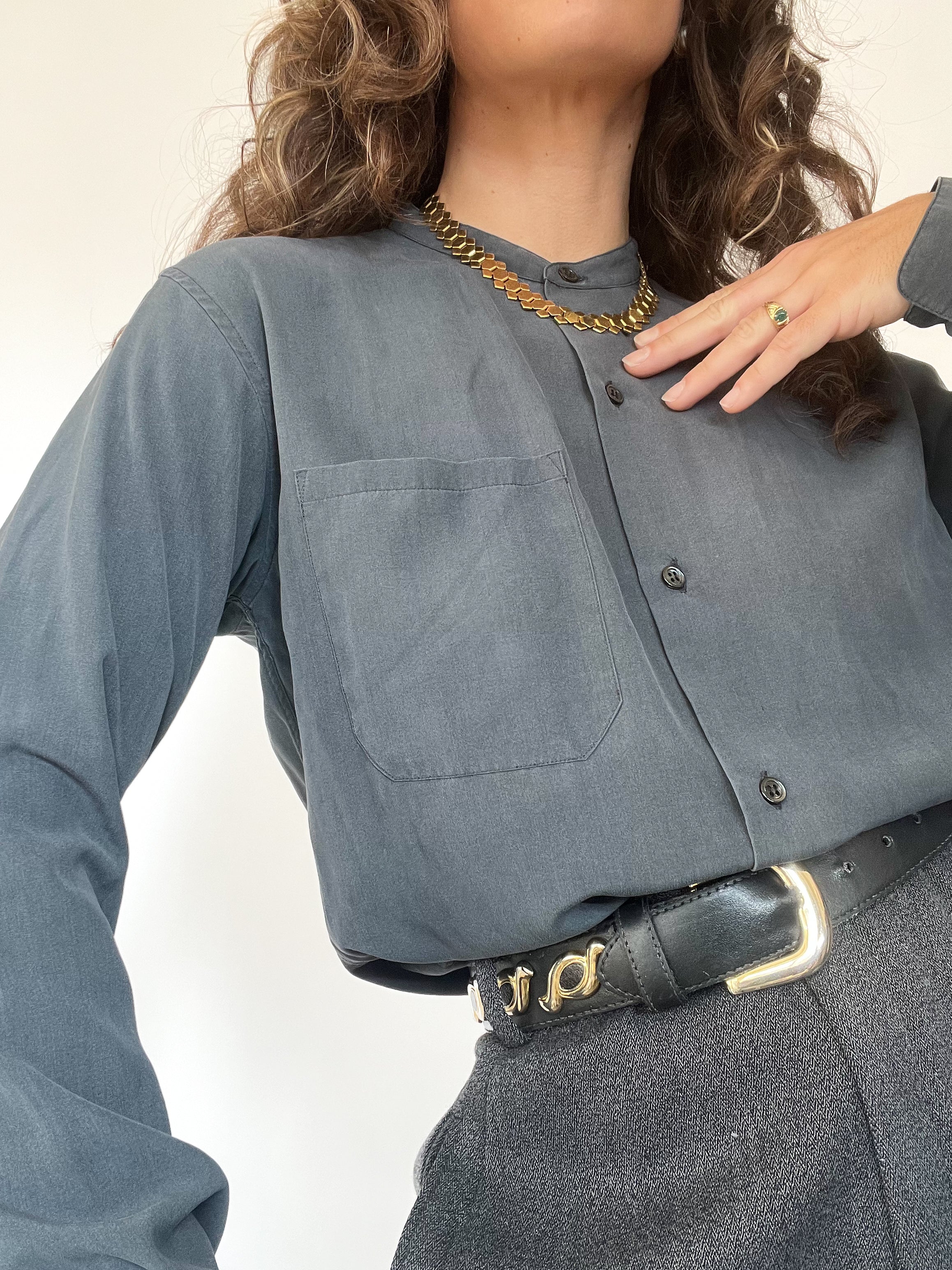 This vintage anthracite gray shirt made in France offers a timeless and minimalist aesthetic, perfect for a refined yet relaxed look. With a streamlined silhouette and a soft, muted color, it brings subtle sophistication to any outfit. Featuring a chest pocket and delicate buttons, this shirt is both practical and stylish—ideal for layering or as a standalone piece.
