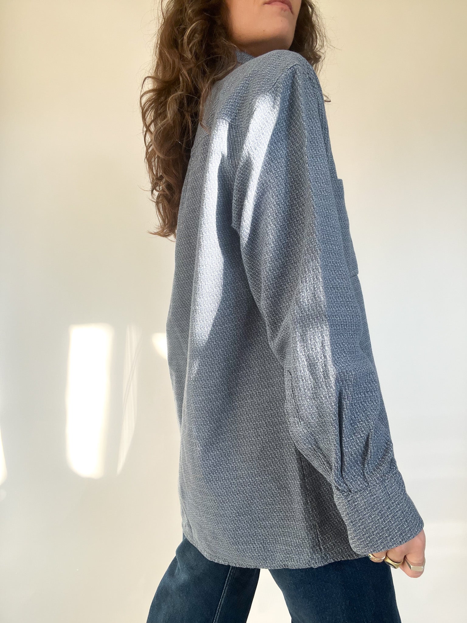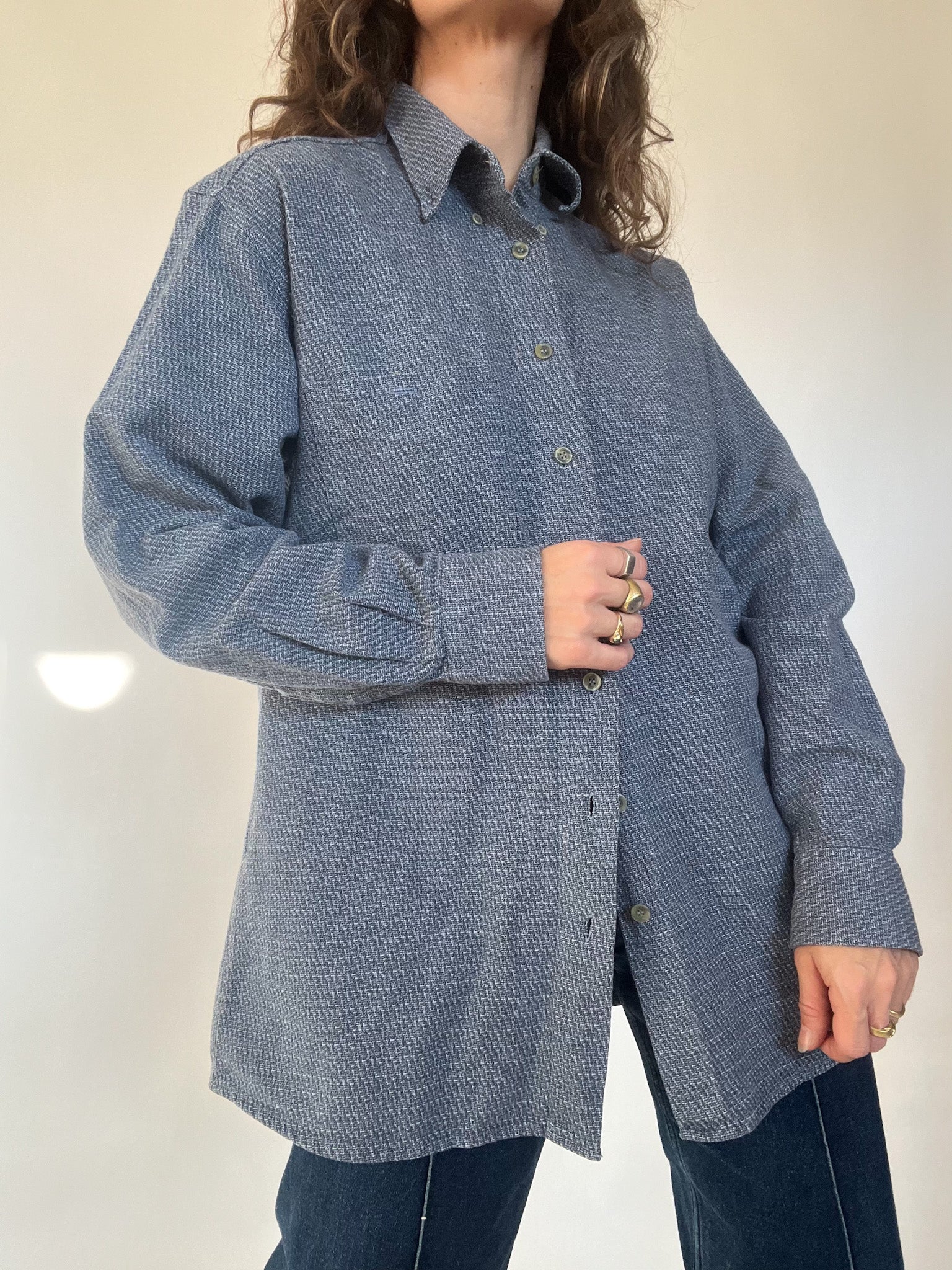 This vintage shirt offers a sophisticated yet relaxed vibe with its subtle textured pattern in muted blue tones. The tailored structure is softened by a slightly oversized cut, creating a balance of elegance and comfort. Perfect for layering or wearing on its own, this piece transitions effortlessly from casual daywear to elevated evening looks.