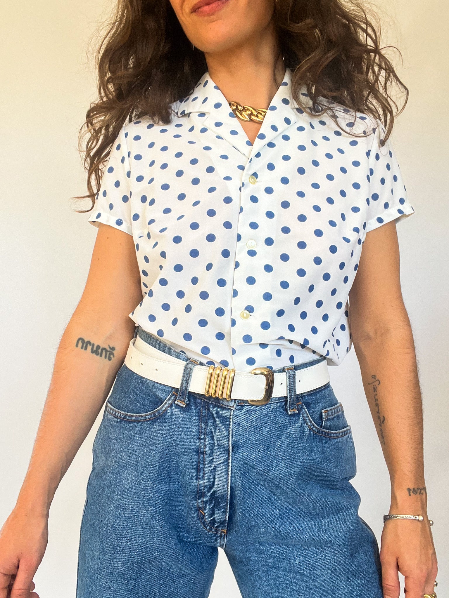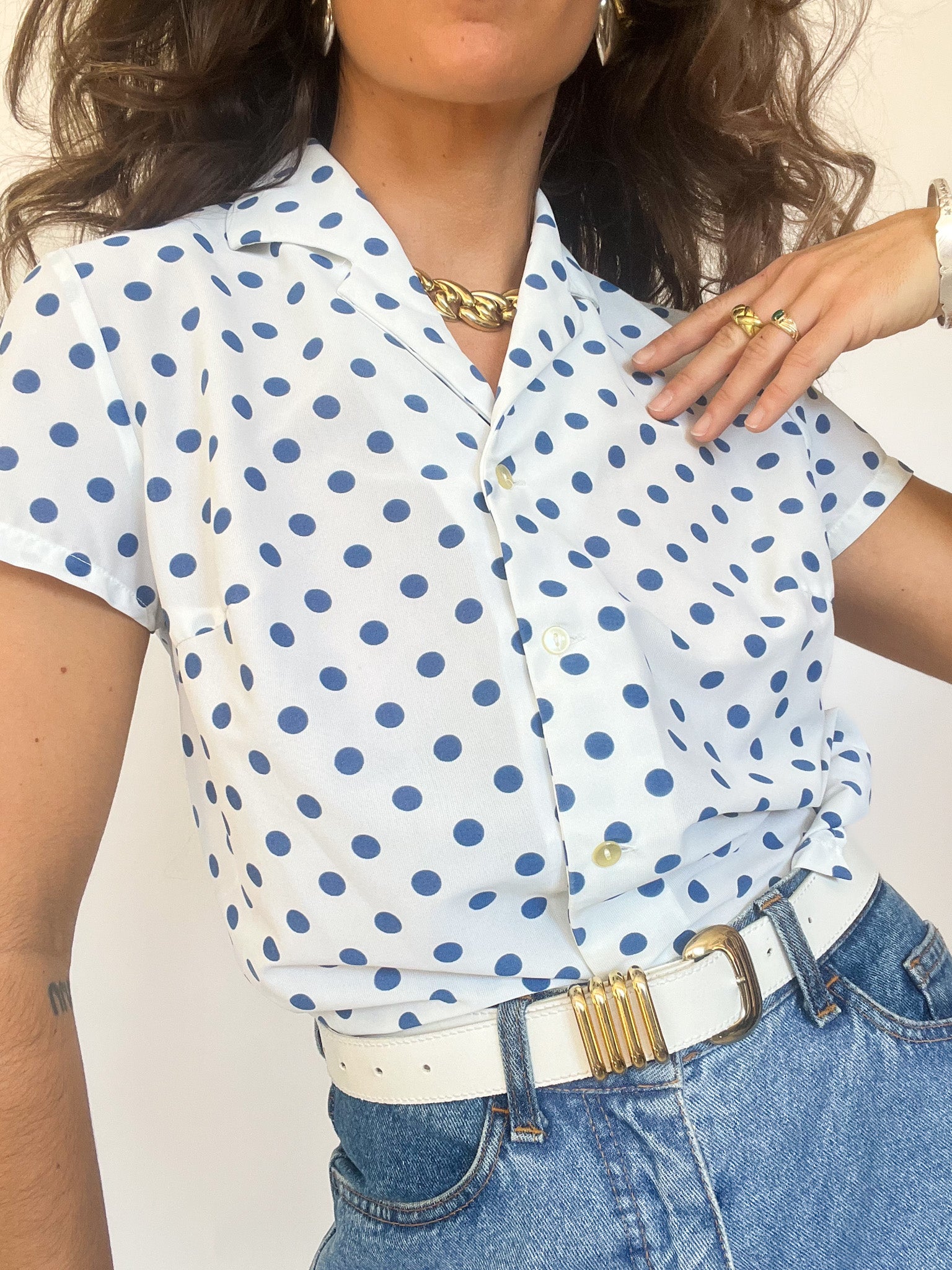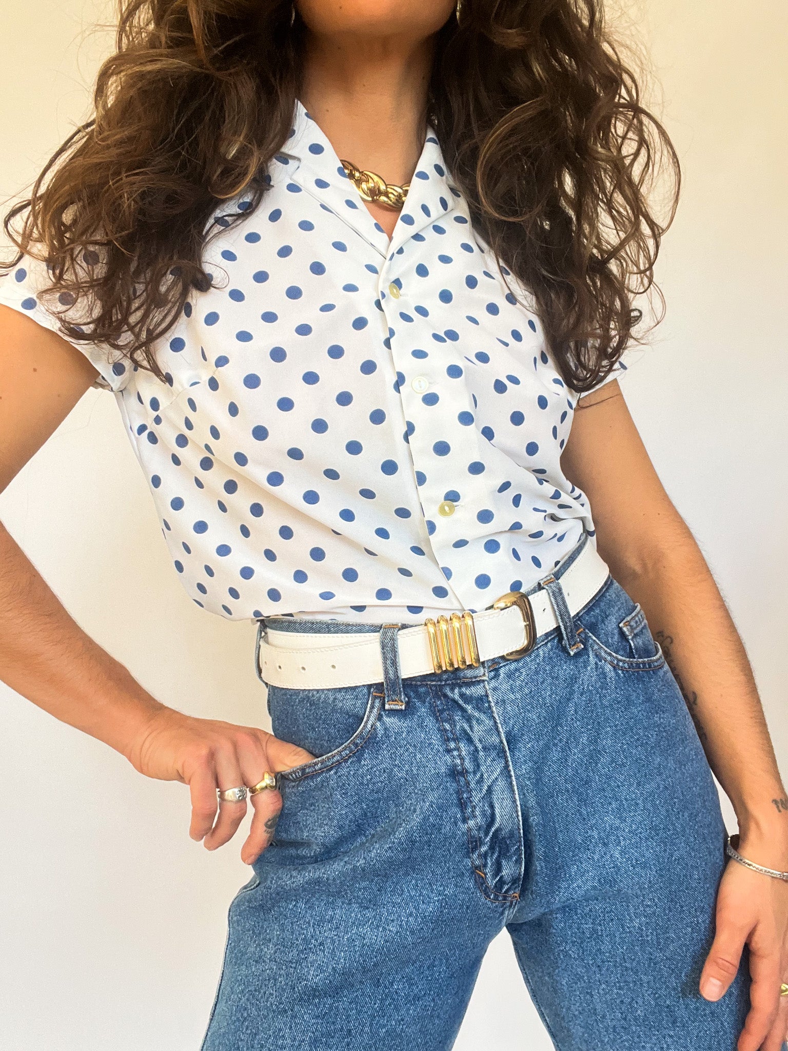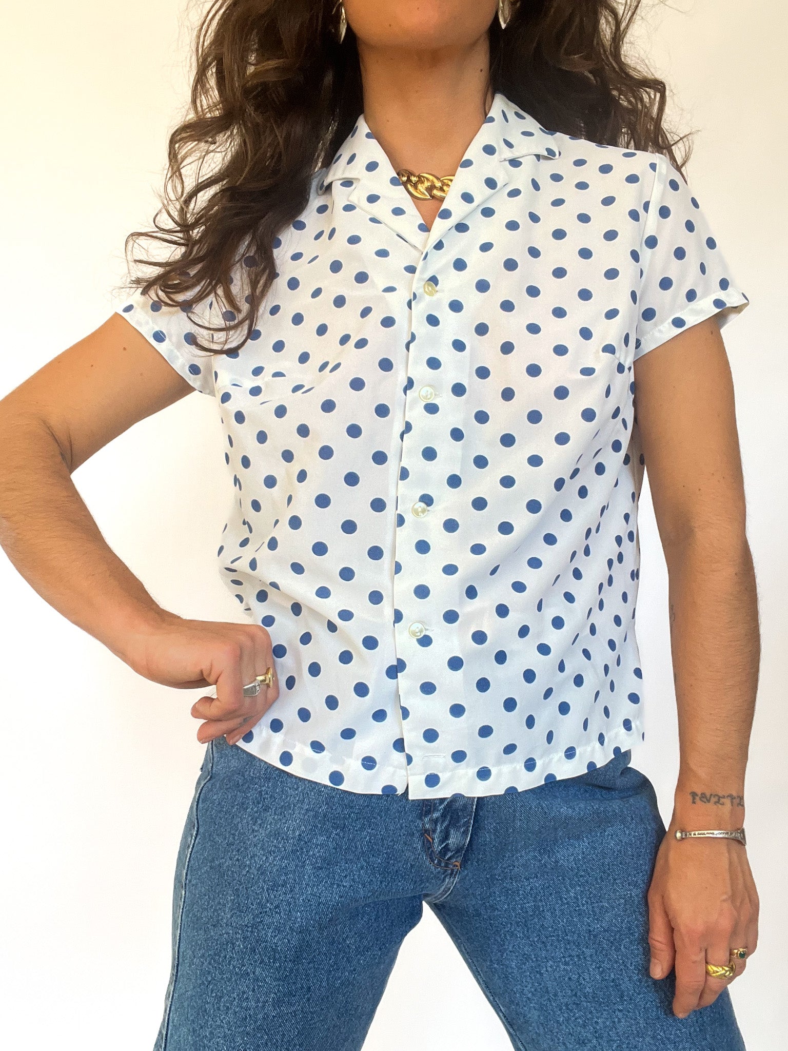 A timeless and playful piece that brings effortless charm to your wardrobe. This blue polka dot blouse captures the spirit of vintage femininity with a soft silhouette and crisp structure. Perfect for styling tucked into high-waisted denim or layered under a blazer. At Skorpiones Vintage, we celebrate women who dress with purpose and flair — this one’s for those who love to stand out without shouting.