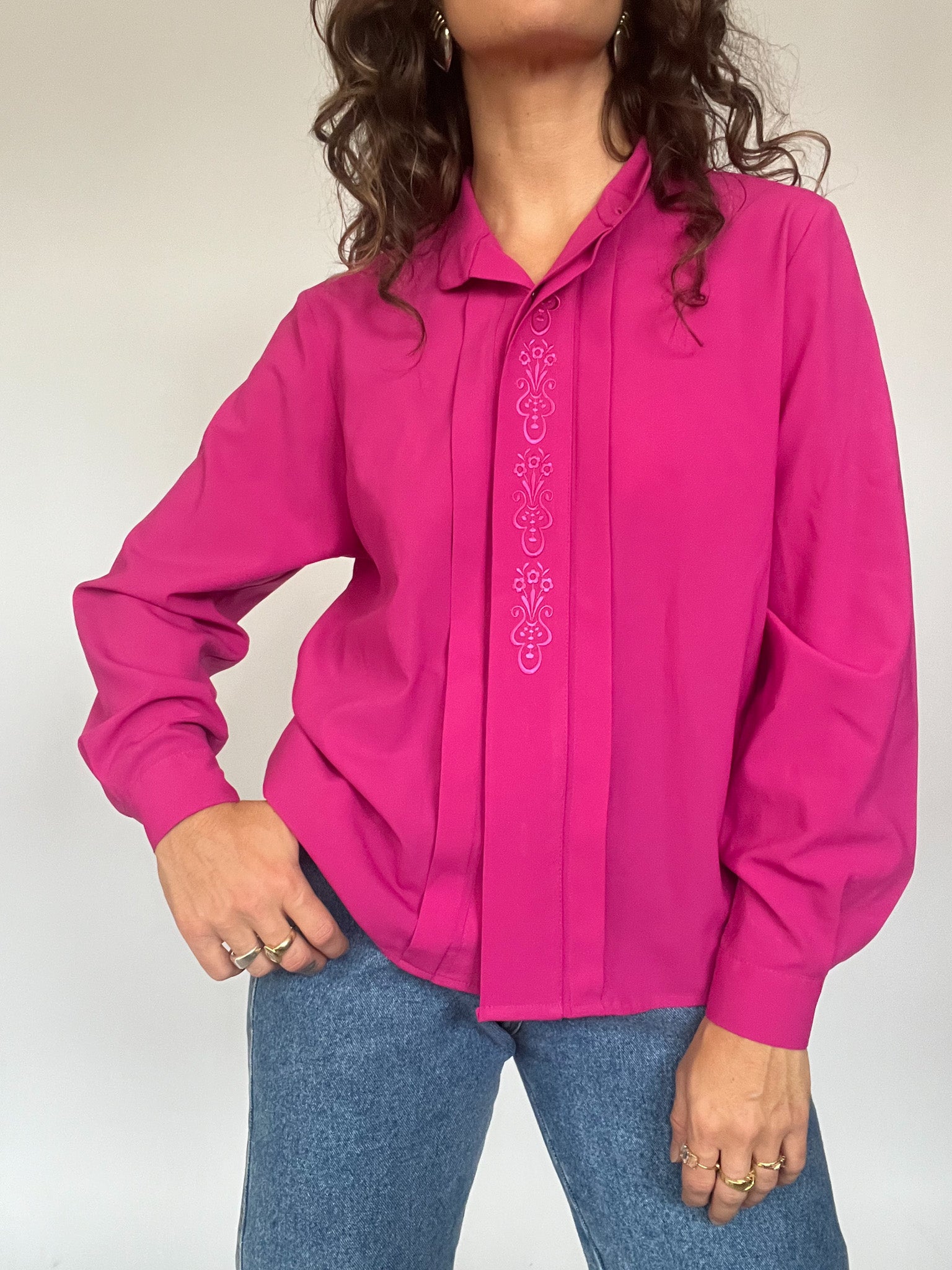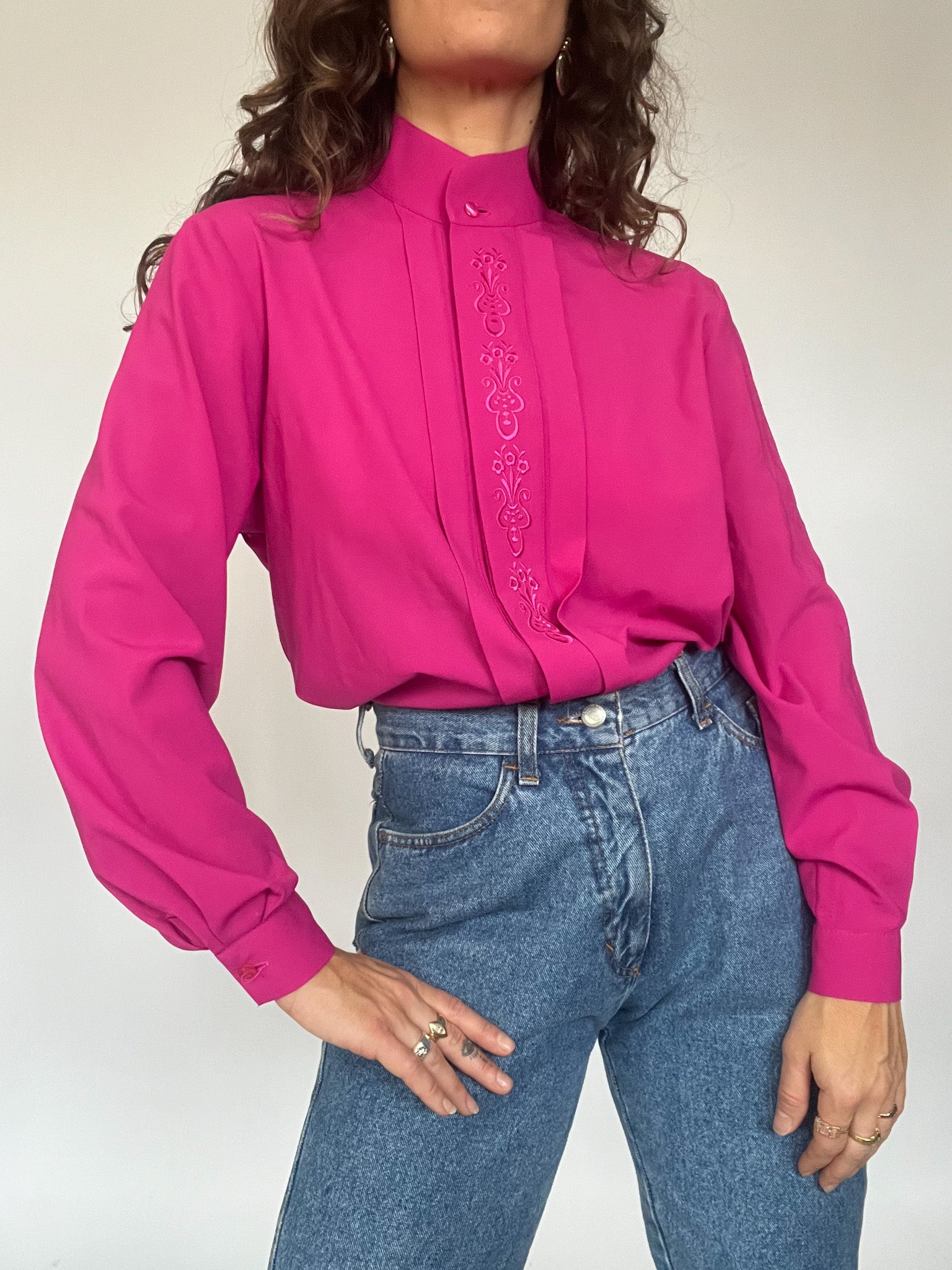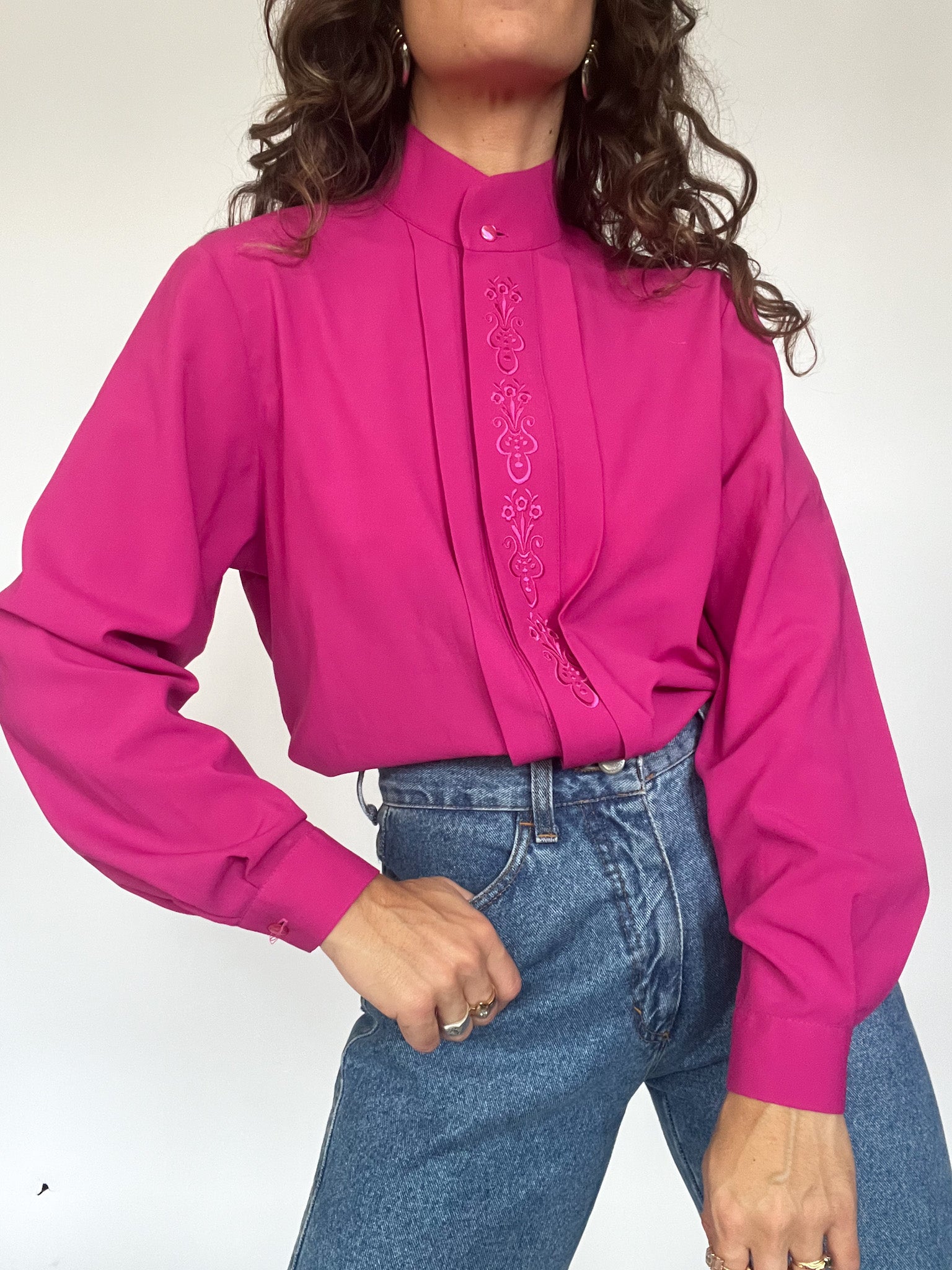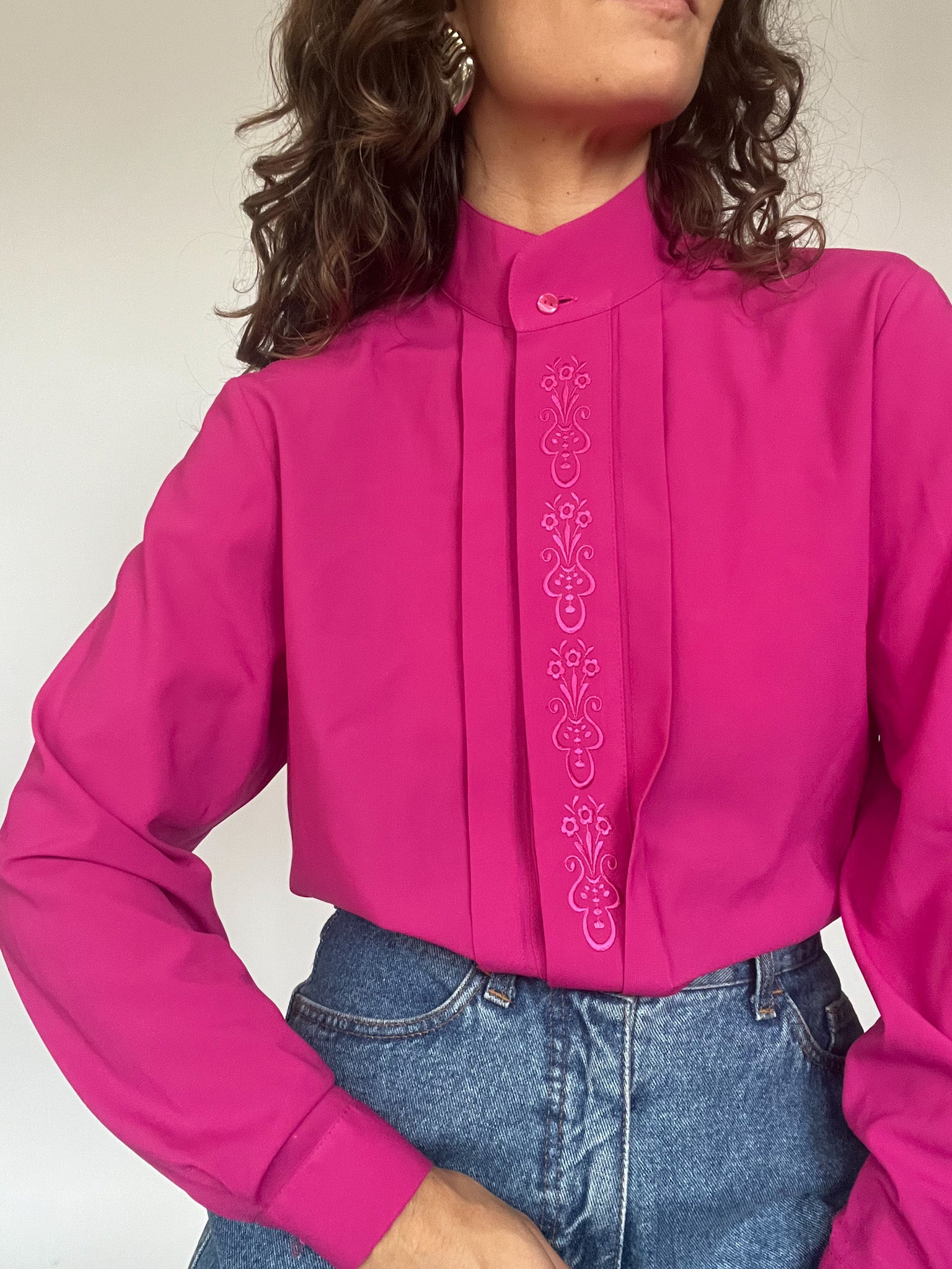 A statement piece that effortlessly blends vintage charm with refined elegance. This fuchsia blouse captivates with its structured mandarin collar and intricate embroidered detailing along the front pleats. The slightly voluminous sleeves add a touch of drama, cinched at the cuffs with delicate buttons for a polished finish. The lightweight fabric drapes beautifully, making it a versatile addition to any wardrobe—tuck it into high-waisted denim for a contemporary contrast or style it with tailored trousers for a sophisticated look.