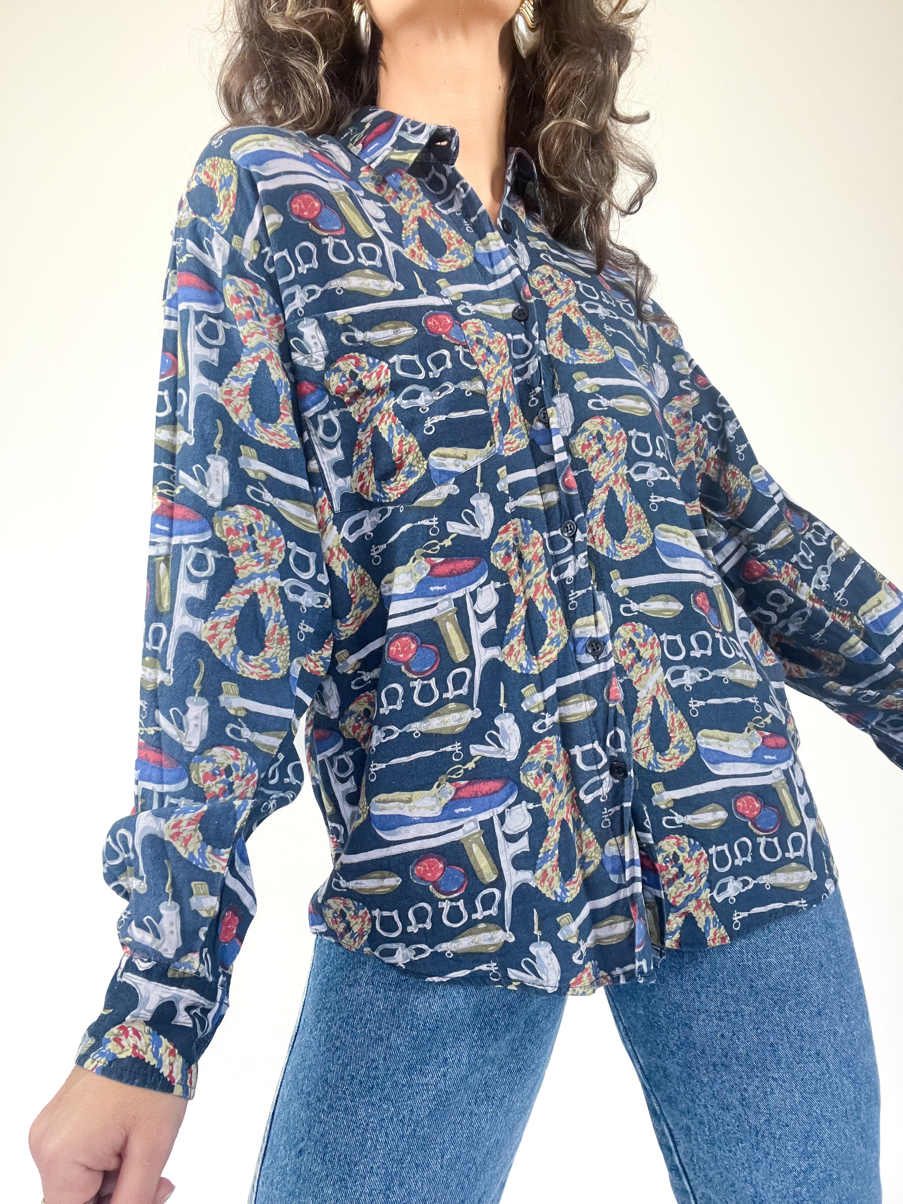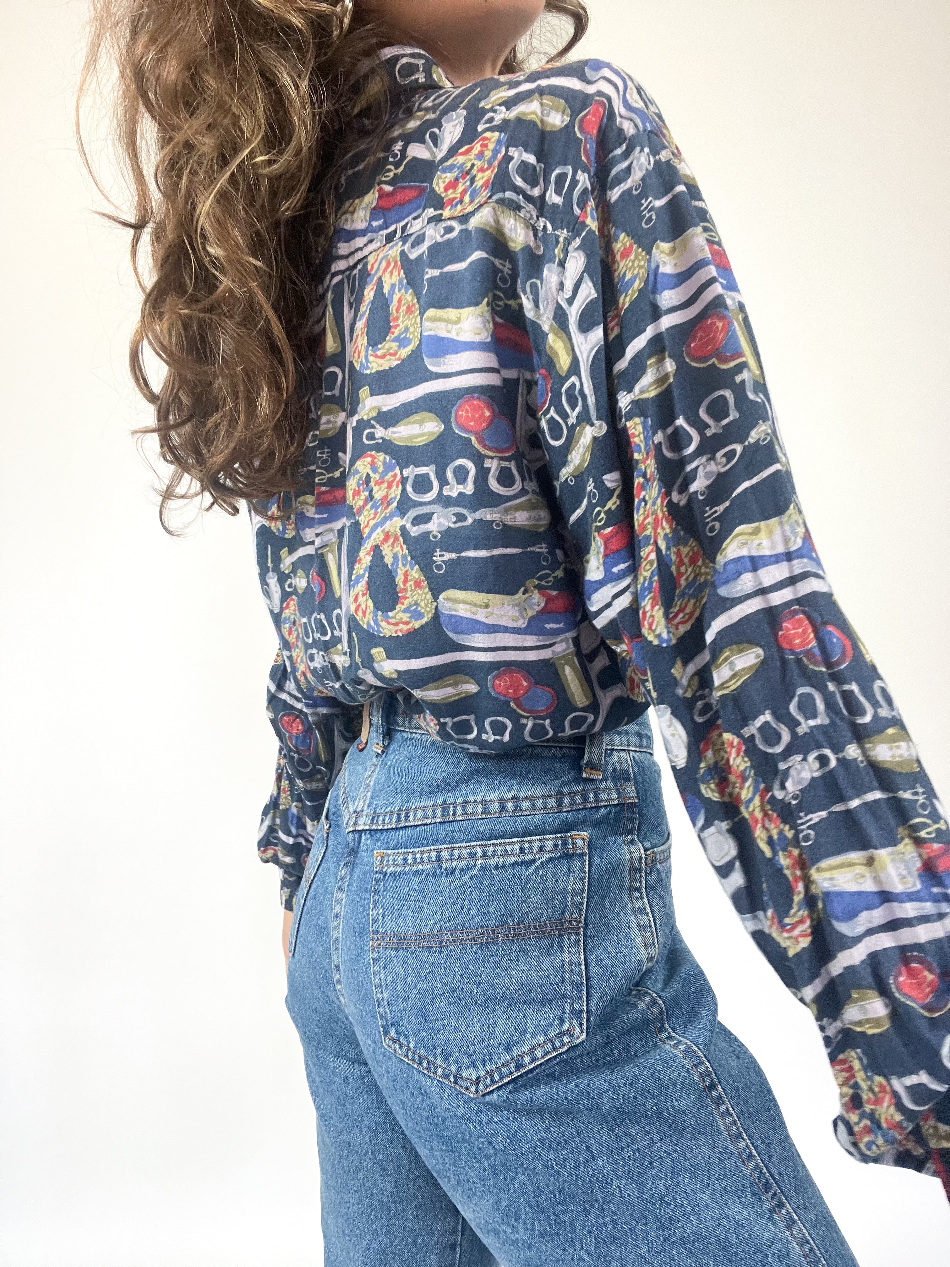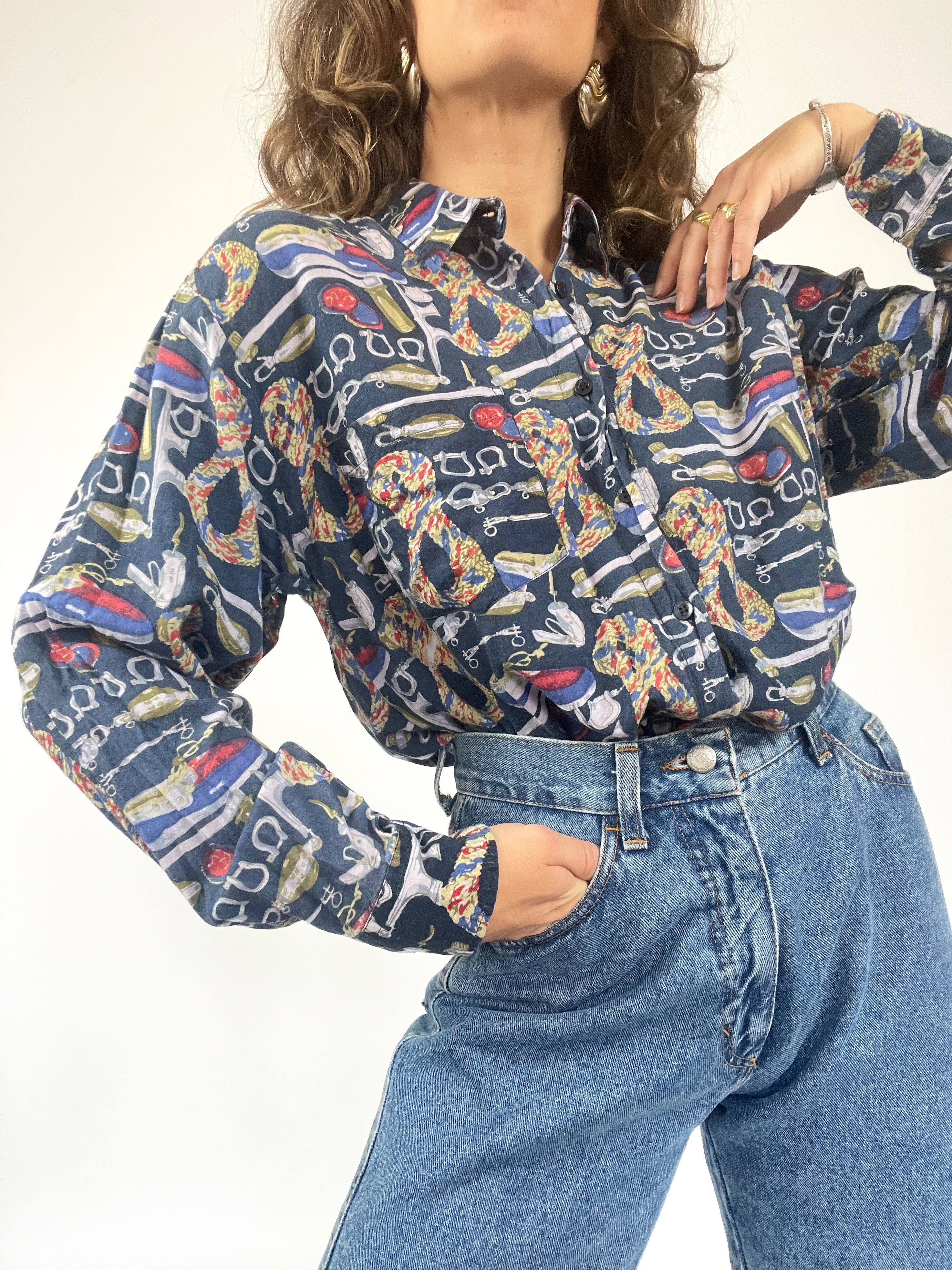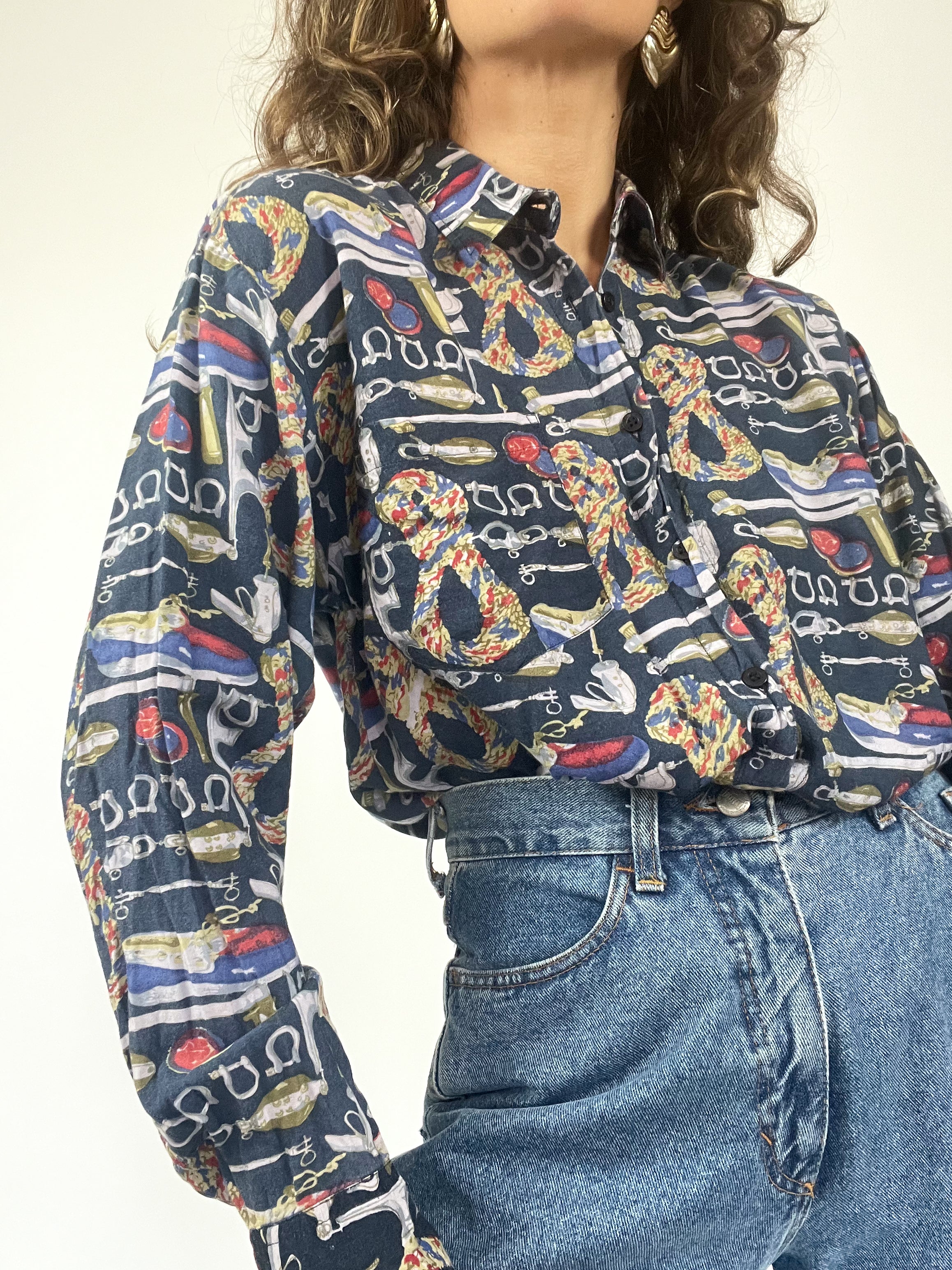 Make a statement with this vintage navy blouse featuring a unique print that blends equestrian motifs and vibrant colors. The button-down design and classic collar add a structured feel, while the lightweight fabric ensures comfort throughout the day. Perfect for adding a touch of playful elegance to your wardrobe.