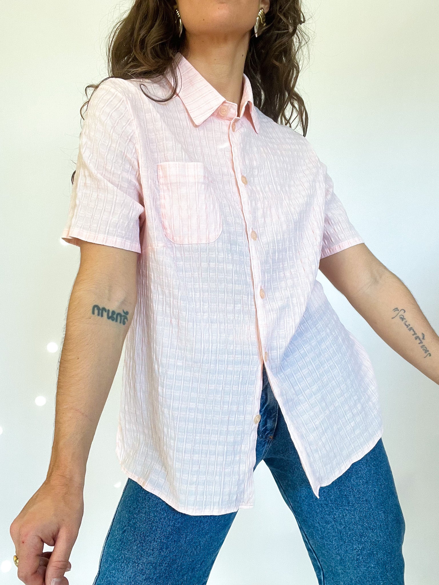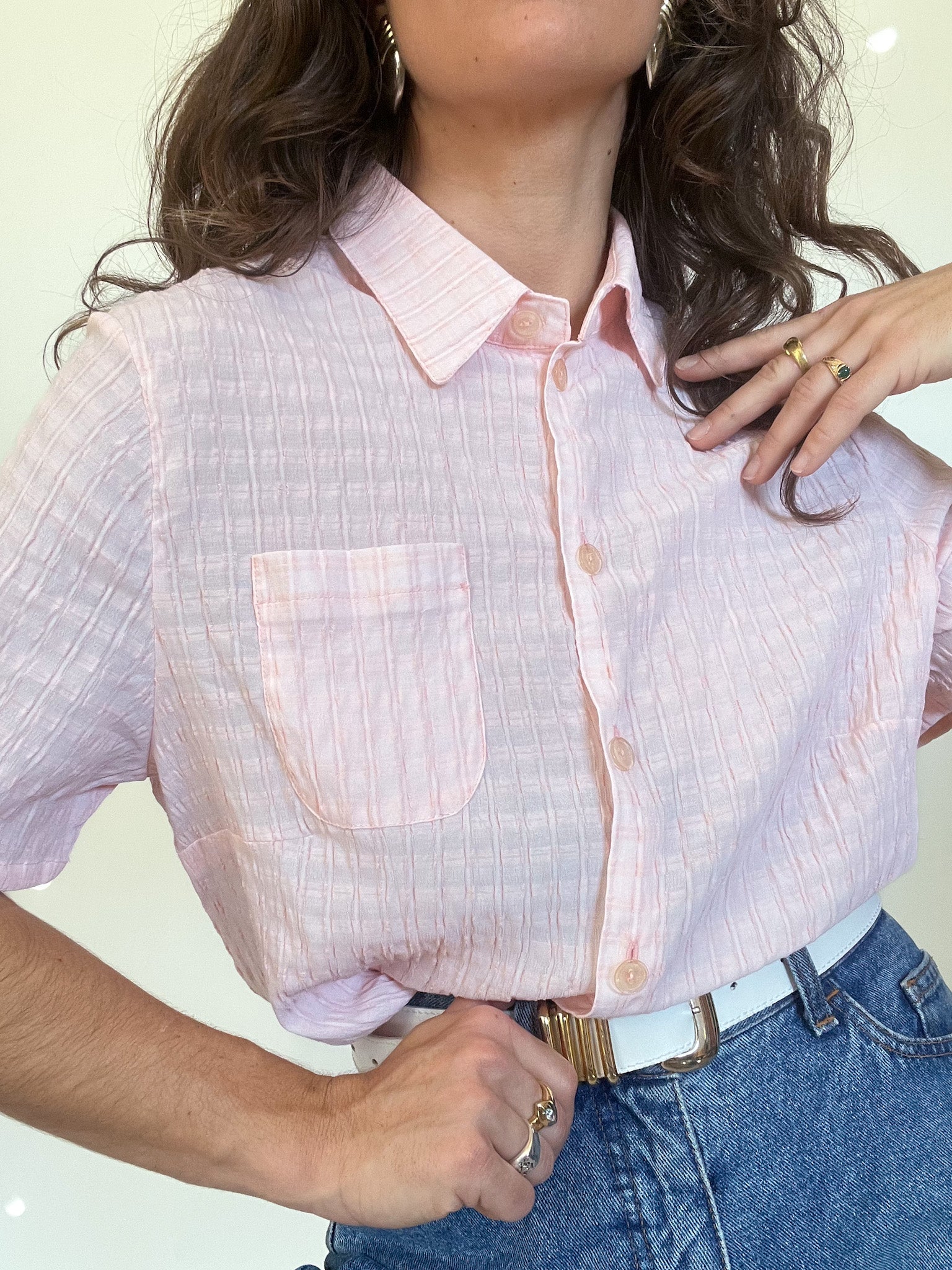 A study in subtle texture, this pale pink shirt features a delicate tone-on-tone grid pattern and a breezy, casual cut. It’s that kind of versatile piece that brings a sense of quiet sophistication, effortlessly transitioning from relaxed to refined.