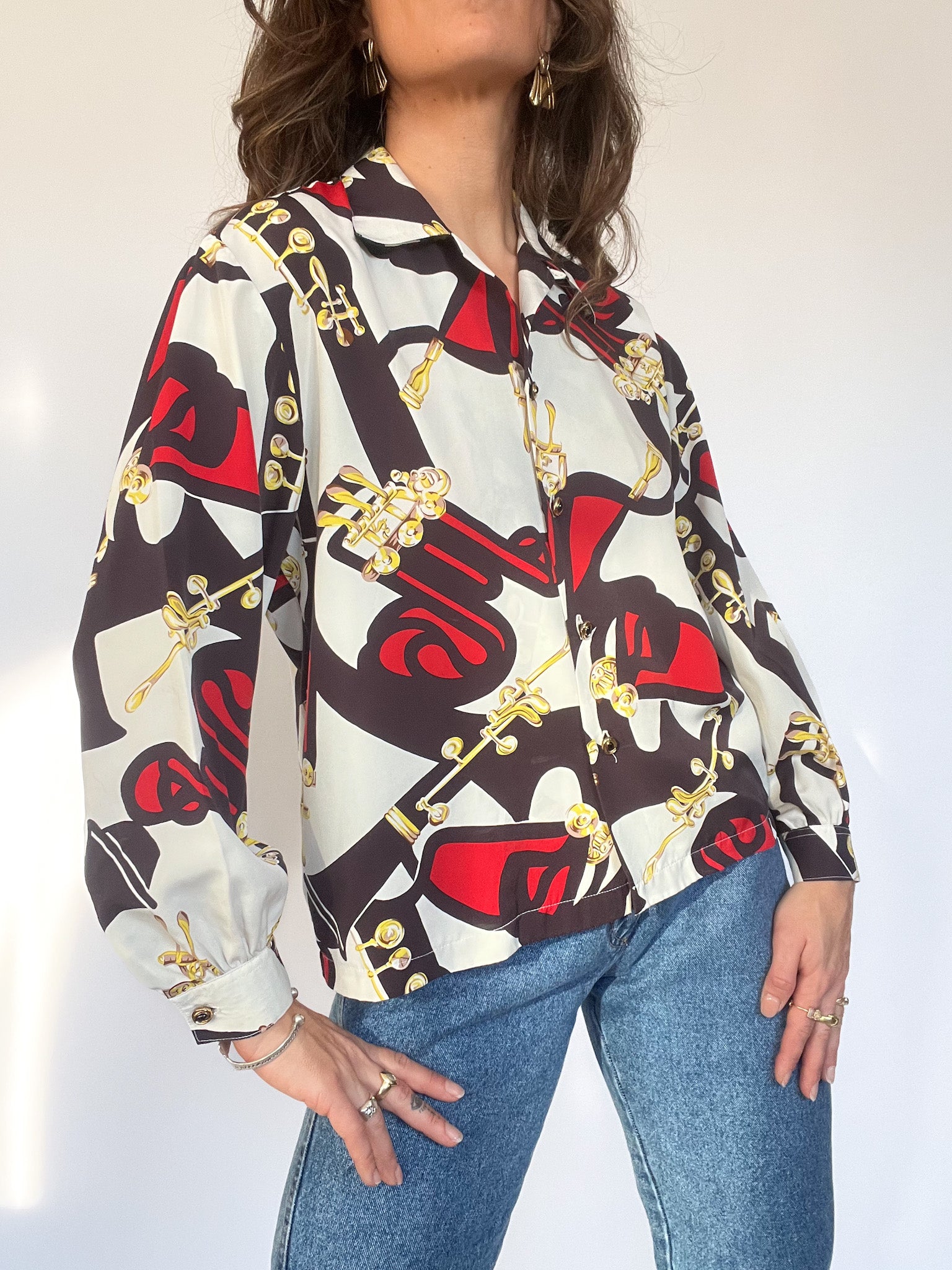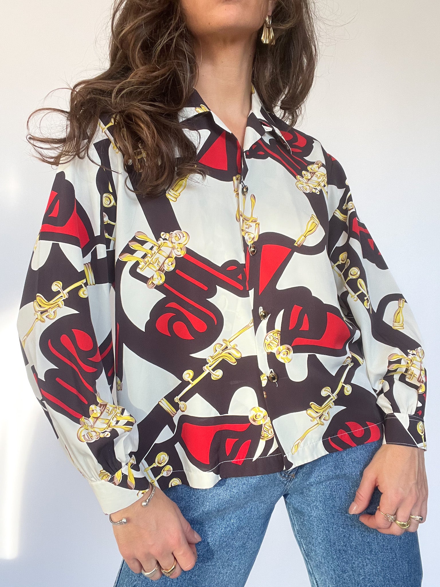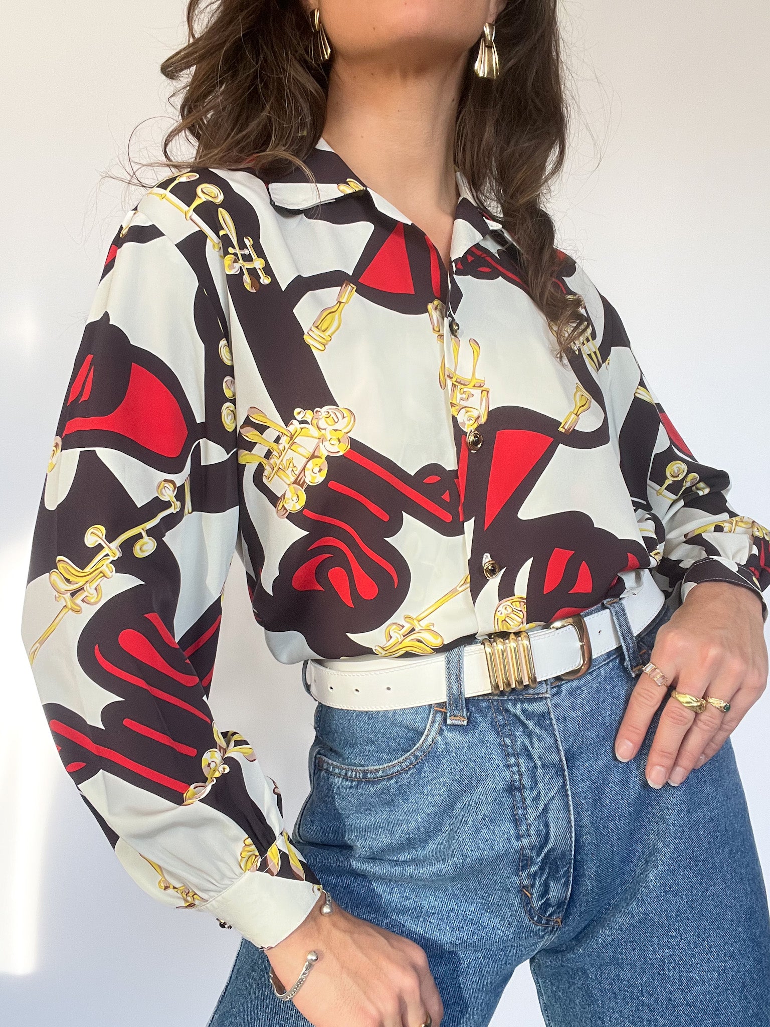 A striking piece with a bold, baroque-inspired print, this vintage shirt is a statement of confidence and timeless style. The intricate design, featuring a mix of graphic shapes, rich red and black hues, and gold detailing, recalls the opulence of vintage Italian fashion. The relaxed cut and fluid drape offer an effortlessly chic silhouette, perfect for both casual wear and elevated styling. Pair it with high-waisted denim for a modern contrast, or tuck it into tailored trousers for a refined, power look.