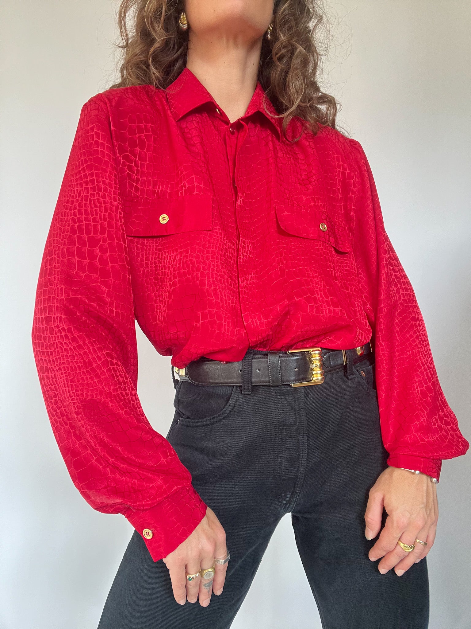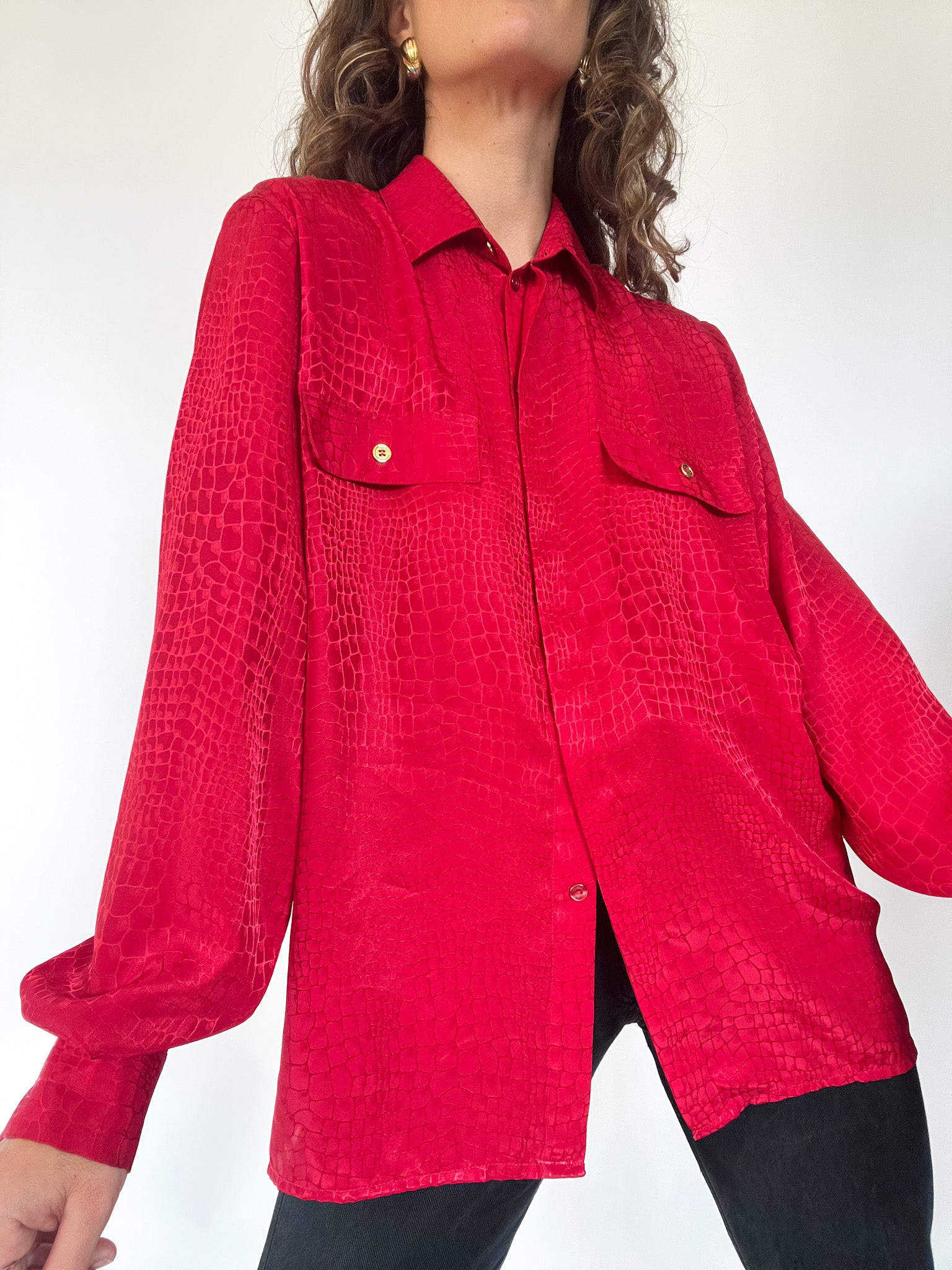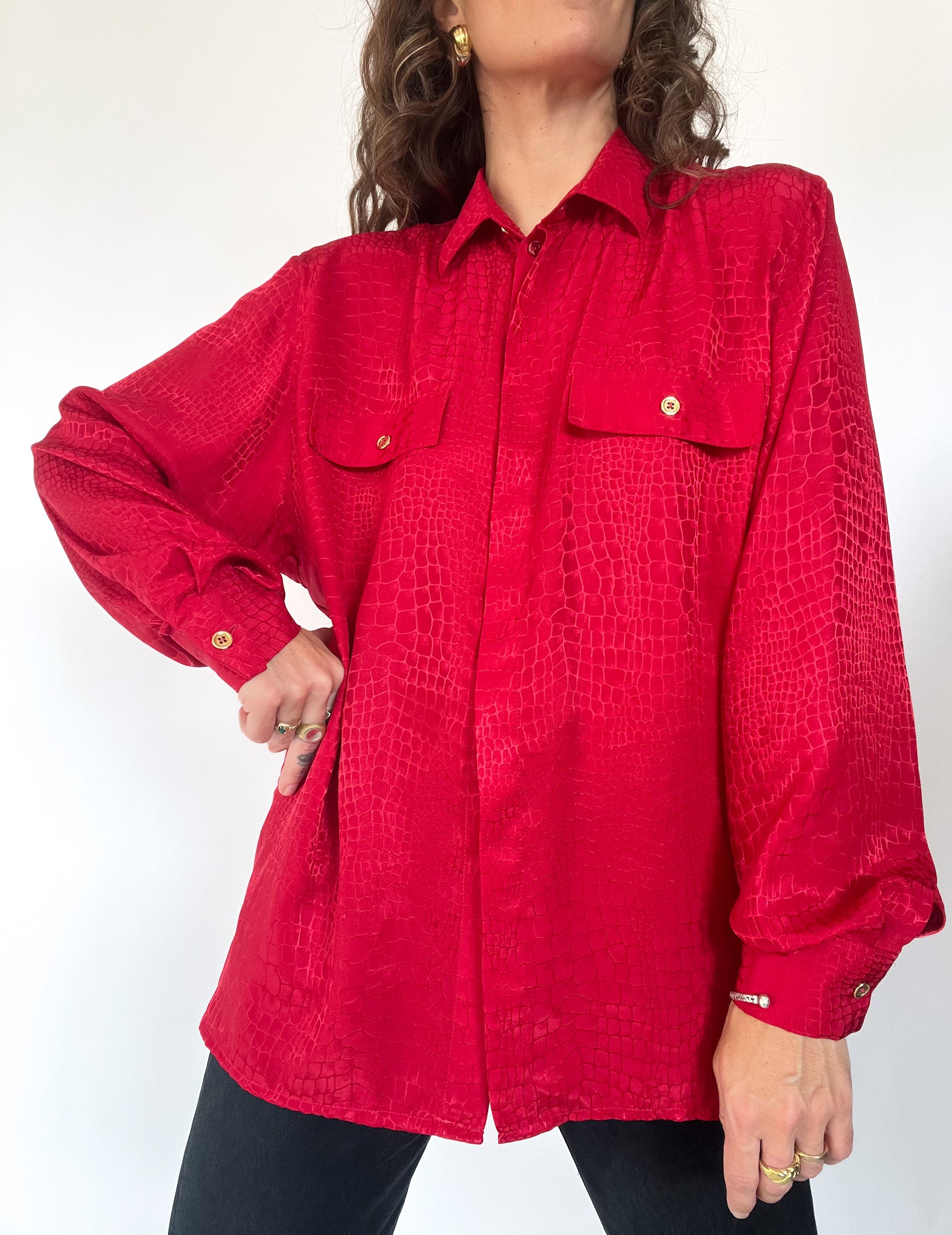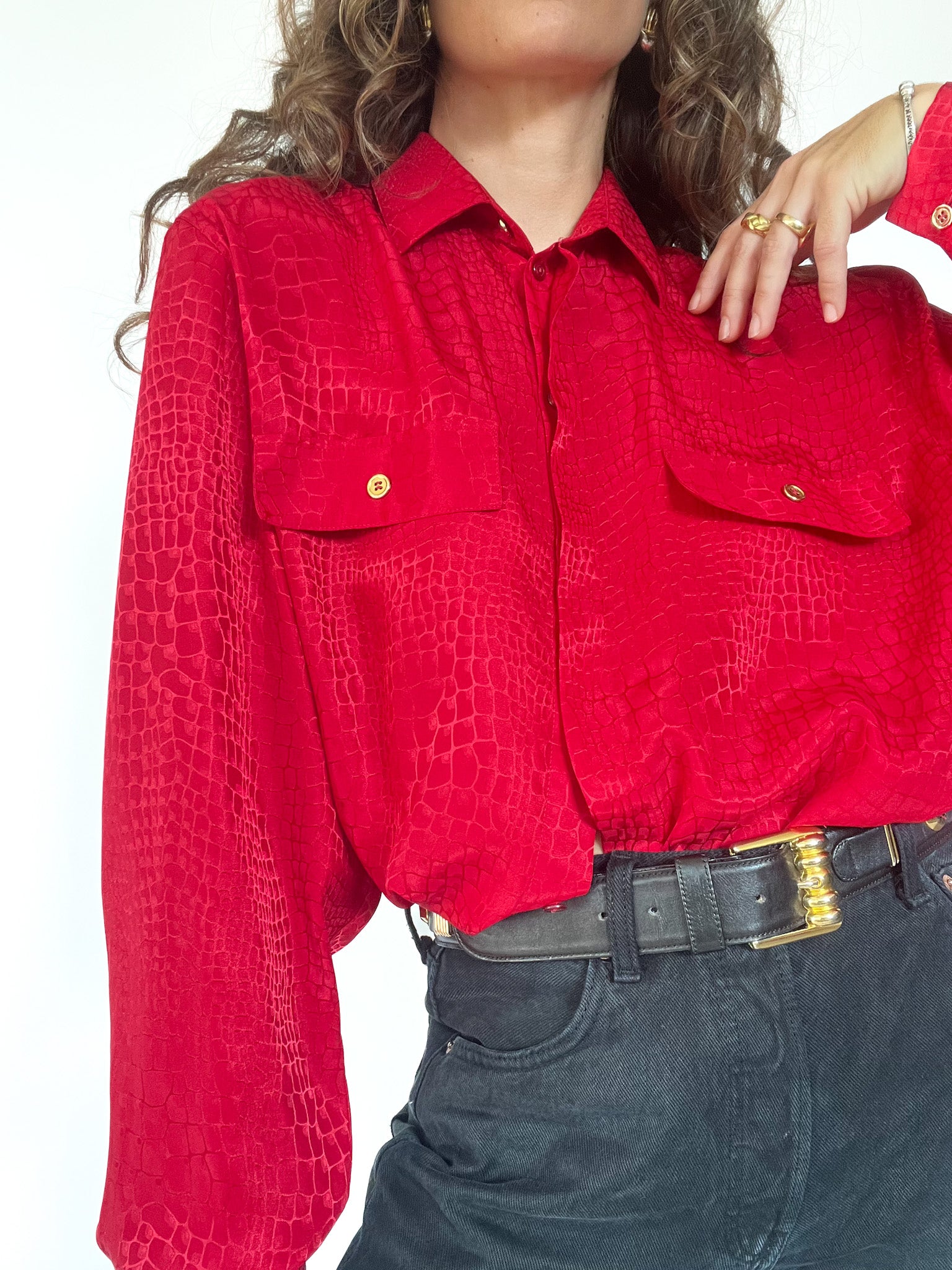 Make a bold statement with this vibrant red vintage shirt SWISS made, featuring a unique crocodile-like texture that adds depth and intrigue to your outfit. Designed with a relaxed fit and double chest pockets, it combines functionality with high-impact style. The gold-tone buttons add a touch of elegance, making it perfect for both casual and dressed-up looks.