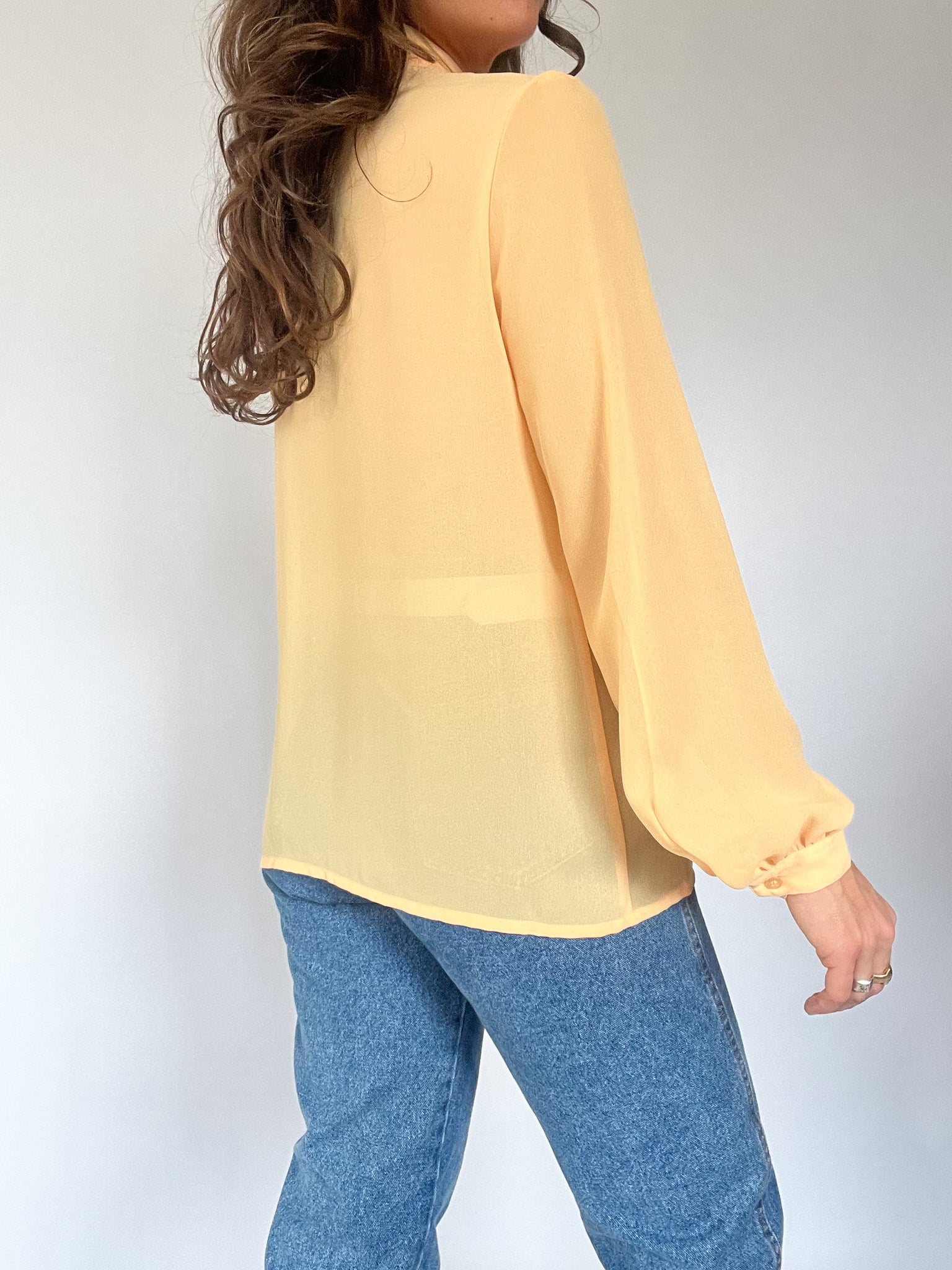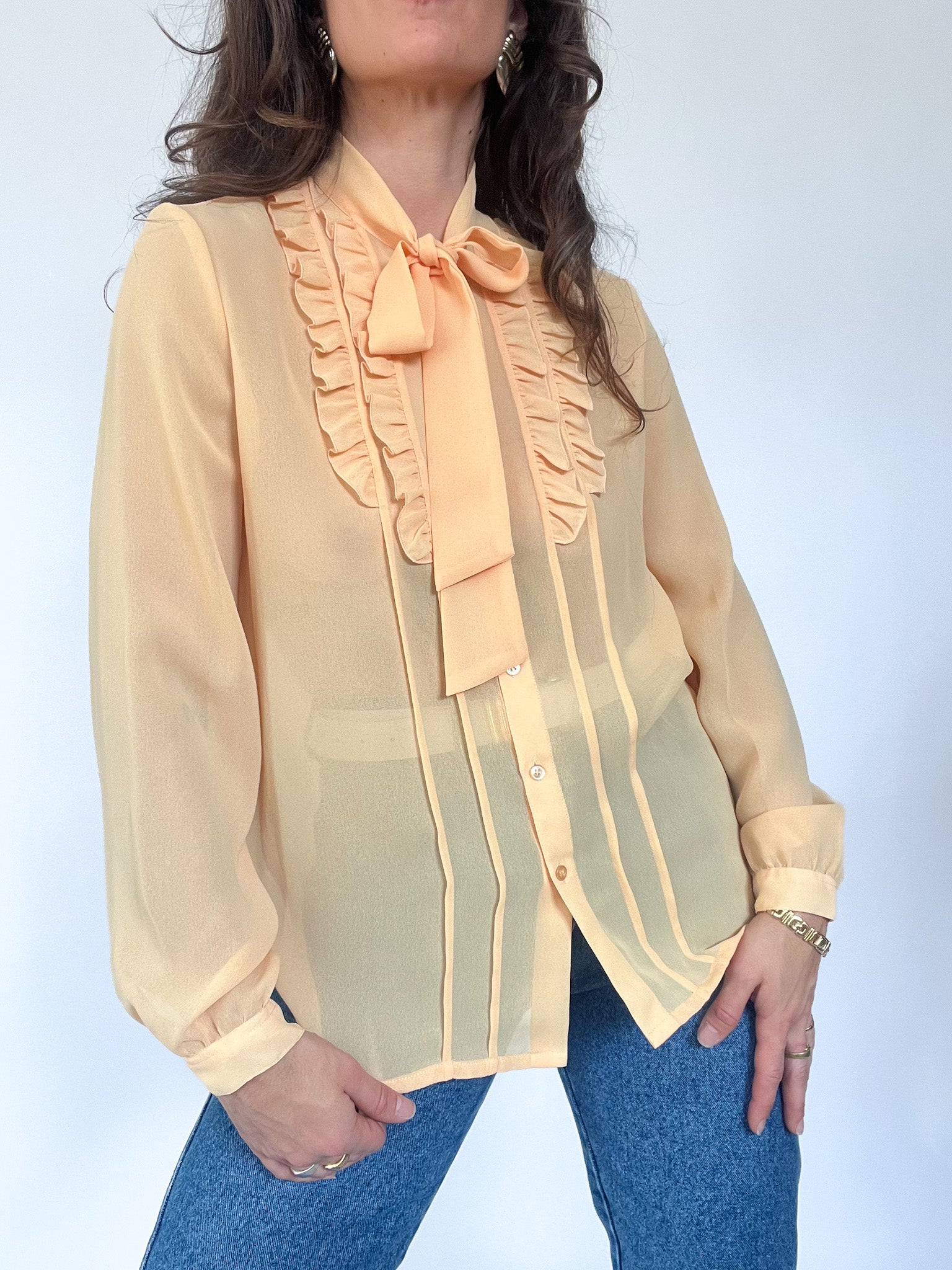 A highly feminine blouse with ruffled details and a bow-tie neckline, perfect for a romantic and refined look. The soft powder peach shade adds a delicate charm.