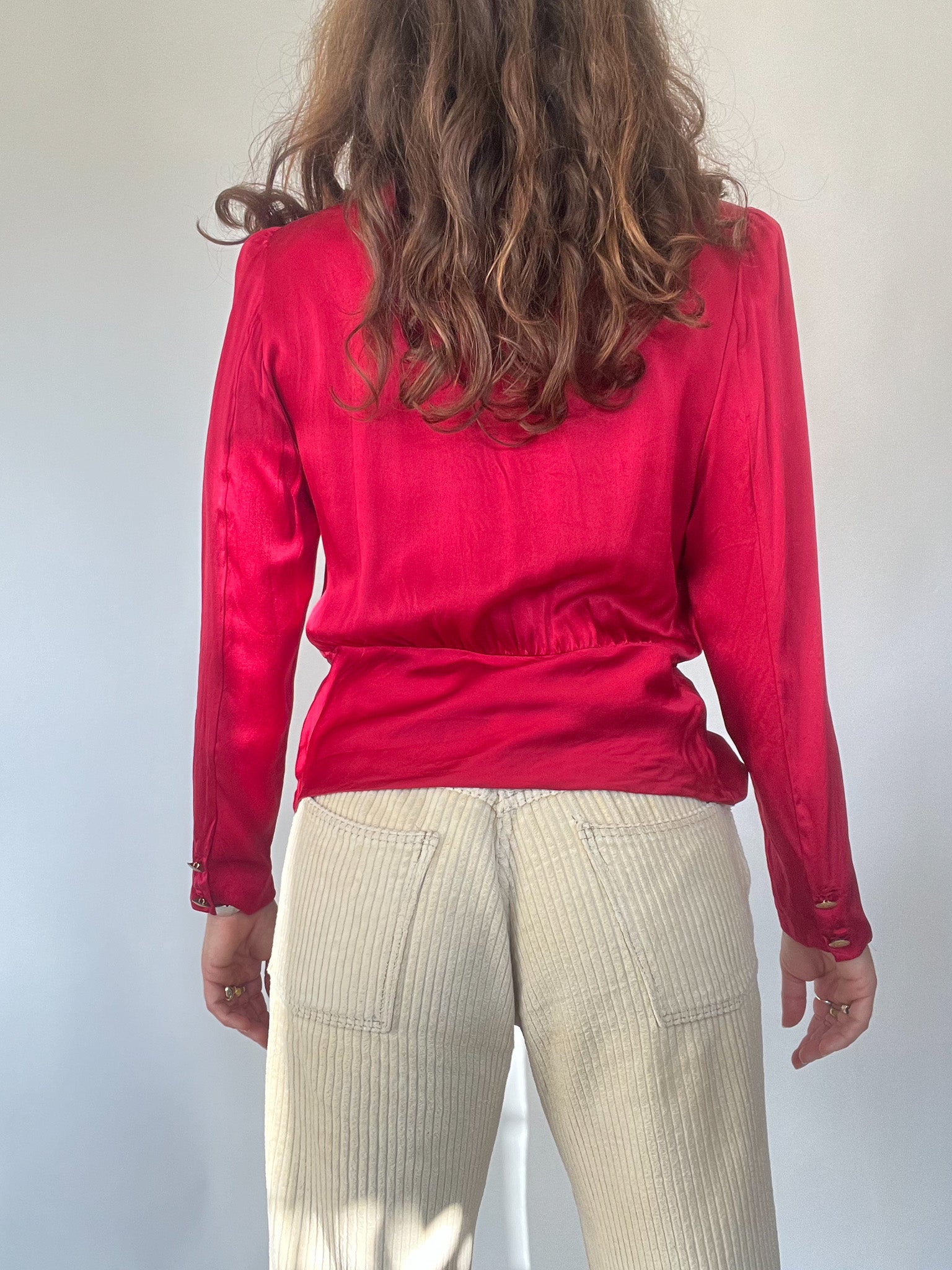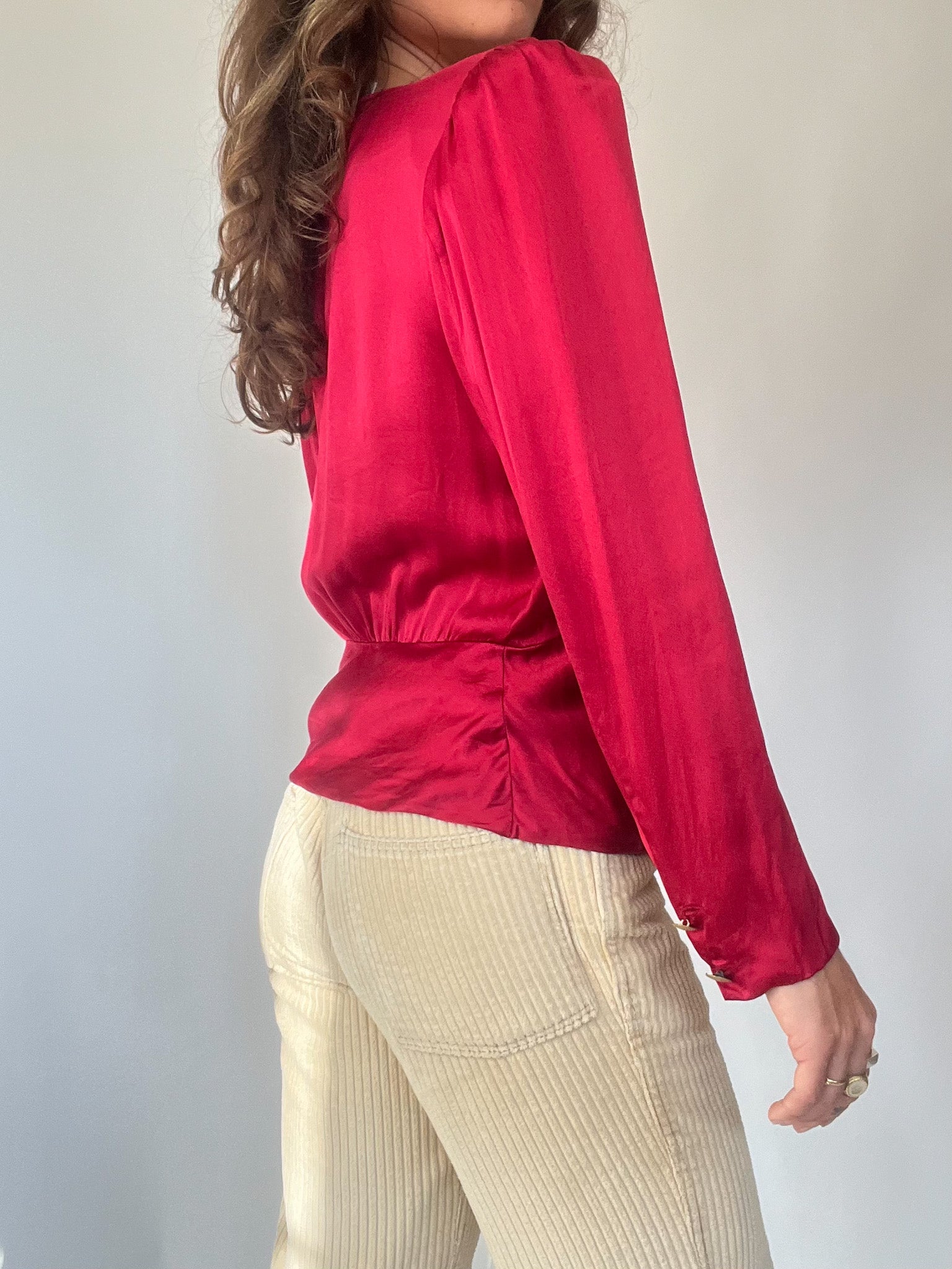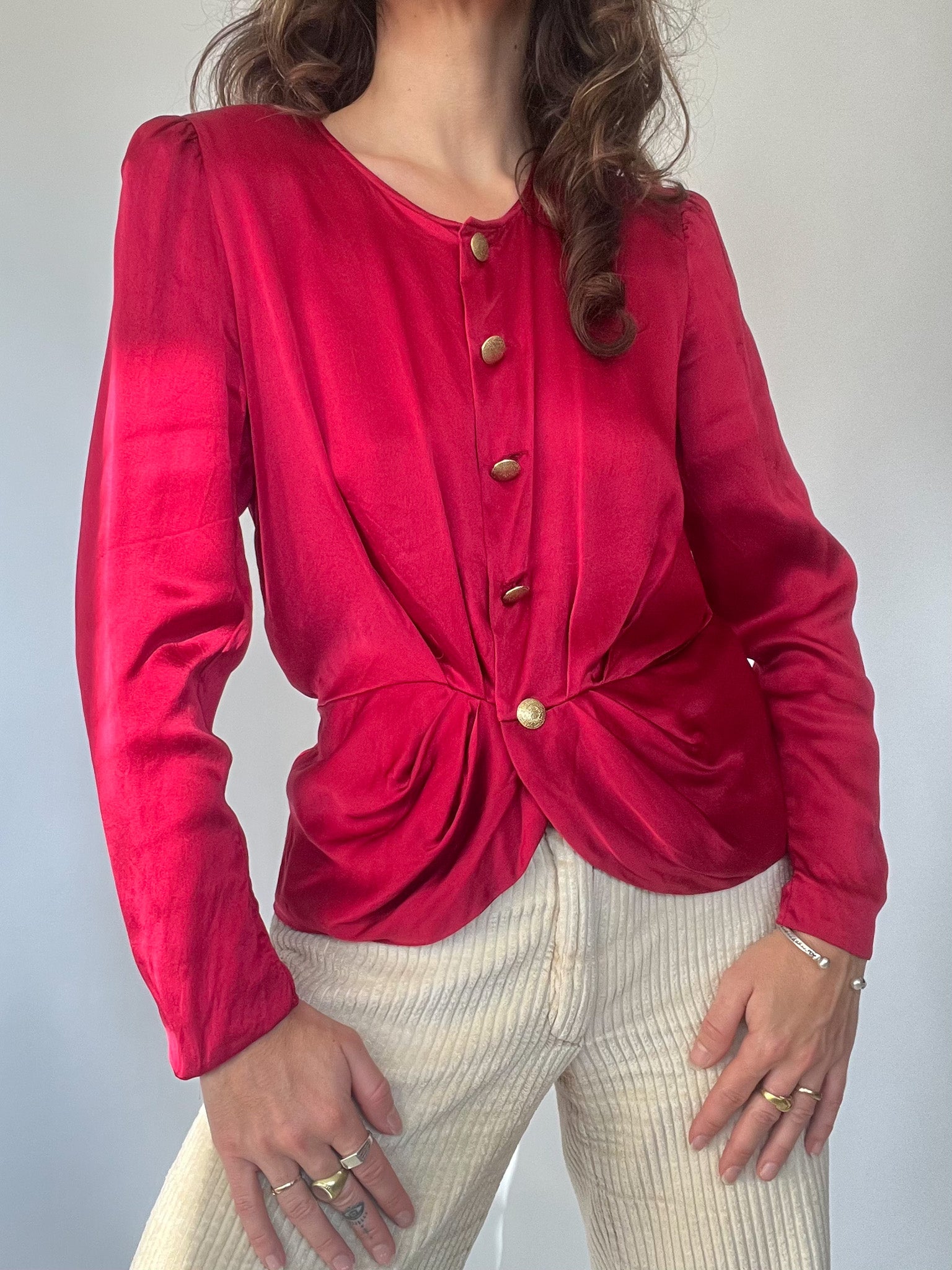 Add a touch of elegance to your wardrobe with this vintage silk satin blouse in a striking red hue made in Italy. Featuring a unique gathered waist design and gold-tone buttons, this piece exudes sophistication and timeless charm. The structured shoulders and silky fabric give it a refined silhouette, perfect for dressing up or down.