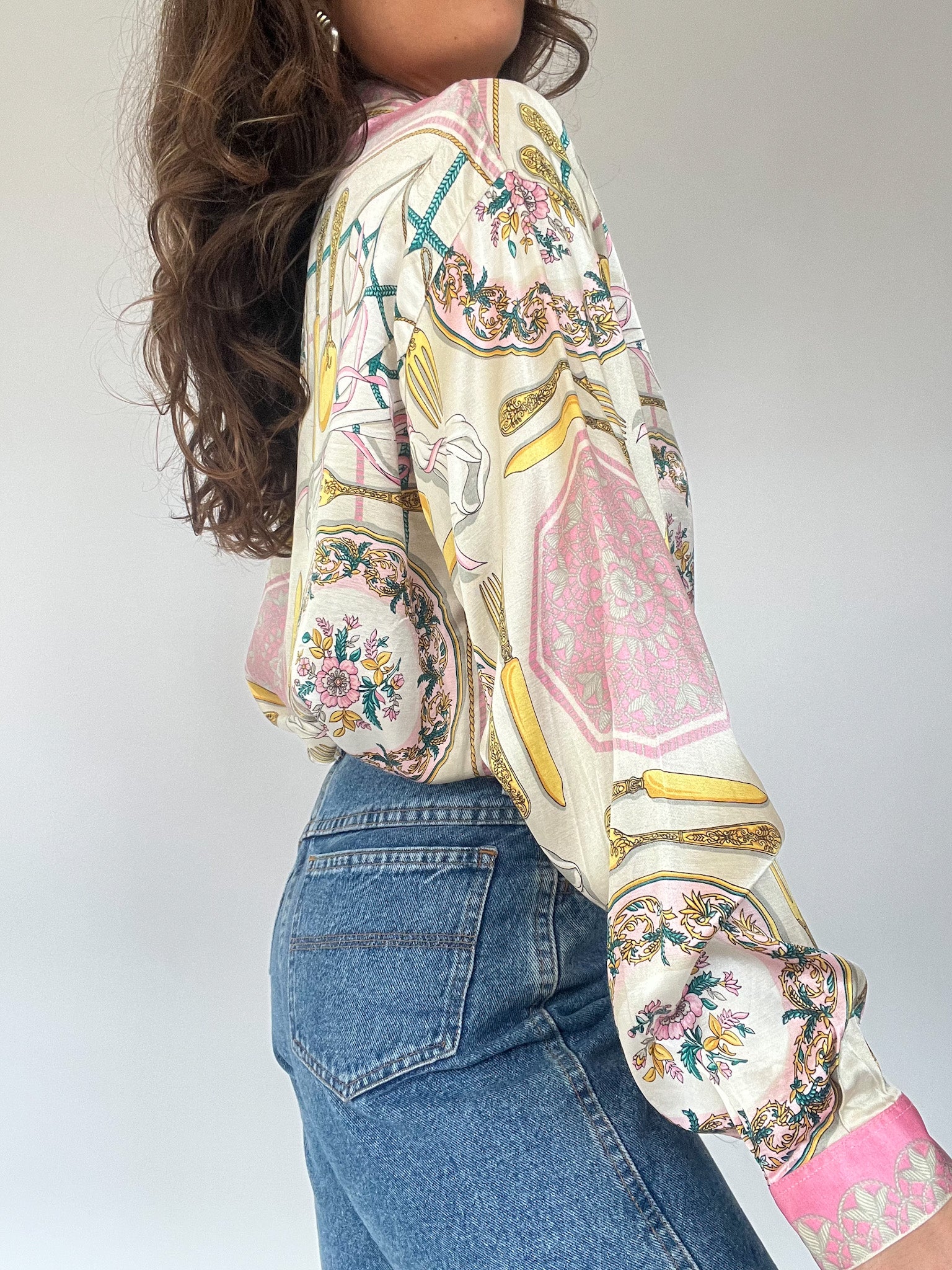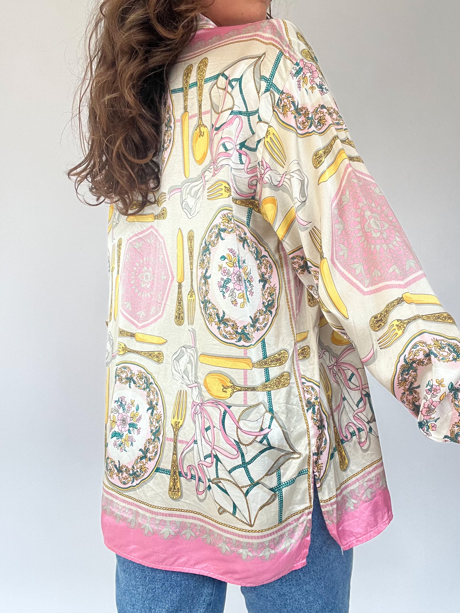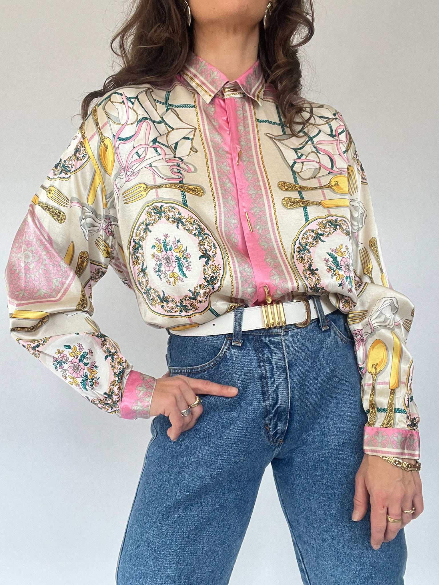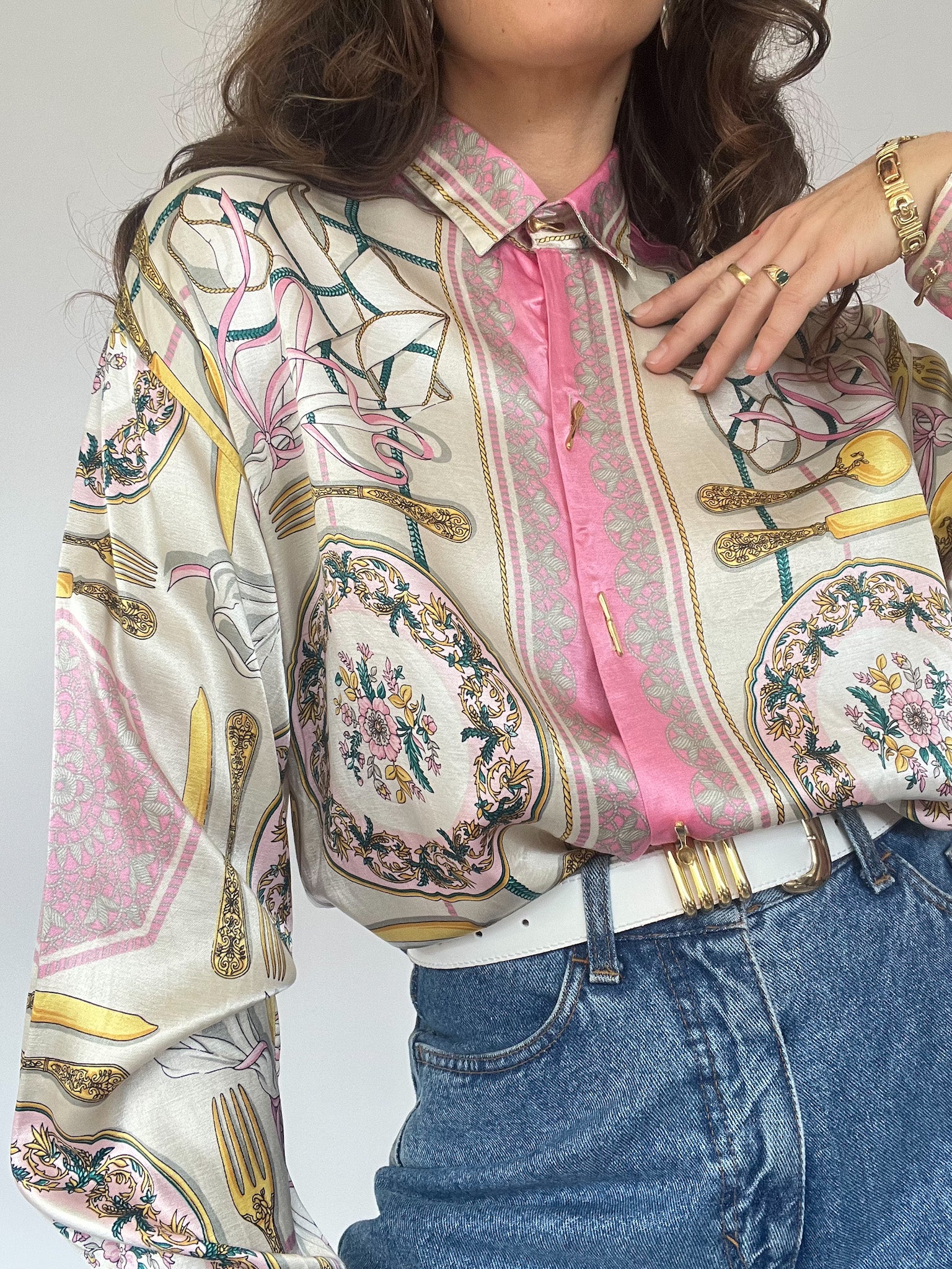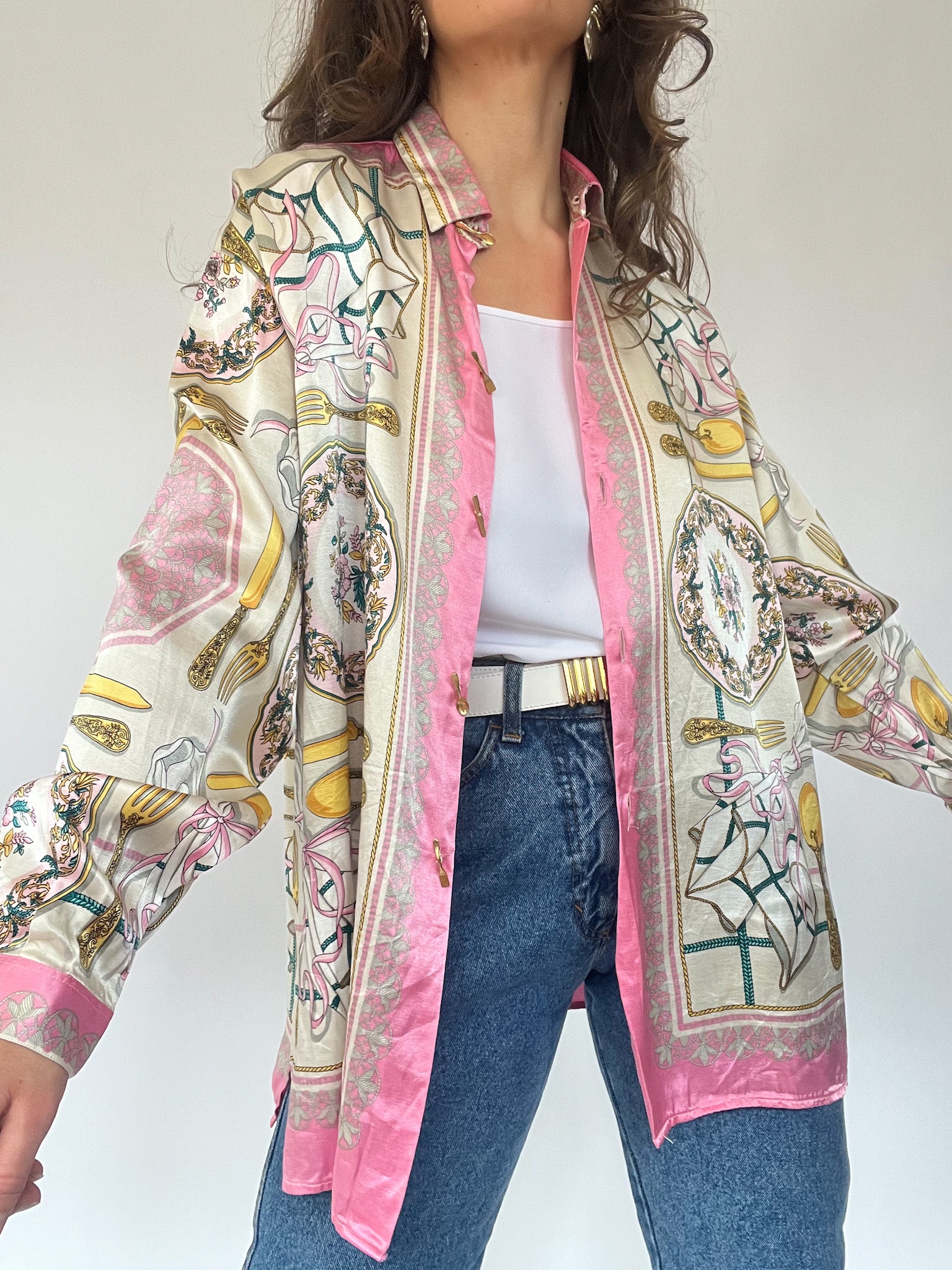 A striking vintage satin-print shirt, inspired by the elegance of European tableware. With its luxurious sheen and intricate print, this piece embodies timeless sophistication with a touch of playfulness. Wear it buttoned-up for a refined silhouette or open over a tank top for effortless styling.