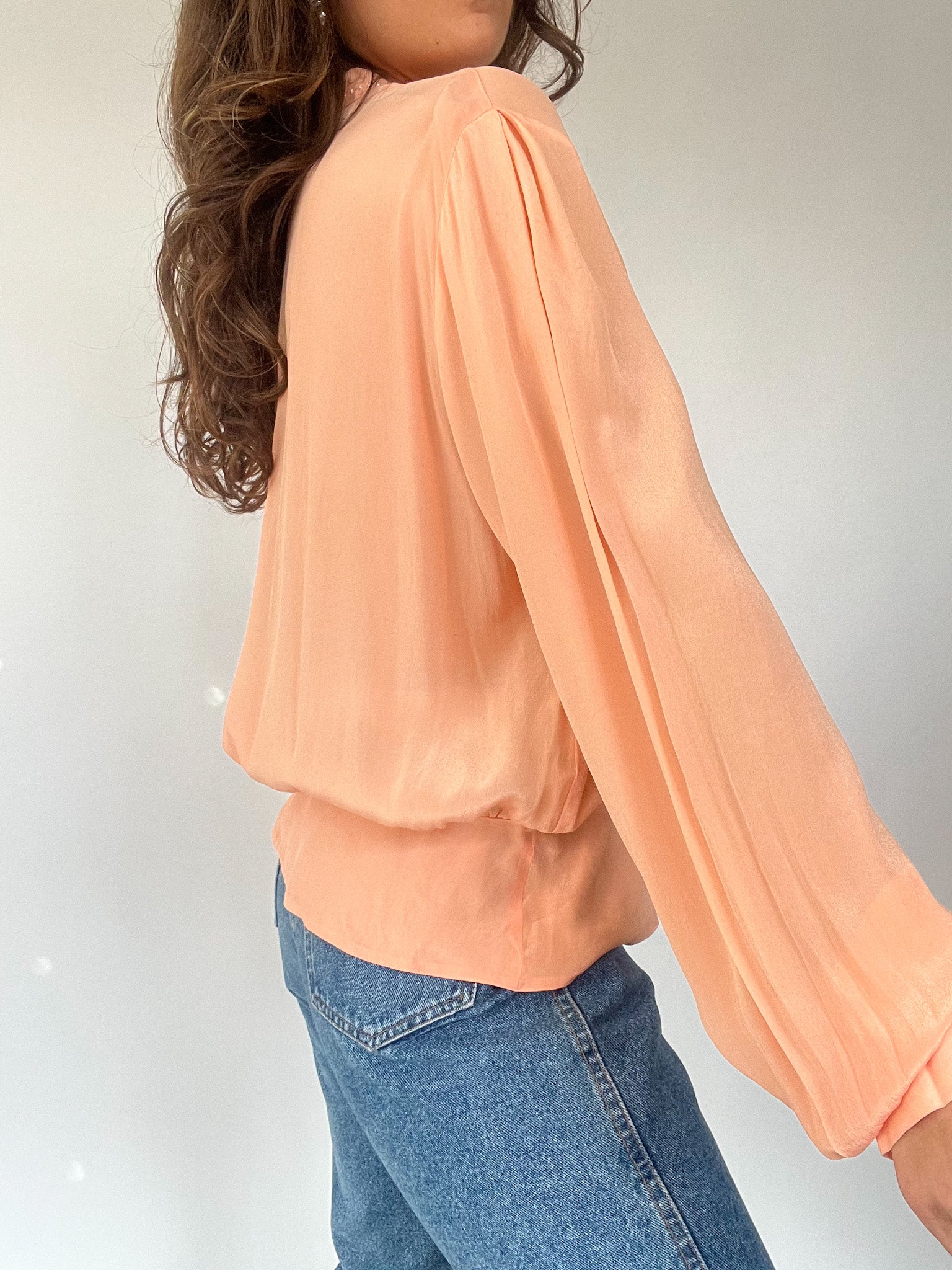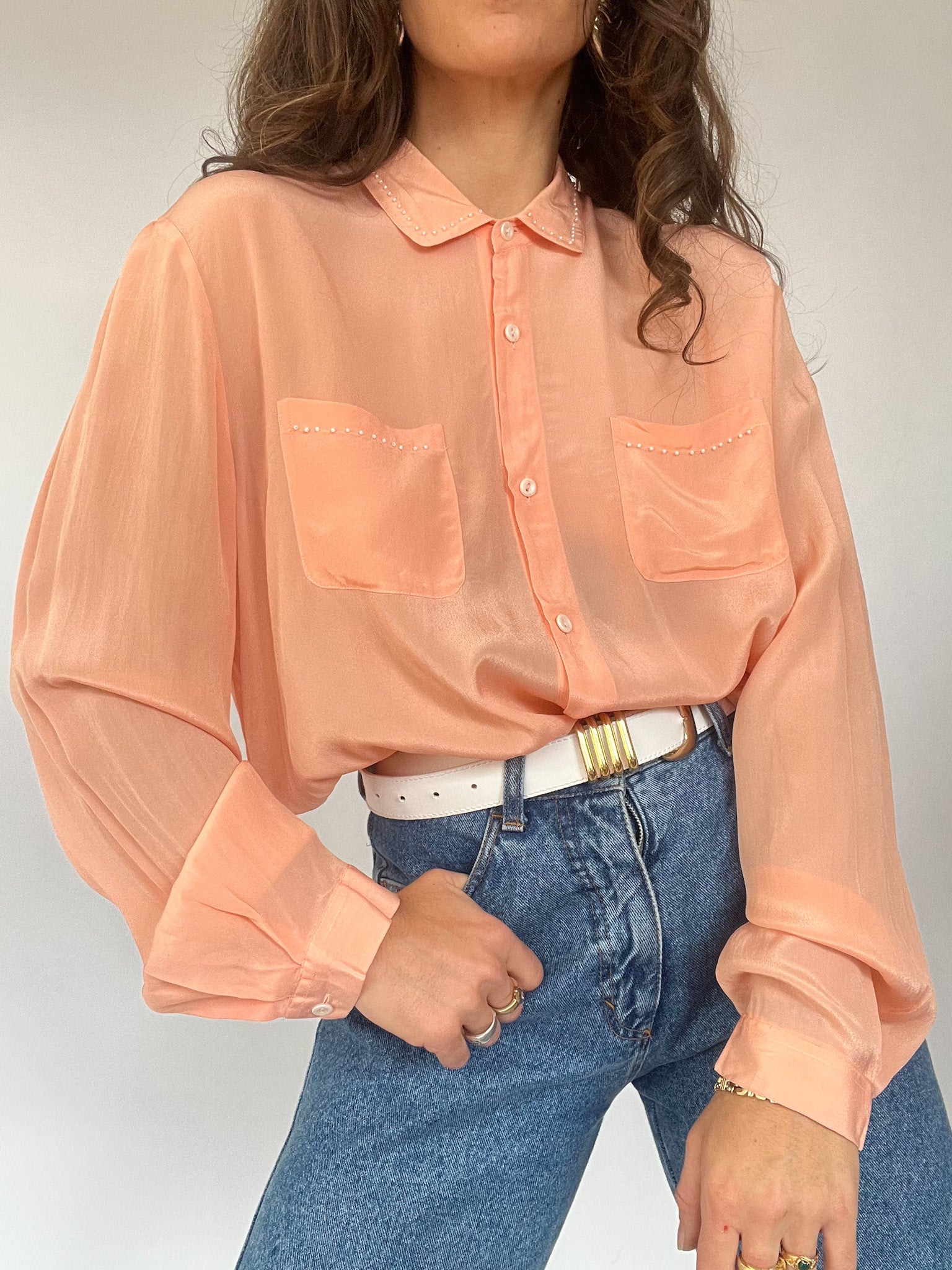 An airy and fluid blouse in a soft peach shade, embellished with delicate pearl details on the collar and pockets. Its loose fit and lightweight fabric make it the perfect piece for an effortlessly chic silhouette.