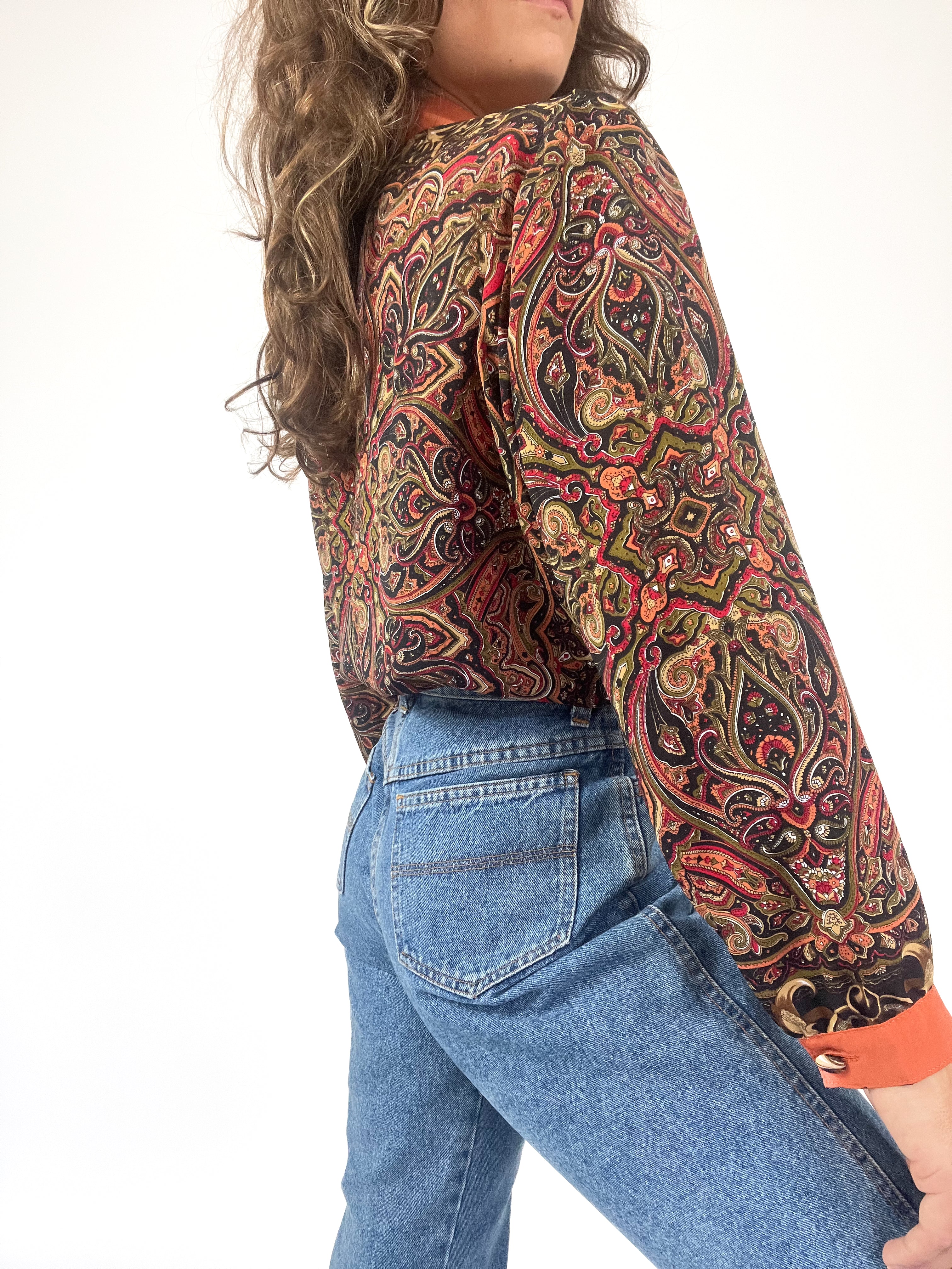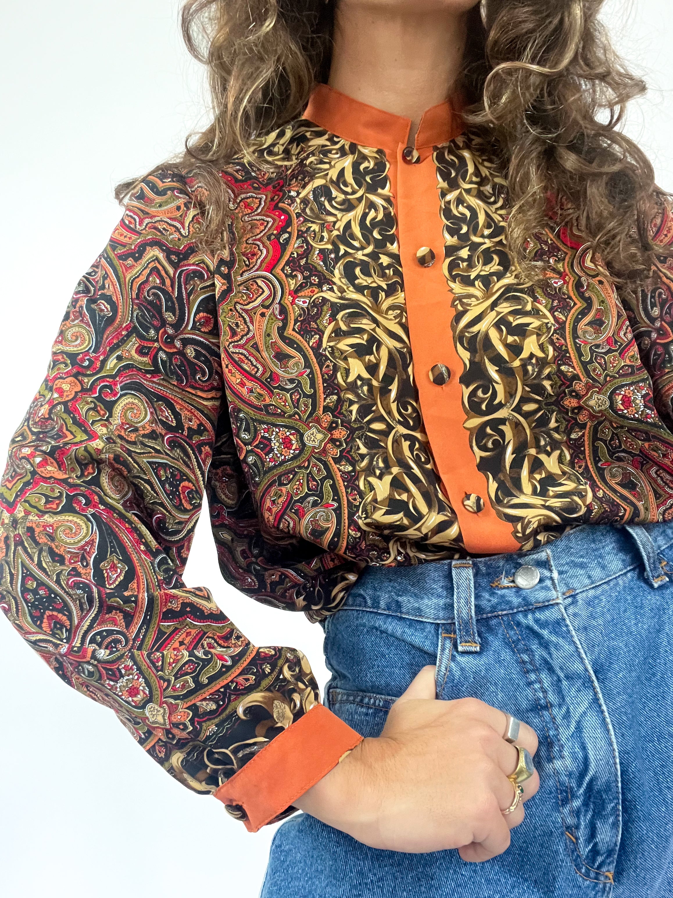 Elevate your wardrobe with this vibrant vintage K. Mani blouse featuring an intricate paisley and baroque-inspired print in rich hues of black, red, and gold. The contrast orange trim along the collar and front adds a unique touch, making this piece a standout choice. With its lightweight fabric and eye-catching design, this blouse is perfect for any retro-inspired look.