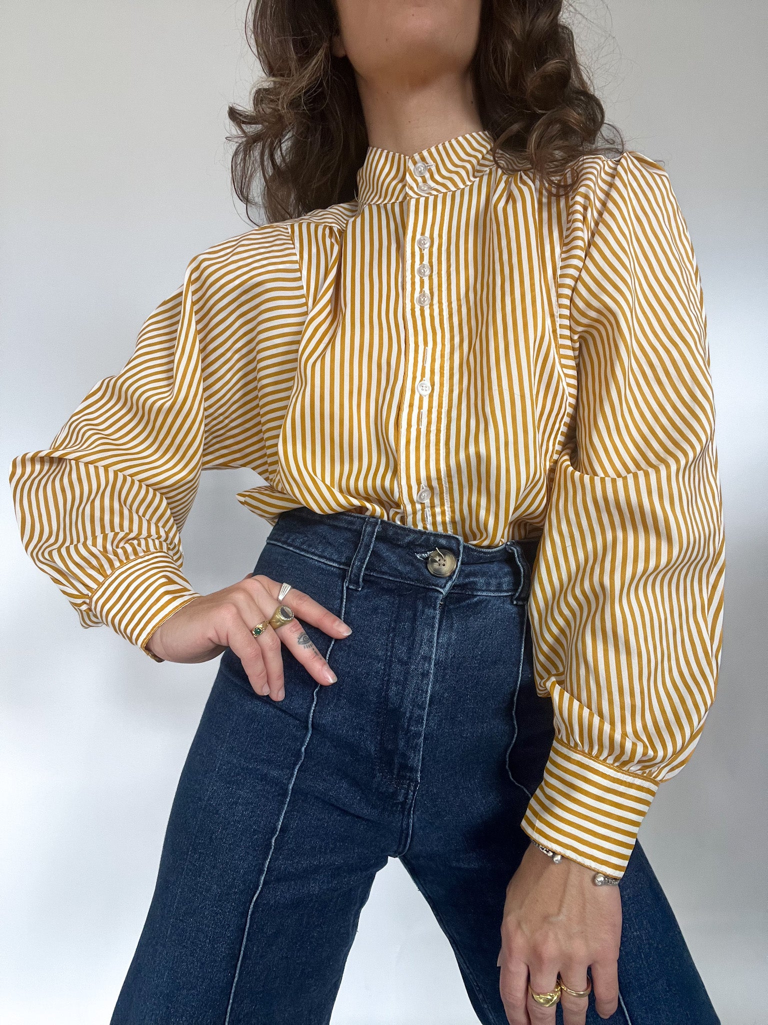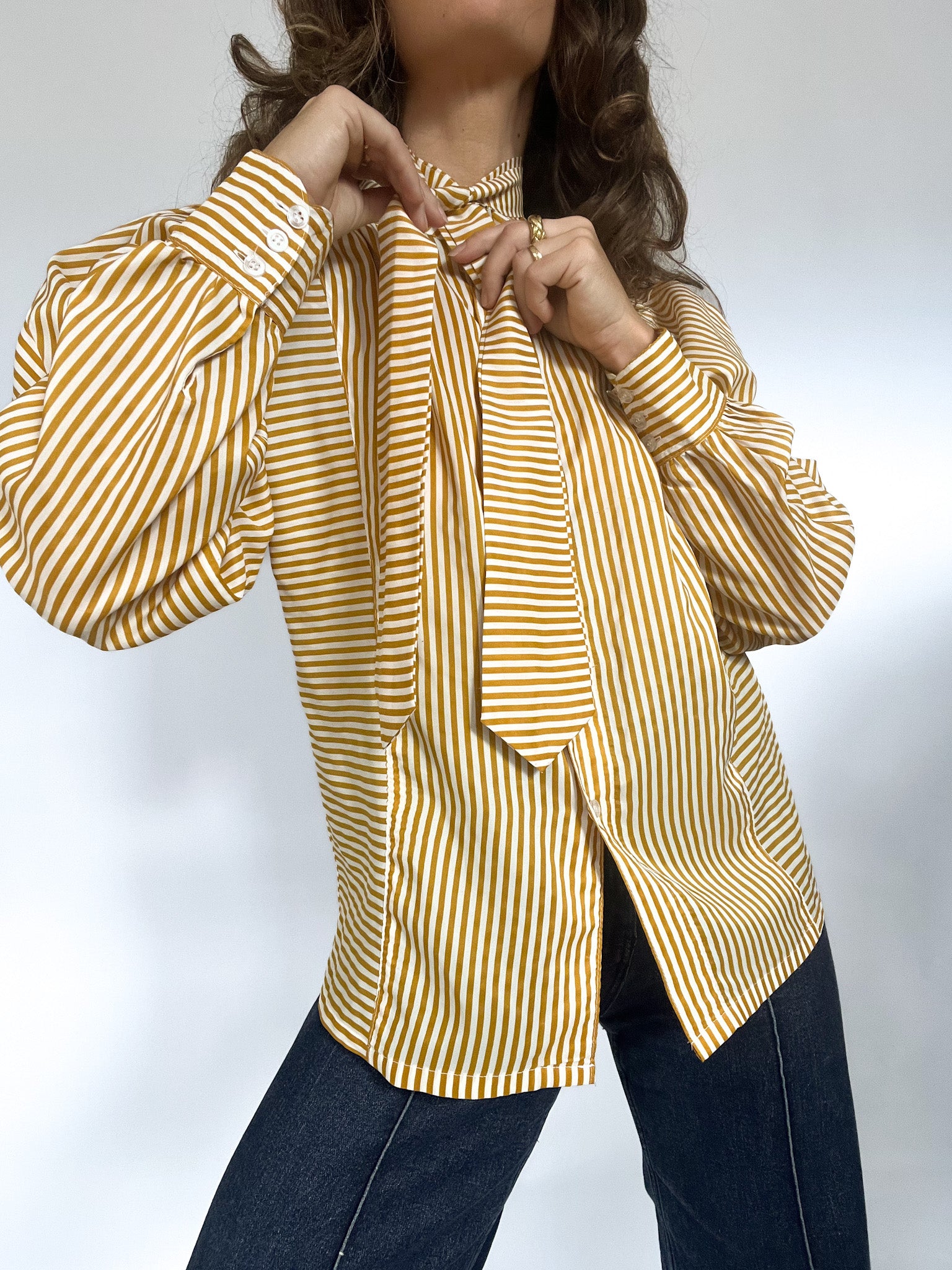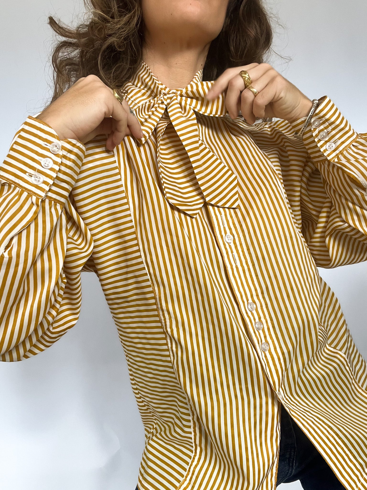 Add a touch of elegance to your wardrobe with this mustard and white striped button-up shirt. Featuring a high neckline with a detachable bow tie for versatile styling, it balances bold and feminine elements seamlessly. The voluminous sleeves and gathered cuffs bring a structured yet playful silhouette, while its lightweight fabric ensures comfort throughout the