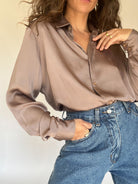 This taupe satin shirt embodies understated elegance. Its soft and fluid texture adds a sophisticated touch to any outfit. Perfect for a refined office look or a casual yet chic weekend style. Pair it with jeans for a modern contrast or with a skirt for a more classic look. A timeless piece to have in your wardrobe!
