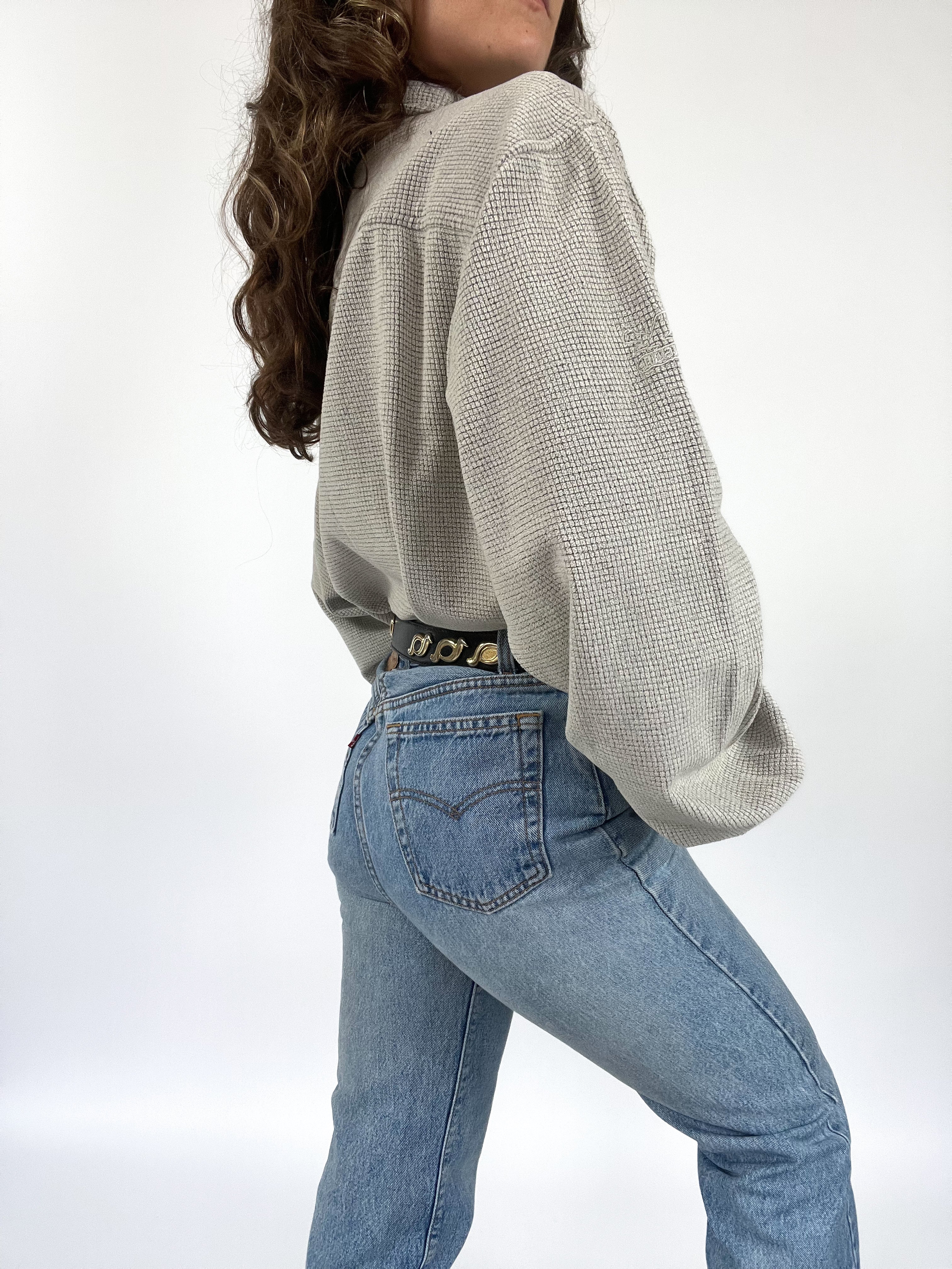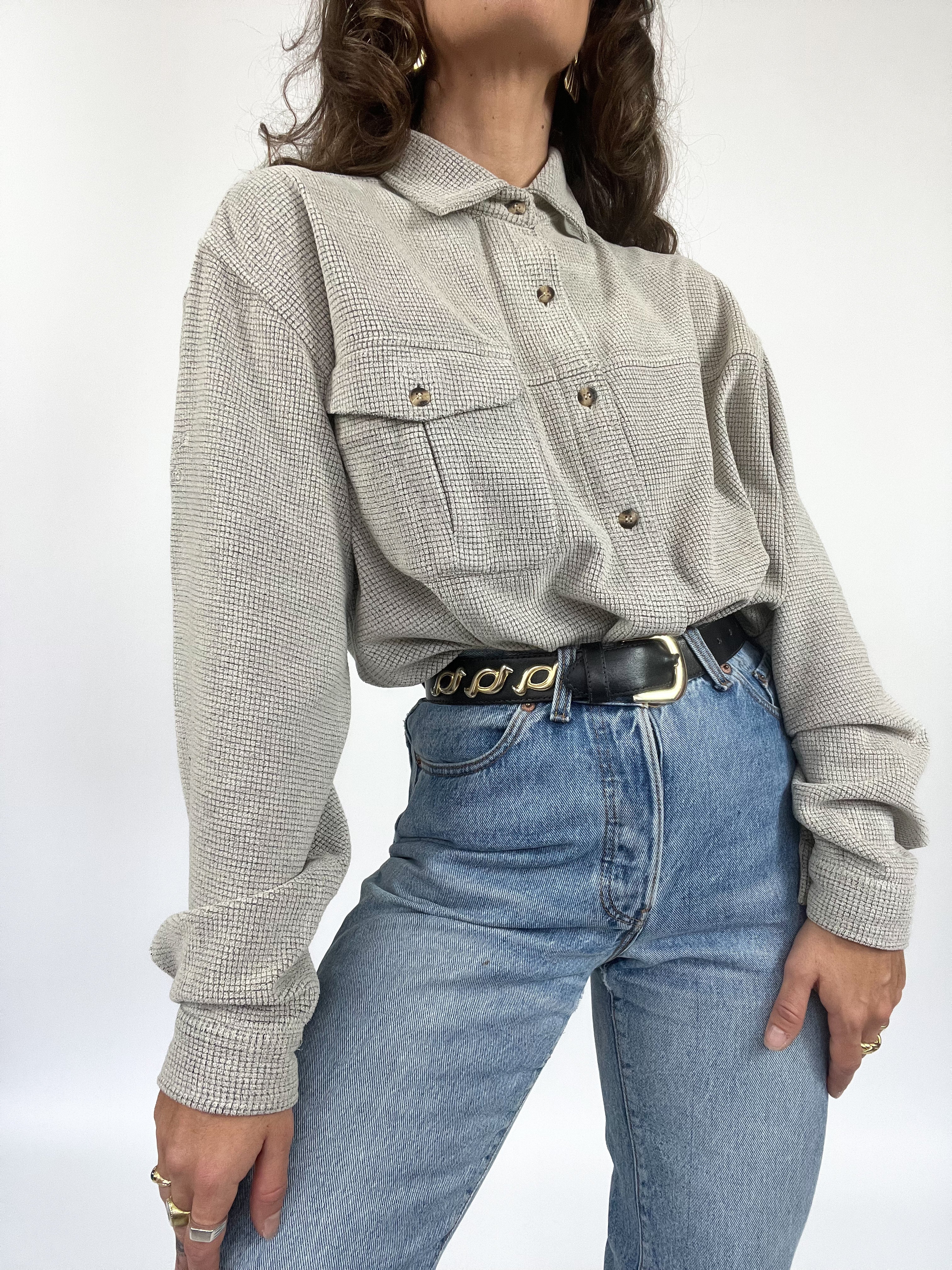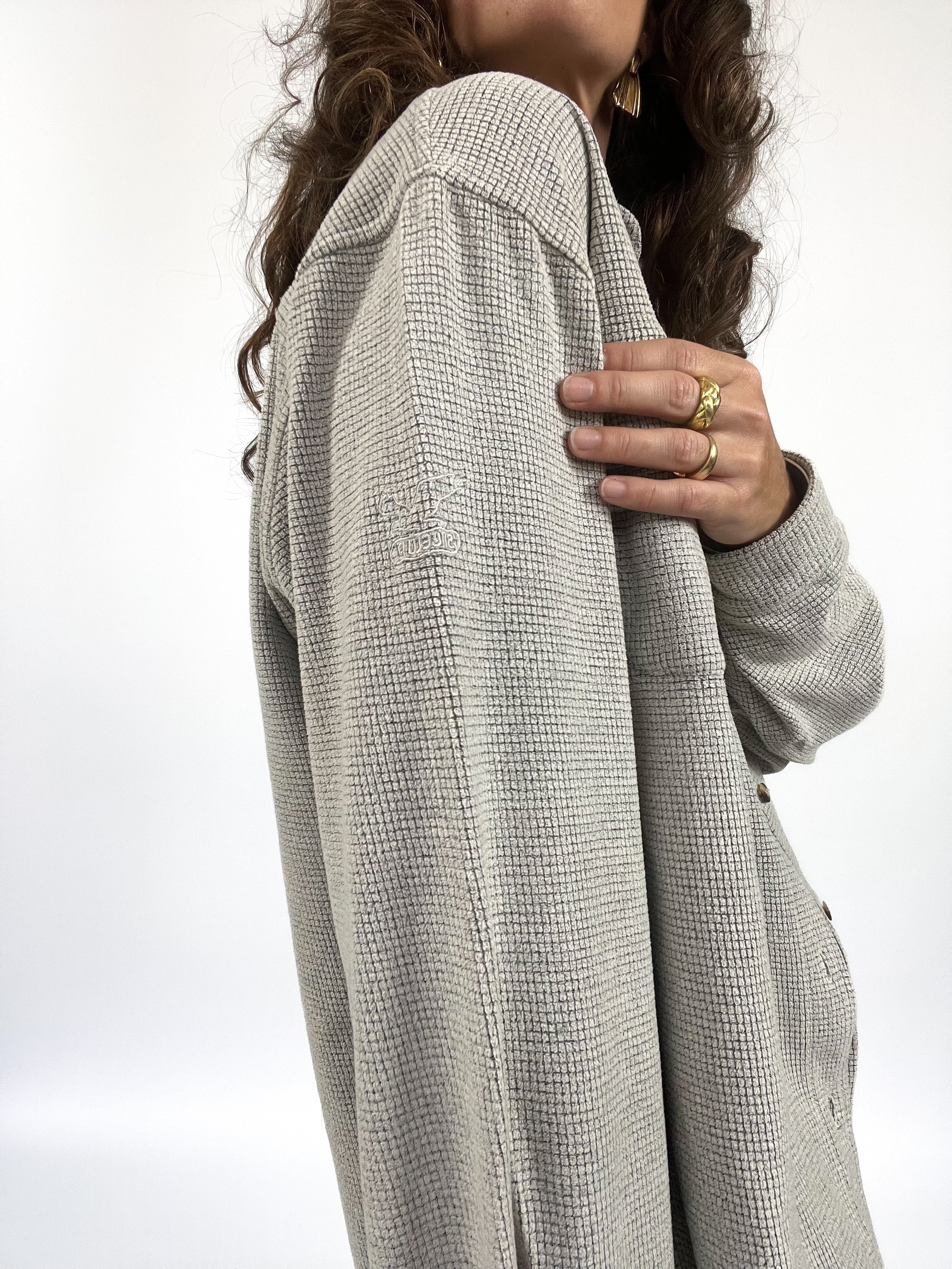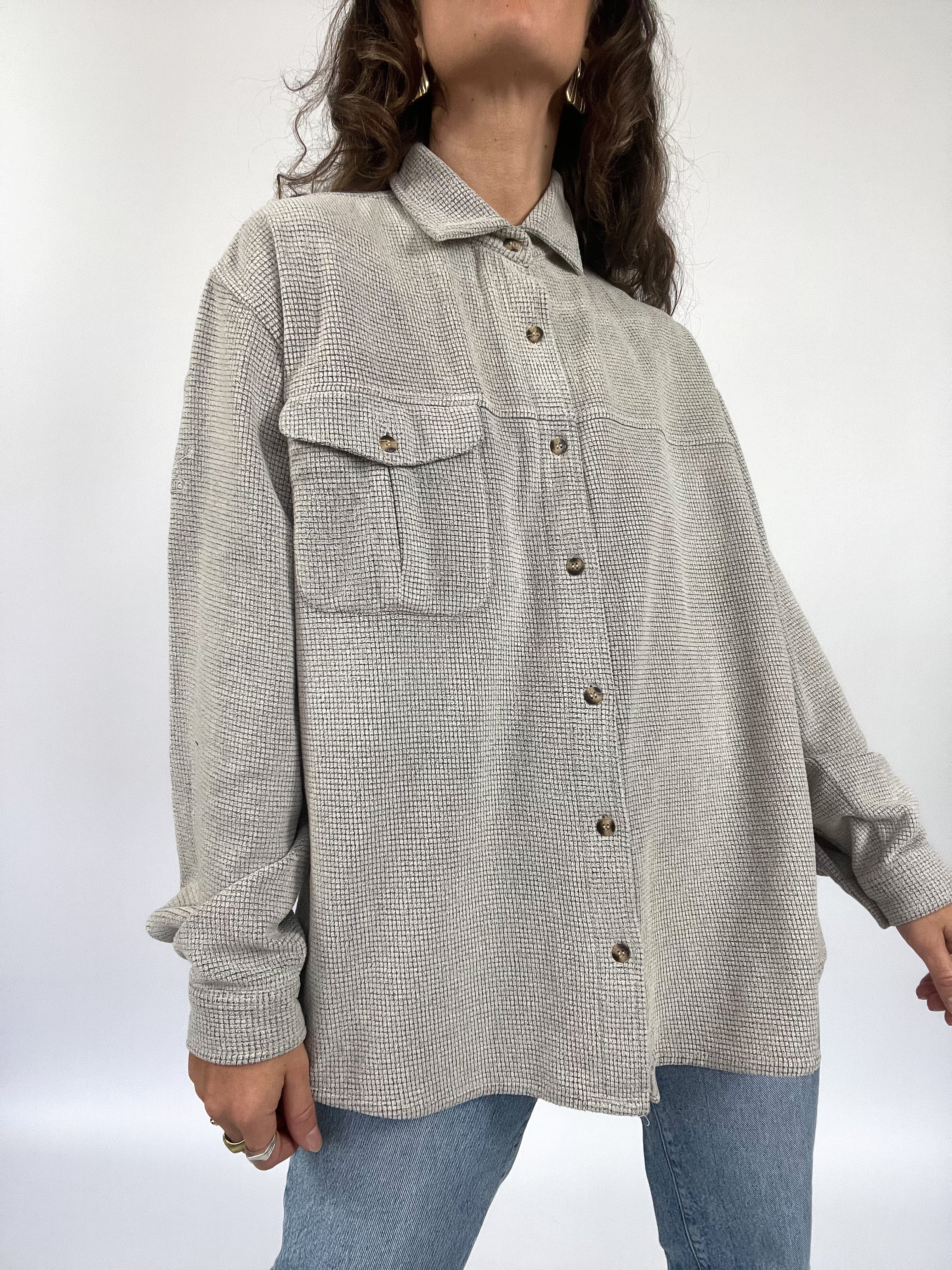 This vintage oversized shirt, in a subtle neutral tone, features a delicate textured pattern that adds dimension to its minimalist design. Complete with a single front pocket and button-up closure, this piece effortlessly blends comfort and style. The shirt’s relaxed fit makes it a versatile layering option or a standout piece when worn on its own.