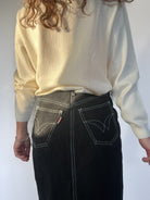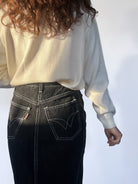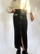 This vintage black denim skirt is the perfect blend of classic style and edgy details. Featuring contrast stitching and a front button-up closure, it brings a unique twist to your wardrobe essentials. The high-waisted design and structured fit offer a flattering silhouette, while the front slit adds ease of movement and a hint of sophistication. Pair it with your favorite sweater or blouse for a timeless look with a modern edge.