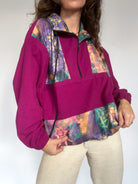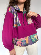 A statement piece that embodies everything bold and carefree about 90s fashion. This magenta fleece made in Italy, features vibrant abstract panels in shades of purple, green, orange, and gold — a mix of colors and patterns that instantly evoke that playful, expressive decade. The oversized silhouette and half-zip collar give it a relaxed yet structured shape, while the side zippers add a functional and unique touch.