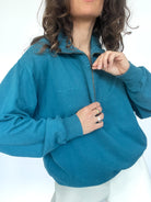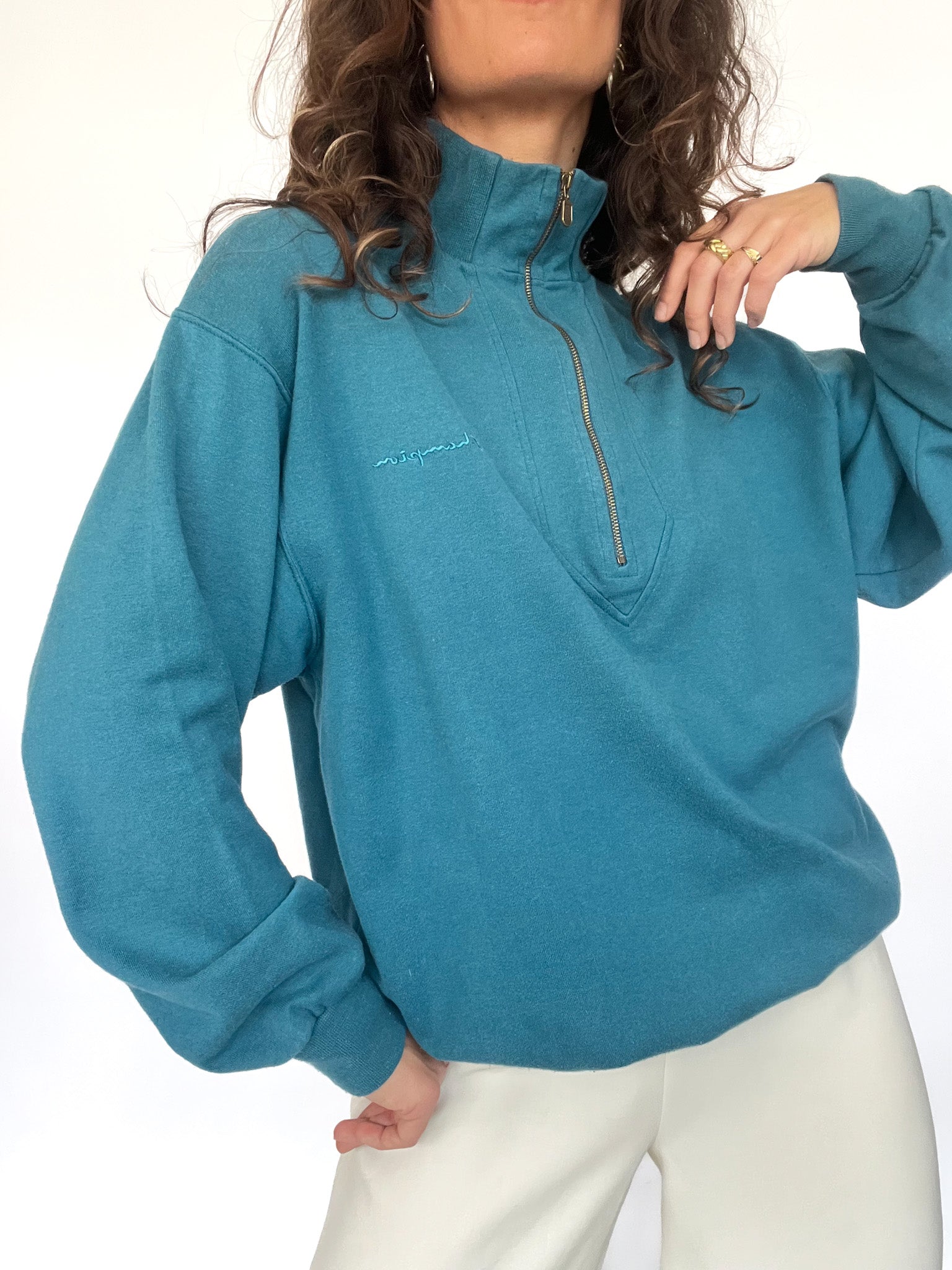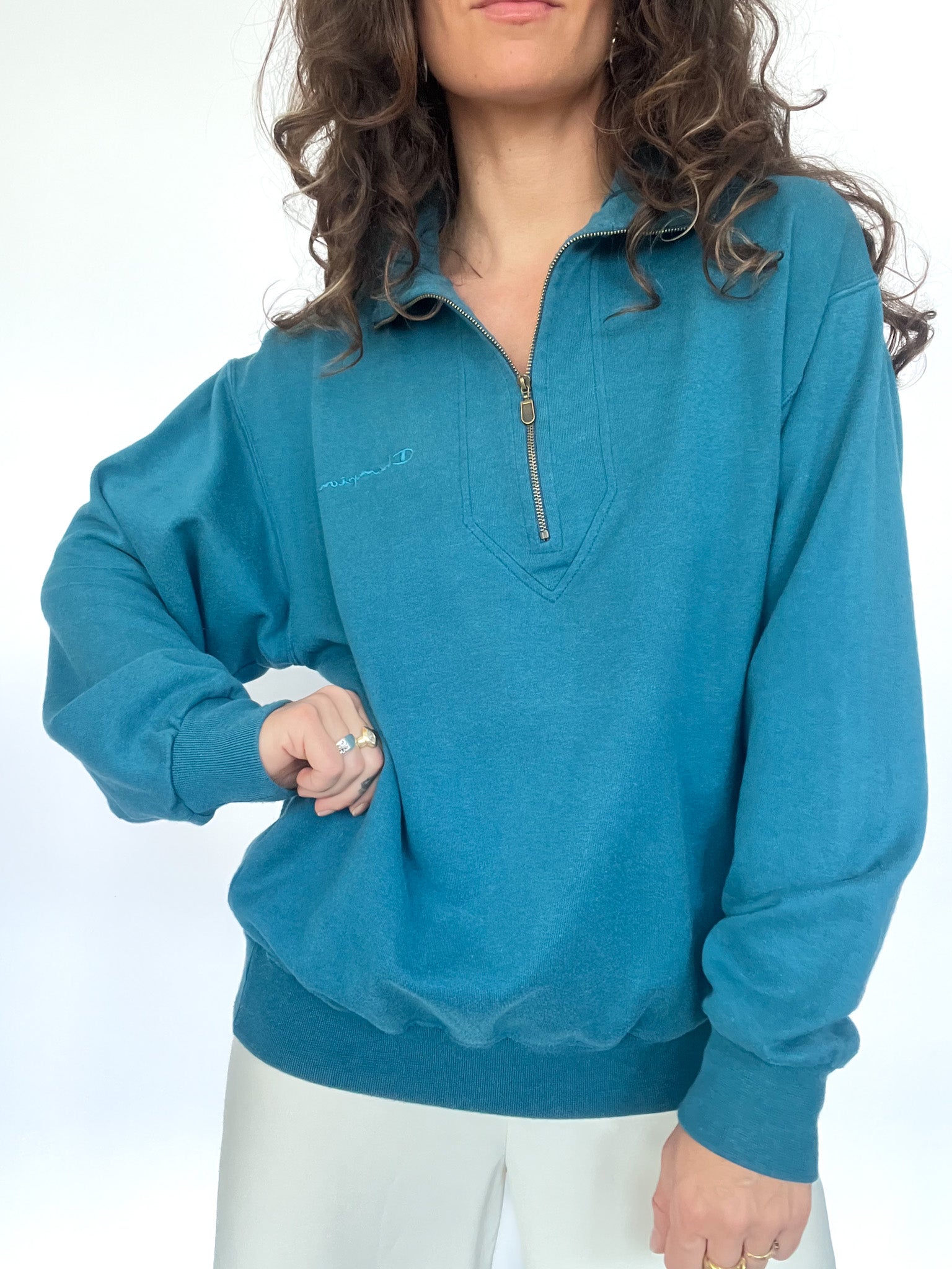 Straight from the archives of American streetwear — this vintage Champion half-zip is that effortlessly cool essential you’ll reach for on repeat. In a striking ocean teal and embroidered with the signature script logo, it blends sporty energy with everyday ease. The slightly oversized cut, ribbed cuffs and mid-weight fleece give it that laid-back silhouette we all crave.