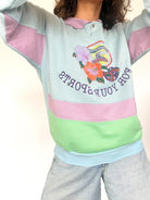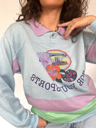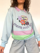 This pastel sweater is pure 90s boldness — sporty and playful with a splash of floral and graphic detail. Featuring a lilac collar, contrast panels and a central print that says it all, this top celebrates the era where sportswear met street style in the most iconic ways.