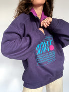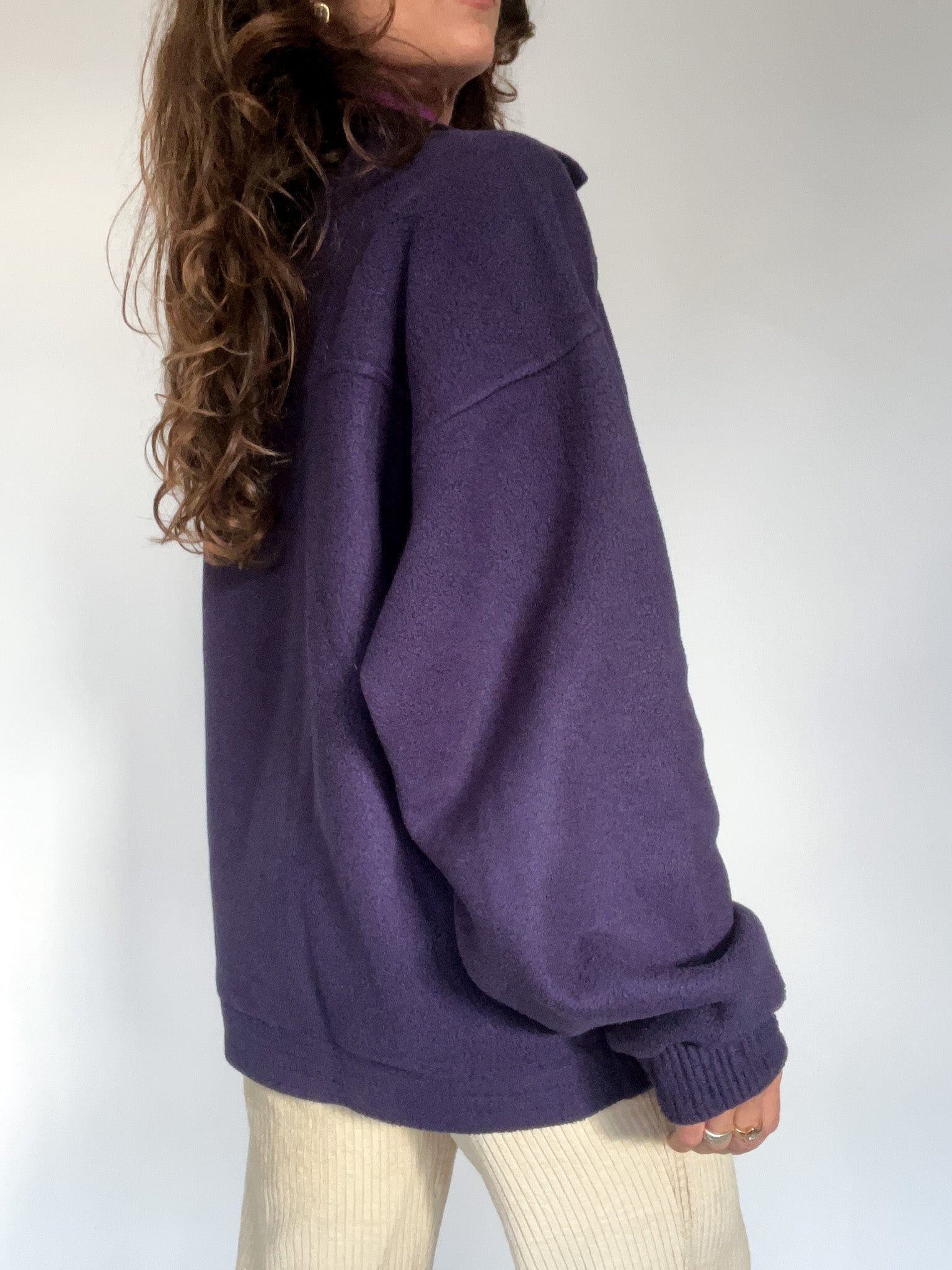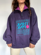 Straight from the playful spirit of the 90s, this oversized fleece captures the bold energy of the decade. In a deep violet tone contrasted by turquoise “Think Pink” lettering, it embodies that carefree outdoor attitude mixed with an effortlessly cool street edge. The half-zip collar lined with fuchsia adds a subtle pop of color — the kind of detail that makes vintage lovers fall in love.