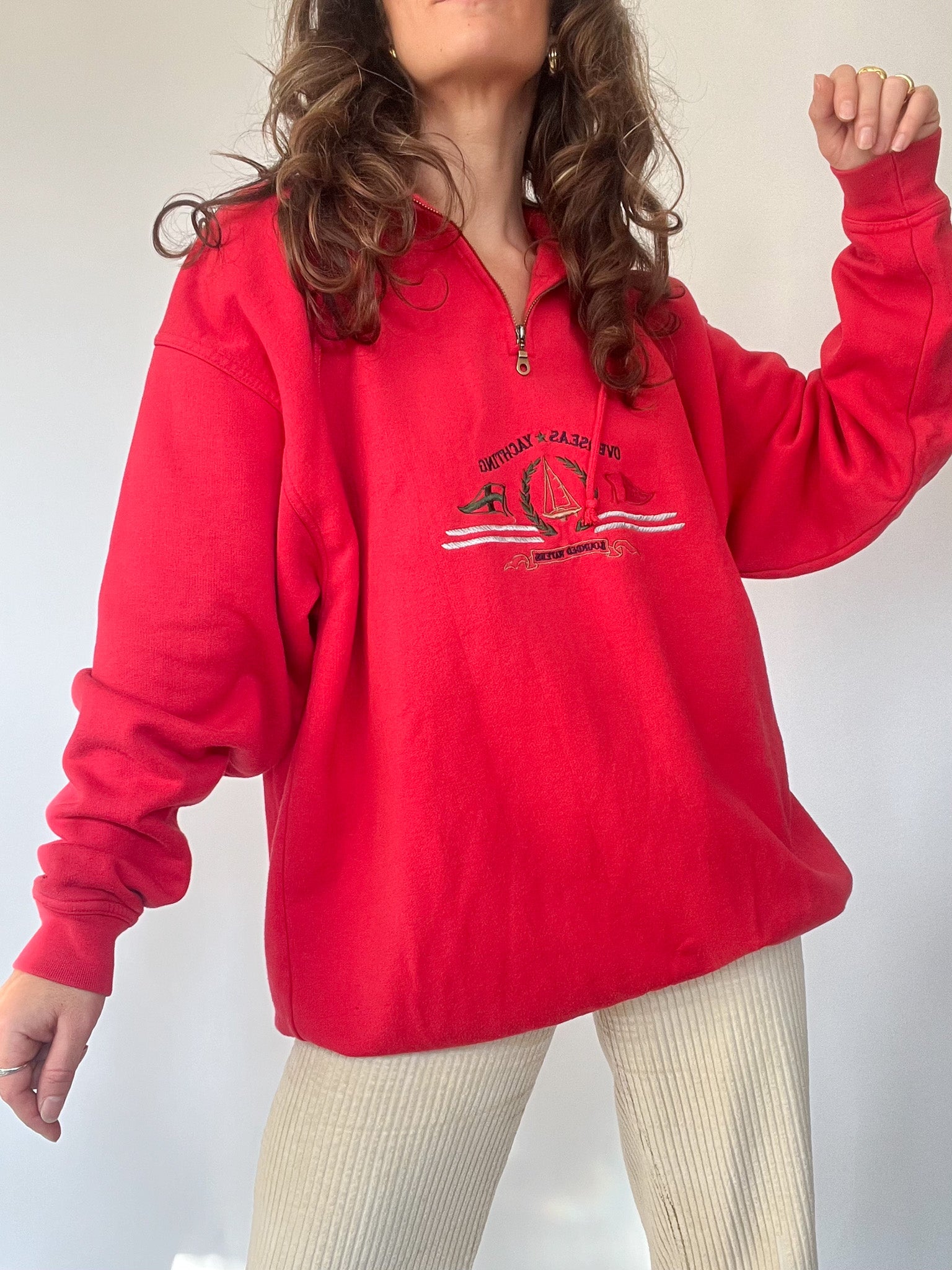 Make a bold statement with this vibrant vintage red quarter-zip sweater. Featuring a classic sailing and yachting graphic on the front, it exudes a sporty, nostalgic vibe. The relaxed fit and soft fabric make it perfect for casual wear, adding a pop of color to any outfit. Ideal for layering or wearing solo, this piece brings a touch of retro charm to your wardrobe.