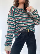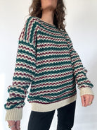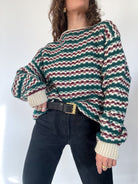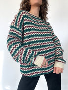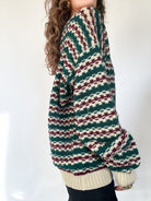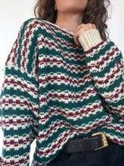 This cozy, vintage-inspired sweater brings warmth and charm with its intricate striped pattern in cream, green, and burgundy hues. The relaxed fit and ribbed cuffs and hem provide a comfortable, laid-back look, perfect for layering or wearing on its own. The thick knit and rich colors make it a must-have for colder days, adding a touch of timeless style to any wardrobe.