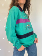 A true vintage gem, this rugby-style sweatshirt embodies the casual yet bold spirit of the 90s. Featuring deep green as the base, contrasted with a purple and navy horizontal stripe and embroidered crest on the chest, it carries an athletic yet preppy vibe. Its oversized cut offers comfort and ease, while the Italian craftsmanship ensures lasting quality. A statement piece that merges sport, style, and timeless character — perfectly aligned with Skorpiones Vintage’s vision of empowering individuality through strong, iconic garments.