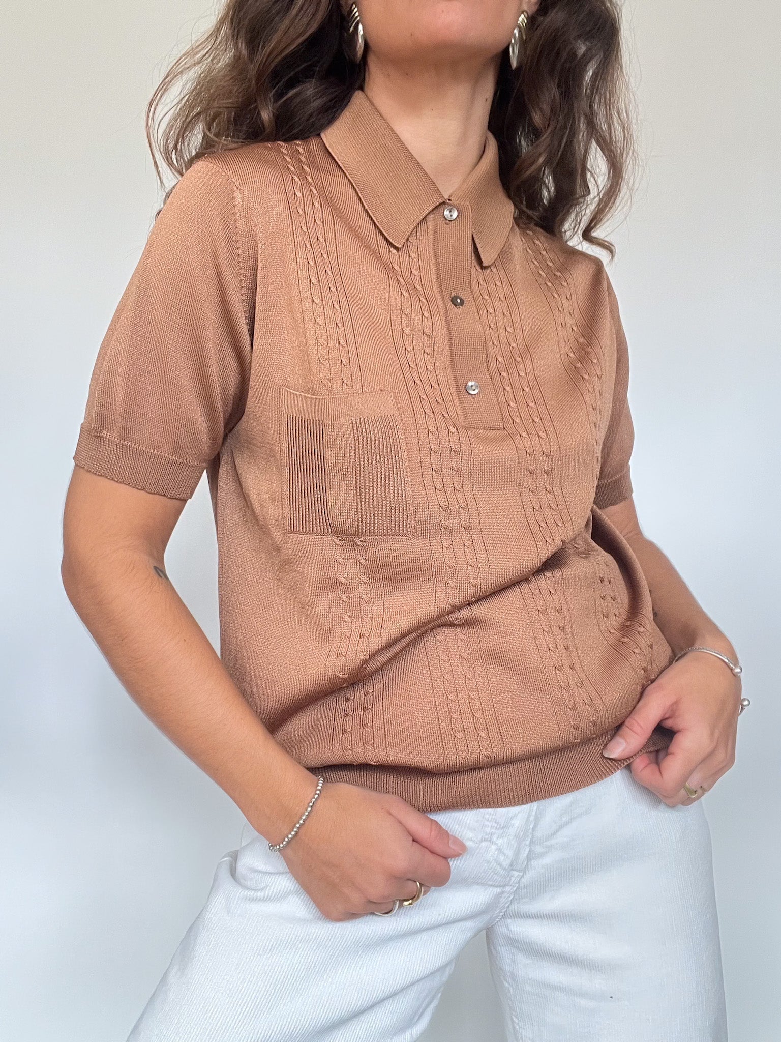 This camel knit polo shirt brings together the casual ease of sportswear with the elegance of vintage knitwear. Featuring a polo collar, short sleeves, and subtle textured knit details, it balances simplicity with refinement. The soft knit makes it versatile for layering or wearing on its own, embodying the timeless quality and effortless charm that Skorpiones Vintage celebrates. A piece that feels both understated and empowering, perfect for building iconic everyday looks.