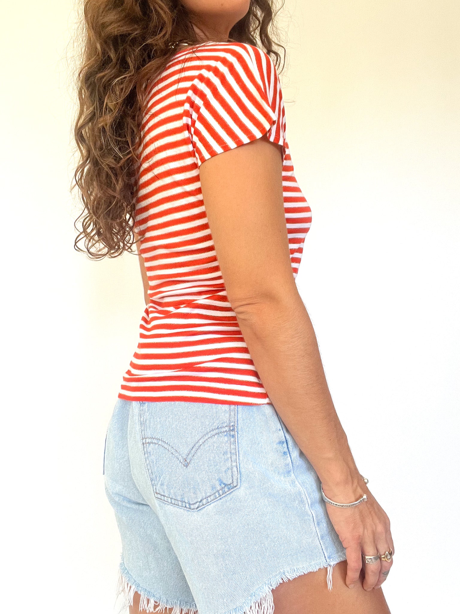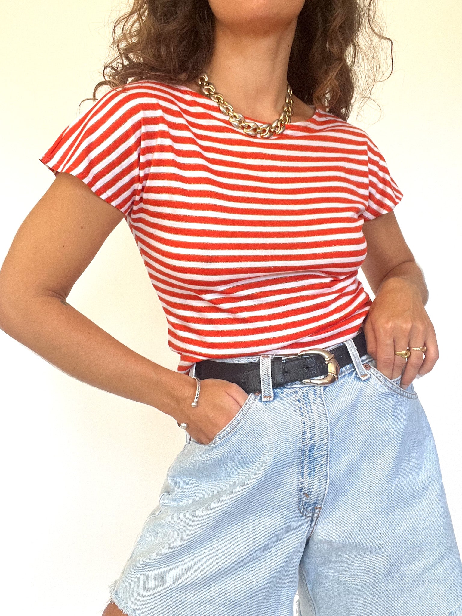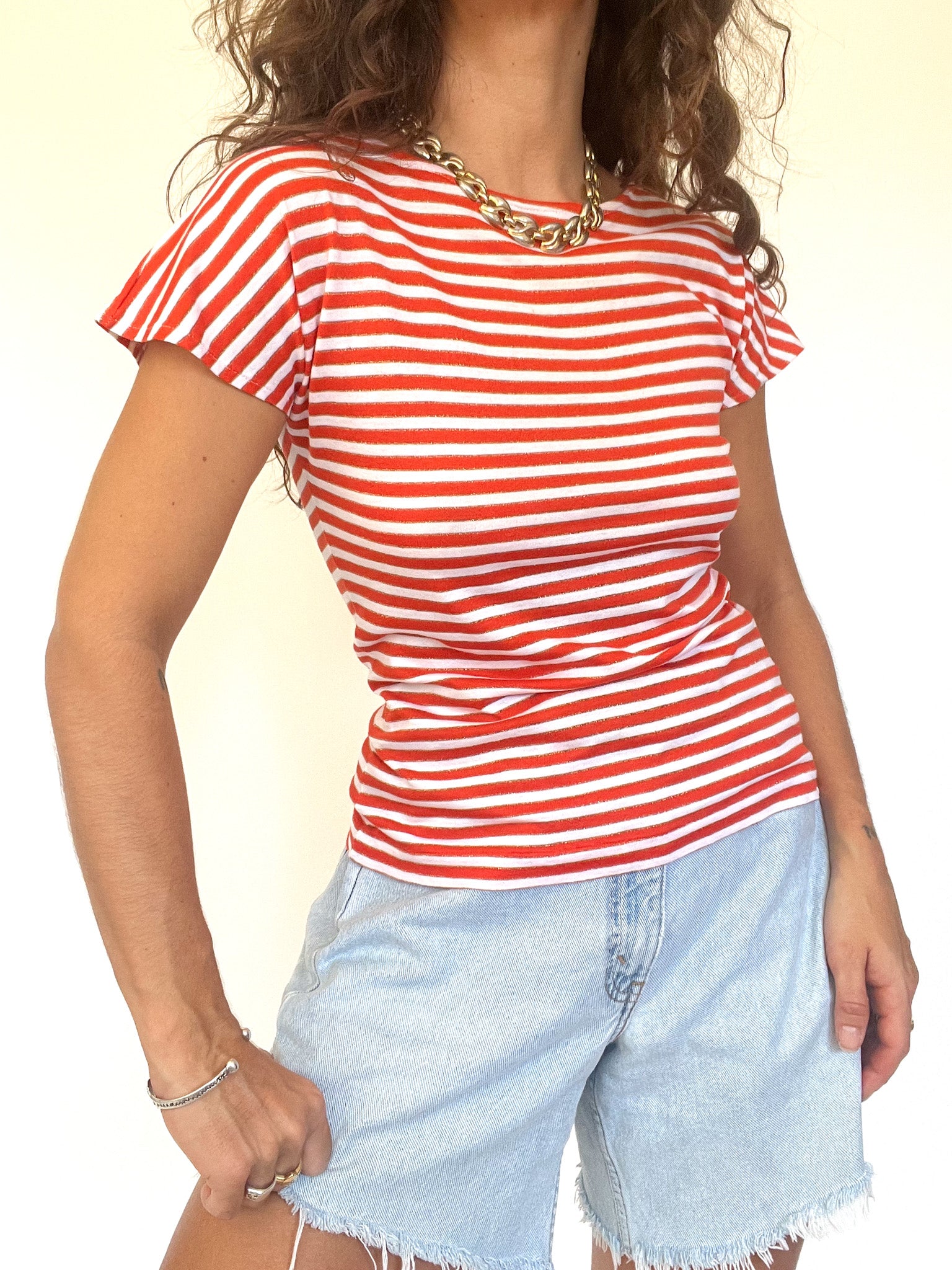 Channel effortless French Riviera vibes with this vintage 90’s striped tee. Featuring bold red and white horizontal stripes, it’s a timeless wardrobe staple that brings instant freshness to any summer look. Its fitted cut highlights the silhouette, while the soft, lightweight knit ensures all-day comfort. Perfect with denim shorts for a casual day or tucked into high-waisted trousers for a chic twist — a versatile piece for those who embrace classic style with a touch of vintage charm.