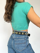 This vintage cropped top in vibrant aqua blue is the perfect balance between retro charm and playful energy. Its soft knit fabric hugs the body with just enough structure, while the delicate cut-out floral details add a subtle feminine touch. The high neckline and capped sleeves create a flattering silhouette, ideal for pairing with high-rise denim or layered under a blazer for a bold, modern look.