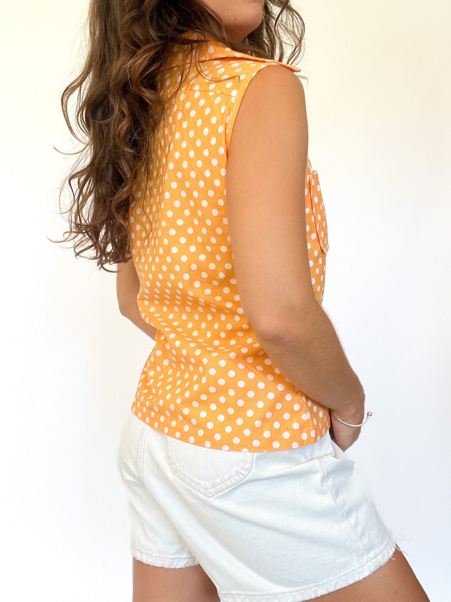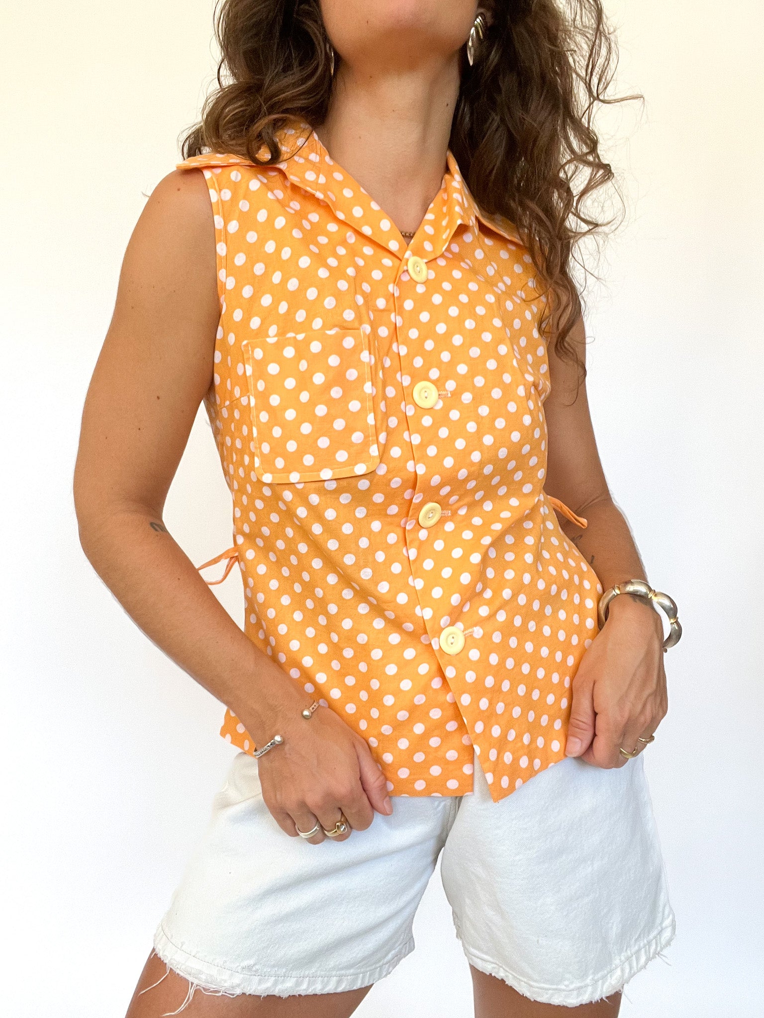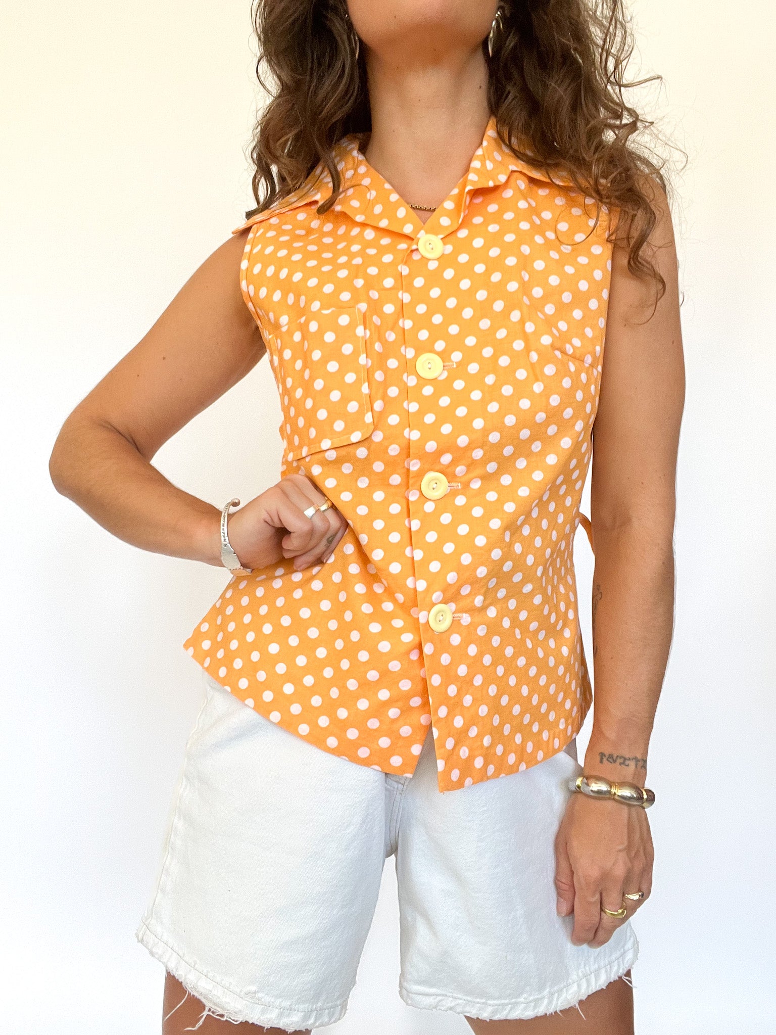 Sunny and playful, this sleeveless orange blouse brings a retro pop straight from the 80’s. With its pointed collar and oversized white polka dots, it’s both structured and light-hearted. Two chest pockets and waist side ties give it a casual yet tailored edge. A statement of empowerment wrapped in joyful color — made for those who dare to stand out while keeping it cool.