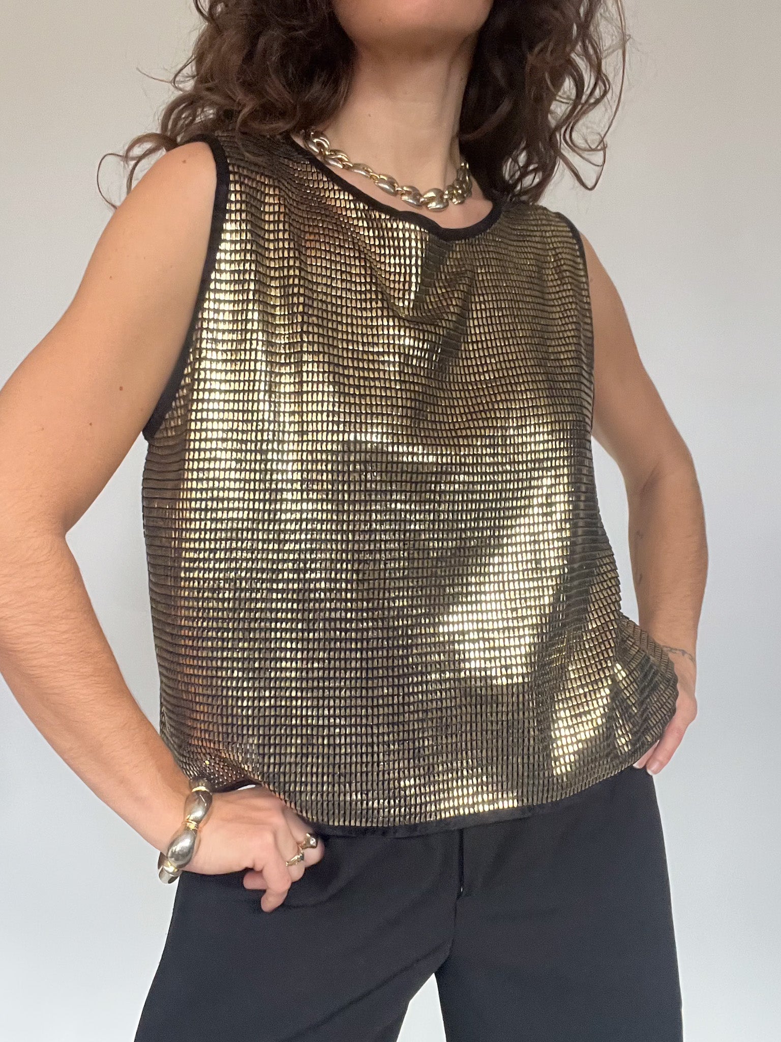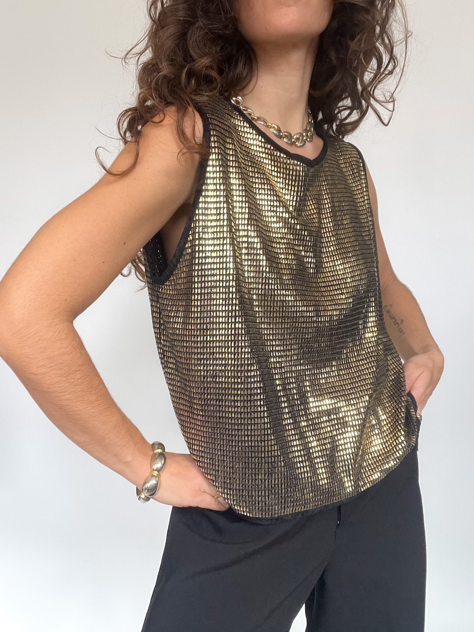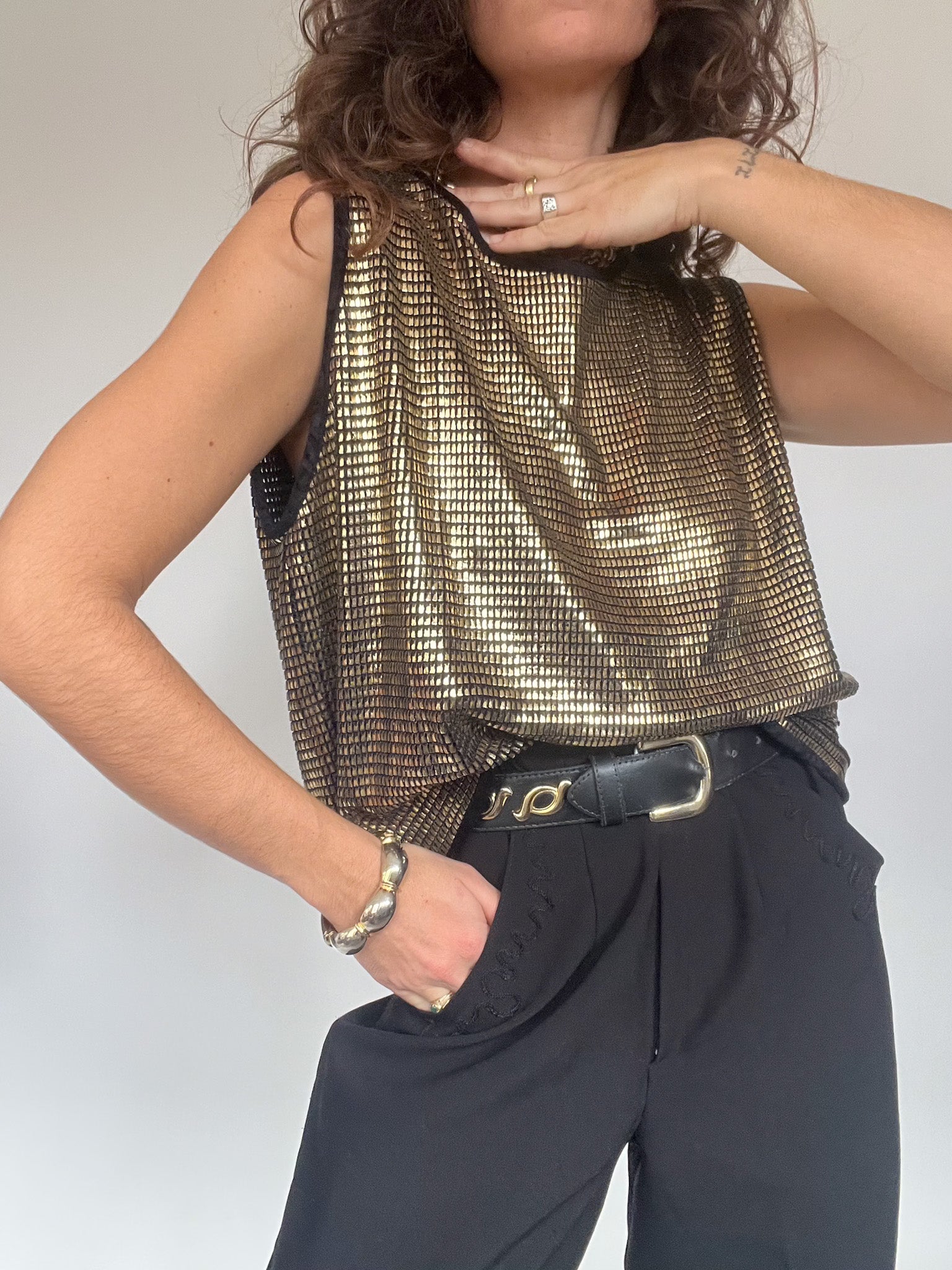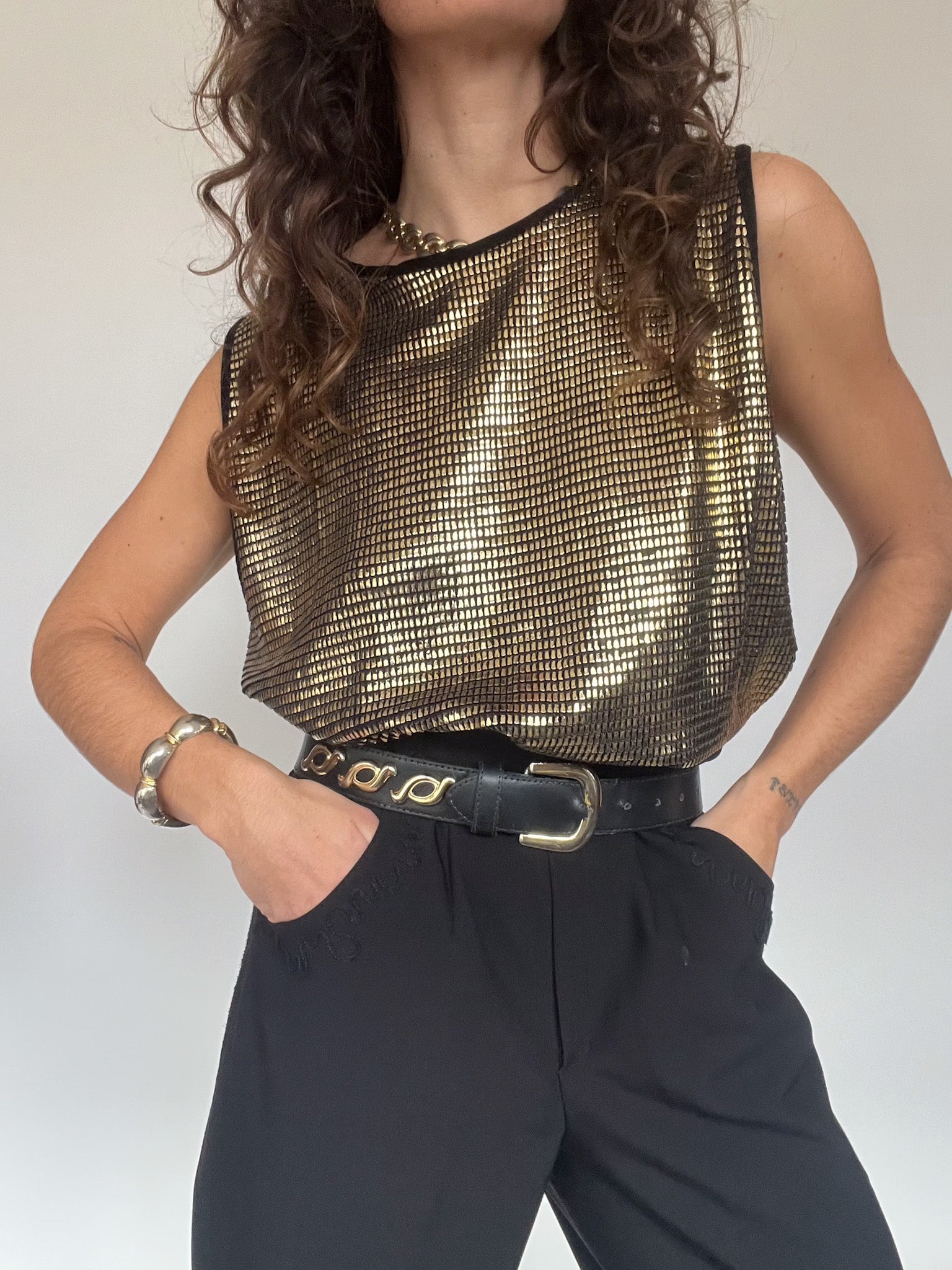 A breathtaking 90’s statement camisole, selected for its extraordinary structure and its hypnotic gold pattern that feels almost sculptural. The fit is impeccable, shaping the bust beautifully while elongating the silhouette with its longline cut and perfectly placed seams. This is one of those rare vintage treasures that embody the full Skorpiones Vintage spirit: bold, artistic, fiercely feminine and undeniably iconic. Every detail — from the intricate abstract pattern to the delicate straps — makes it a wearable work of art, the kind of piece that transforms an outfit instantly.