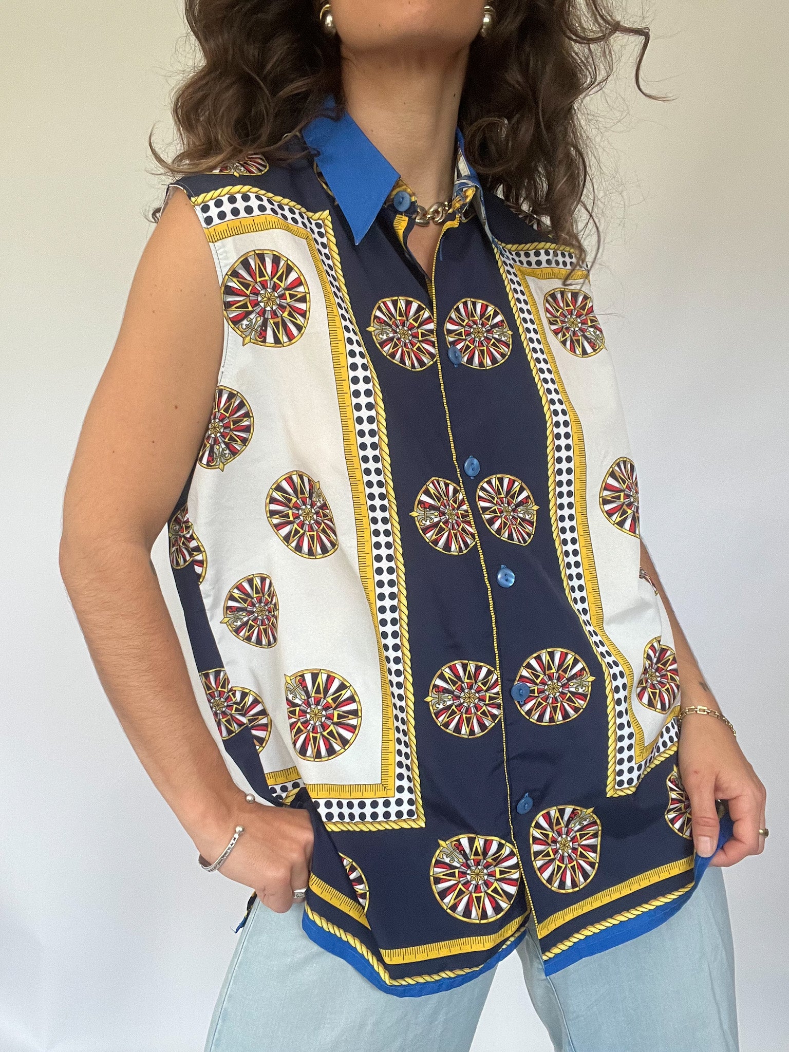 Vivid, playful, and unmistakably vintage, this sleeveless shirt feels like a collector’s scarf turned wearable art. The trompe-l’œil jewel motifs, golden chains, and navy accents bring bold personality, while the oversized cut ensures a relaxed silhouette. It’s exactly the kind of standout piece we love to find. Unexpected, luxurious, and full of character.