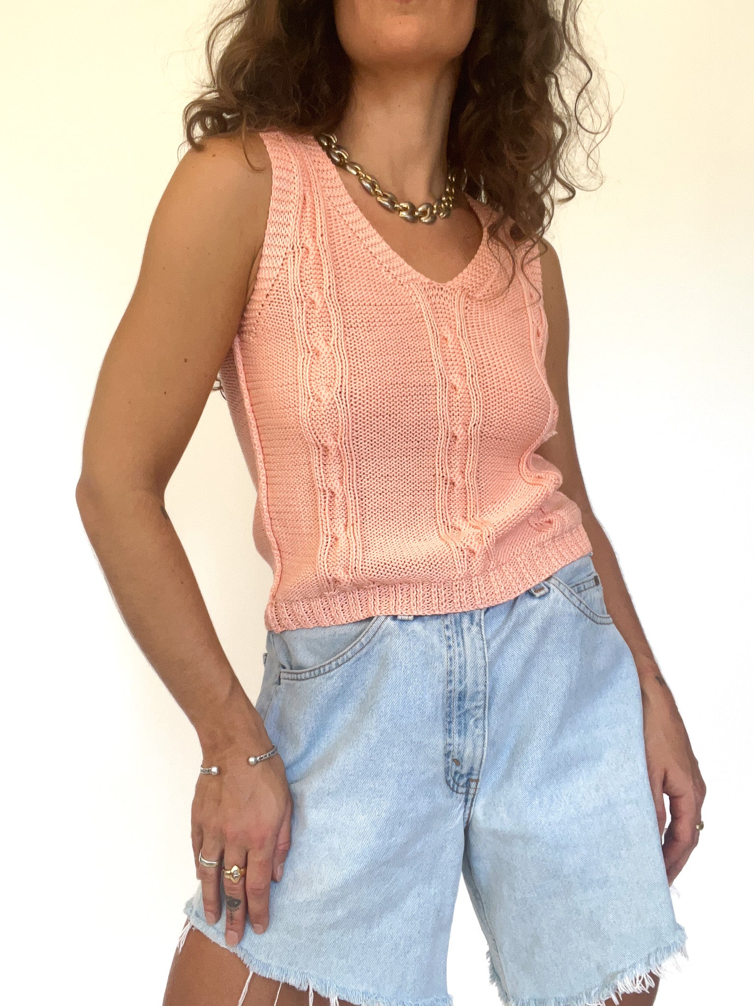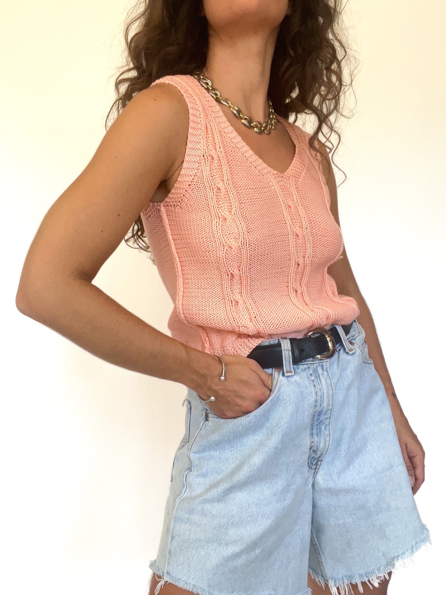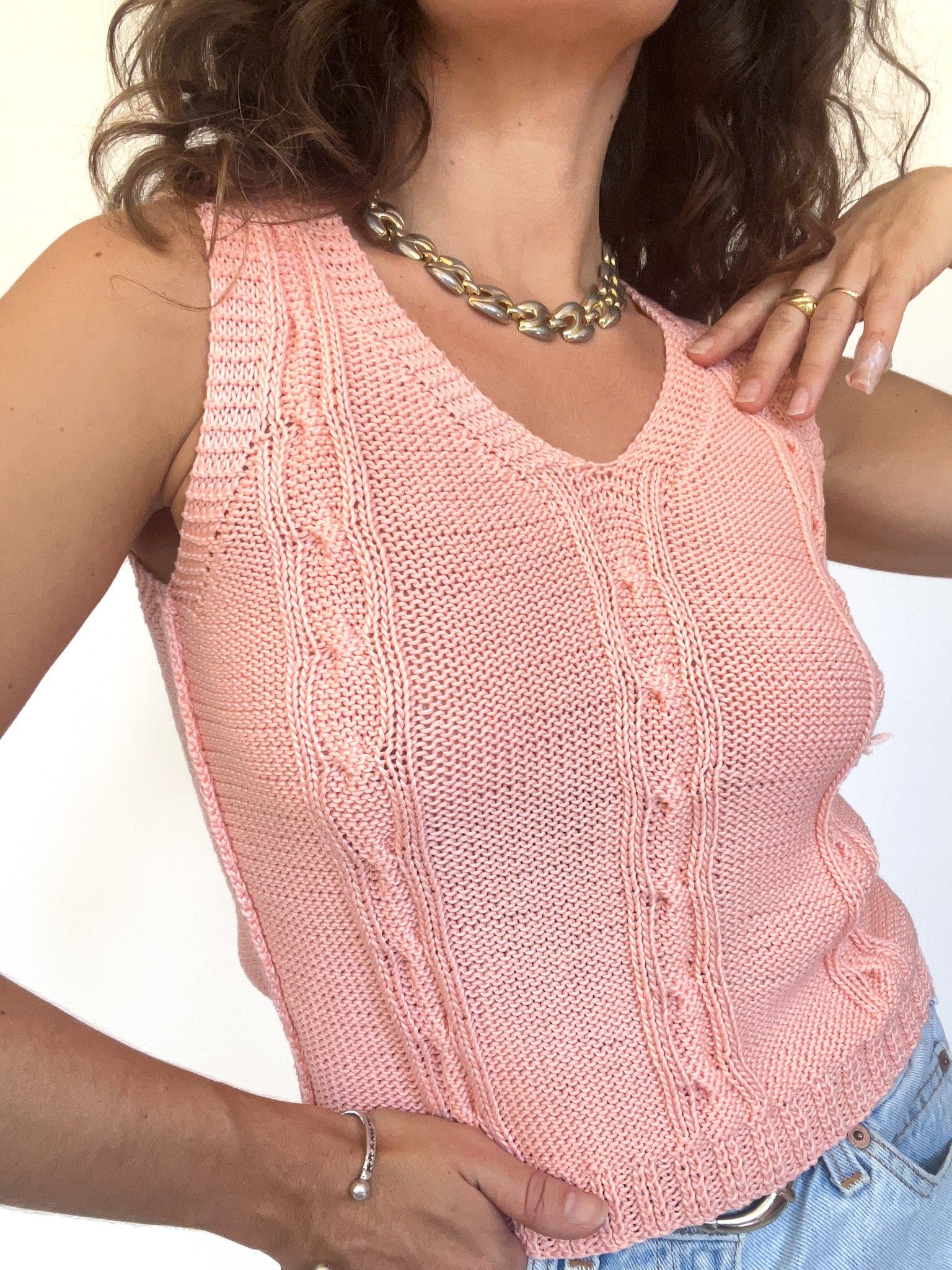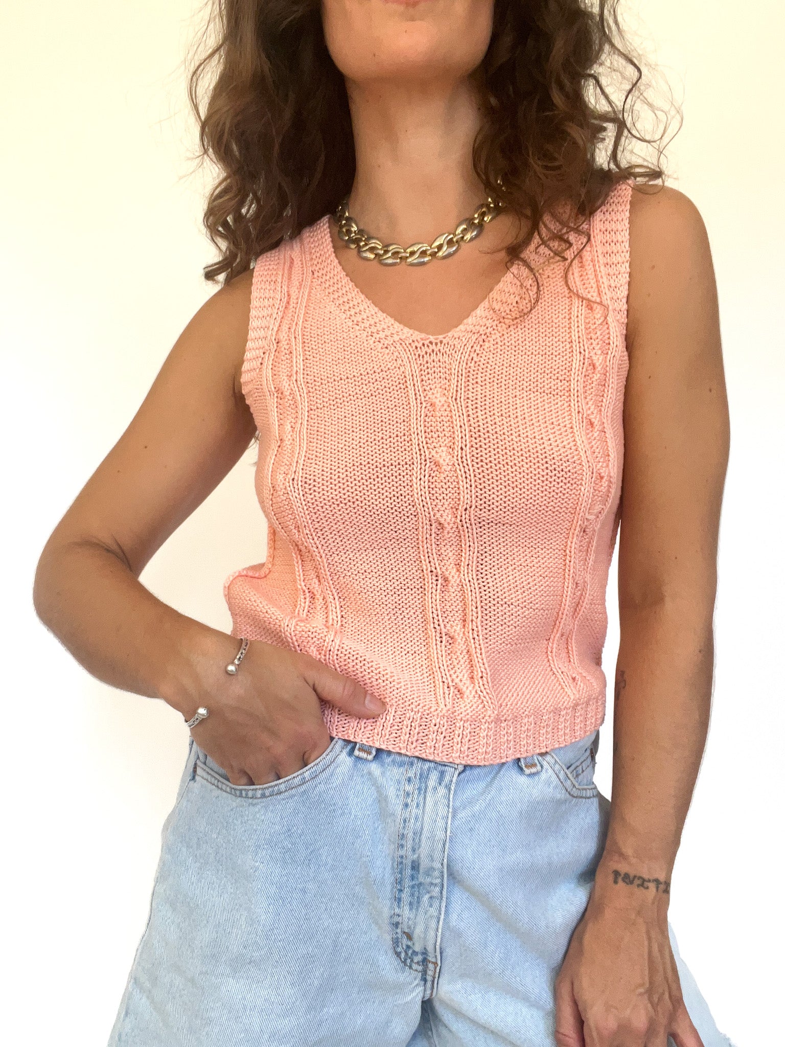 • Special features: Hand-knitted, soft peach hue, cable-knit detailing, sleeveless design, ribbed hem