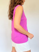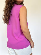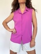 - Special features: Bright fuchsia tone, structured collar, tone-on-tone buttons, sleeveless cut