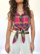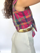 A playful nod to vintage picnic-core with an edge. This sleeveless blouse in a vivid mix of fuchsia, mustard, navy, and green features bold checks and a cropped cut perfect for tying at the waist. Feminine, but not too sweet — it’s a powerful dose of retro charm ready for the summer heat.