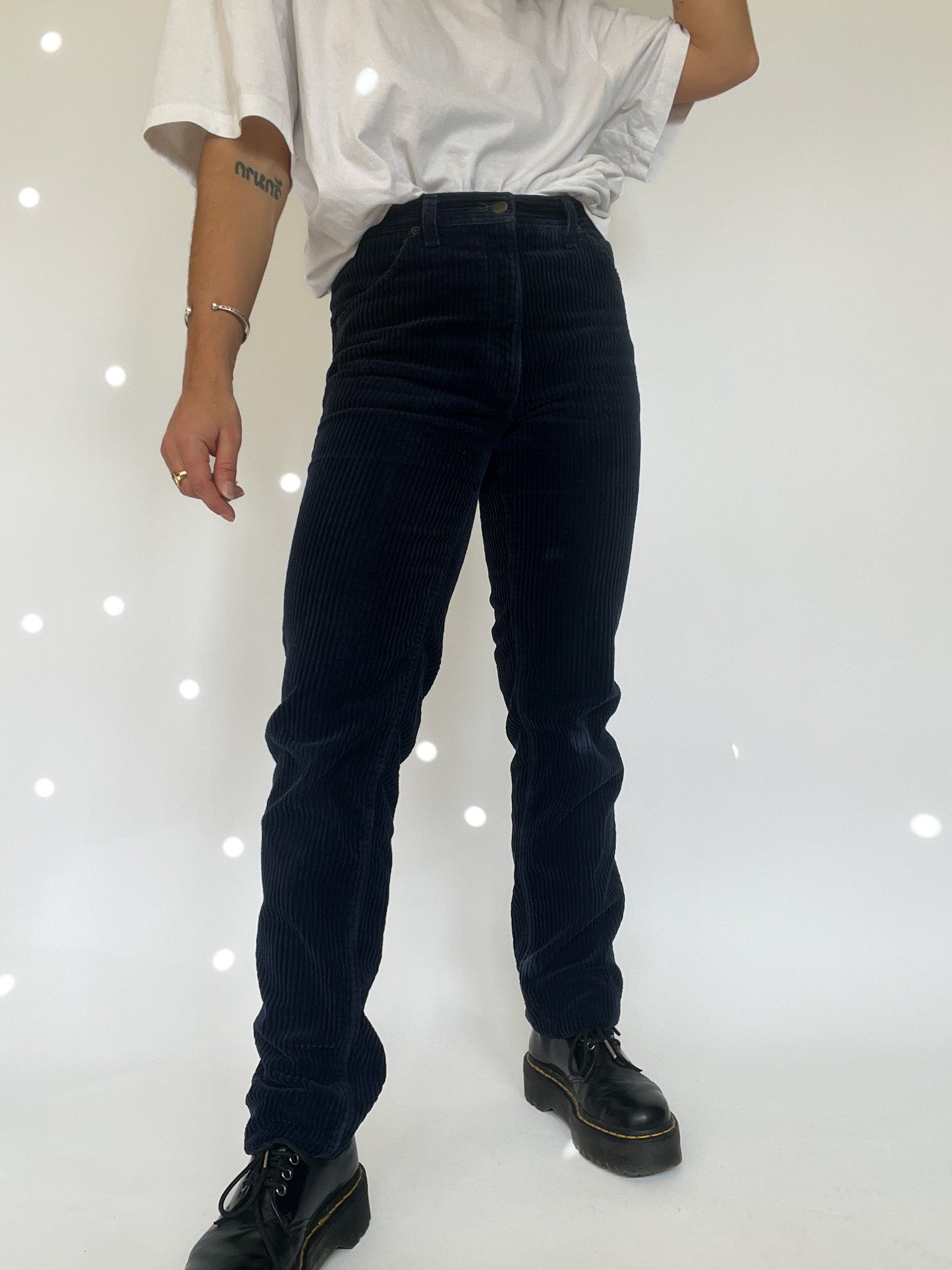 A staple piece for those who appreciate texture and depth, these vintage navy corduroy trousers exude effortless cool. The high-waisted fit enhances the silhouette, while the soft corduroy fabric brings a rich, tactile feel. Versatile enough for both relaxed and elevated styling, they’re a must-have for a well-curated wardrobe.