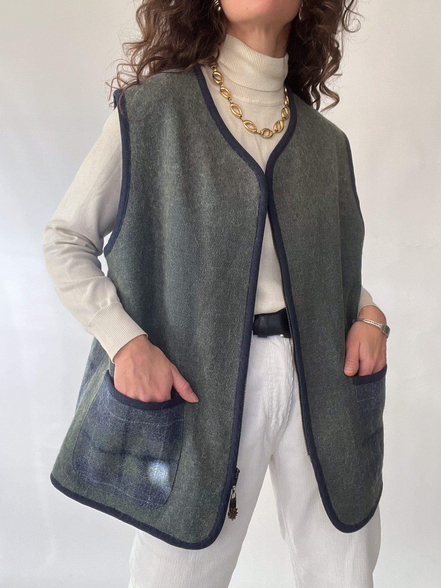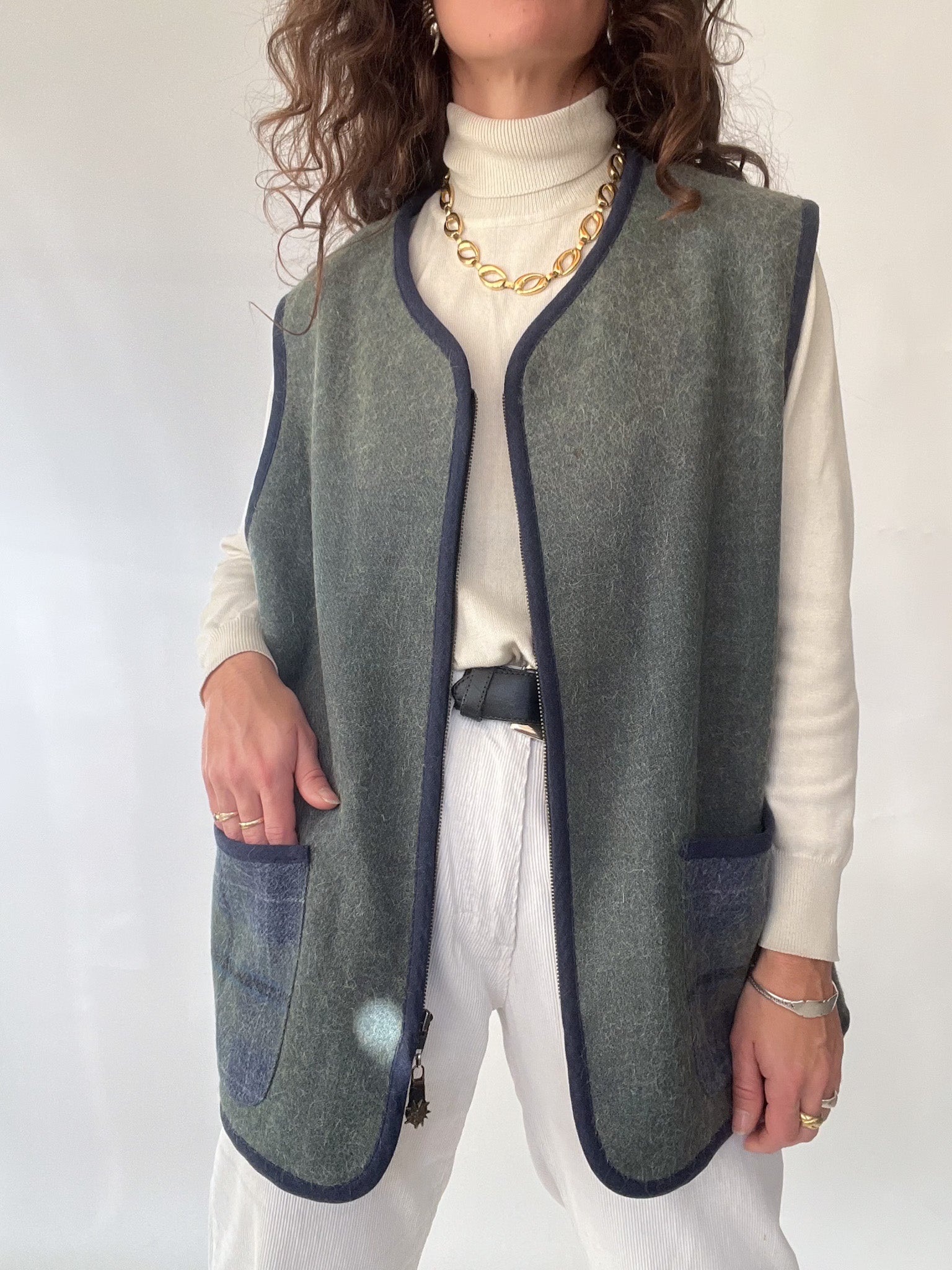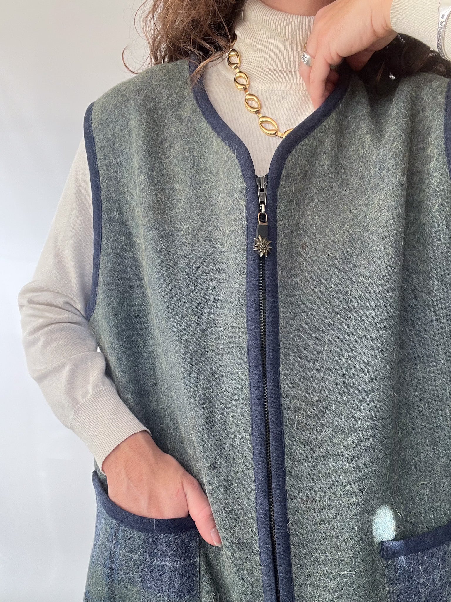 A beautifully crafted vintage vest that embodies the quiet luxury and authenticity at the heart of Skorpiones Vintage. This piece blends the softness of wool with the warmth of alpaca, creating a texture that feels both sturdy and comforting. Its deep green and navy tones bring a subtle sophistication, while the contrast pockets and clean finishing elevate its minimalist charm. One of the details that makes this vest truly special: the sun-shaped zipper pull — a small, poetic touch that feels like carrying a piece of light with you. A versatile, timeless layer designed to empower your winter looks with ease and intention.