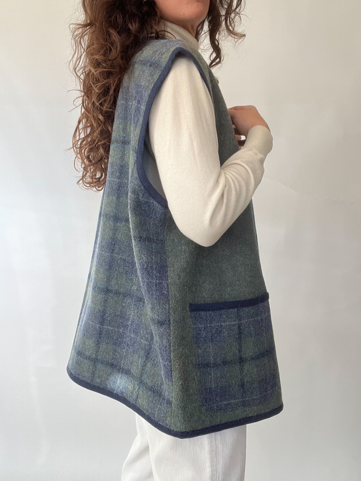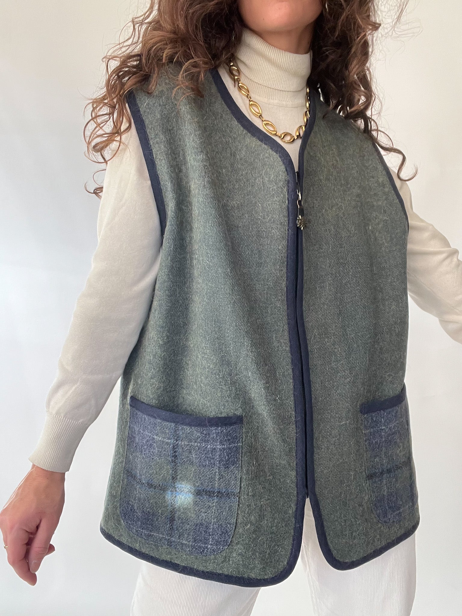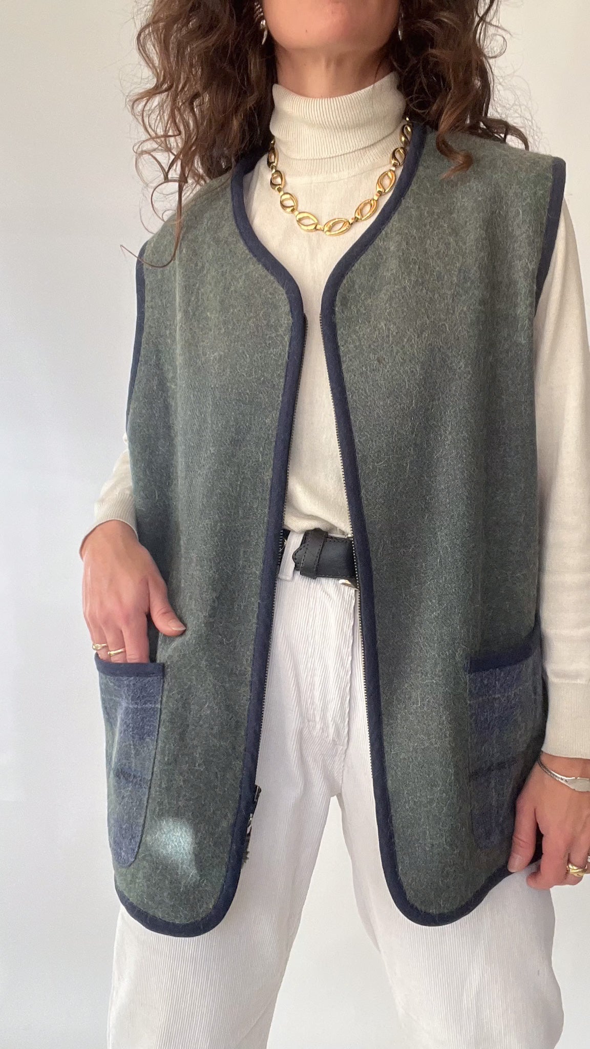 A beautifully crafted vintage vest that embodies the quiet luxury and authenticity at the heart of Skorpiones Vintage. This piece blends the softness of wool with the warmth of alpaca, creating a texture that feels both sturdy and comforting. Its deep green and navy tones bring a subtle sophistication, while the contrast pockets and clean finishing elevate its minimalist charm. One of the details that makes this vest truly special: the sun-shaped zipper pull — a small, poetic touch that feels like carrying a piece of light with you. A versatile, timeless layer designed to empower your winter looks with ease and intention.