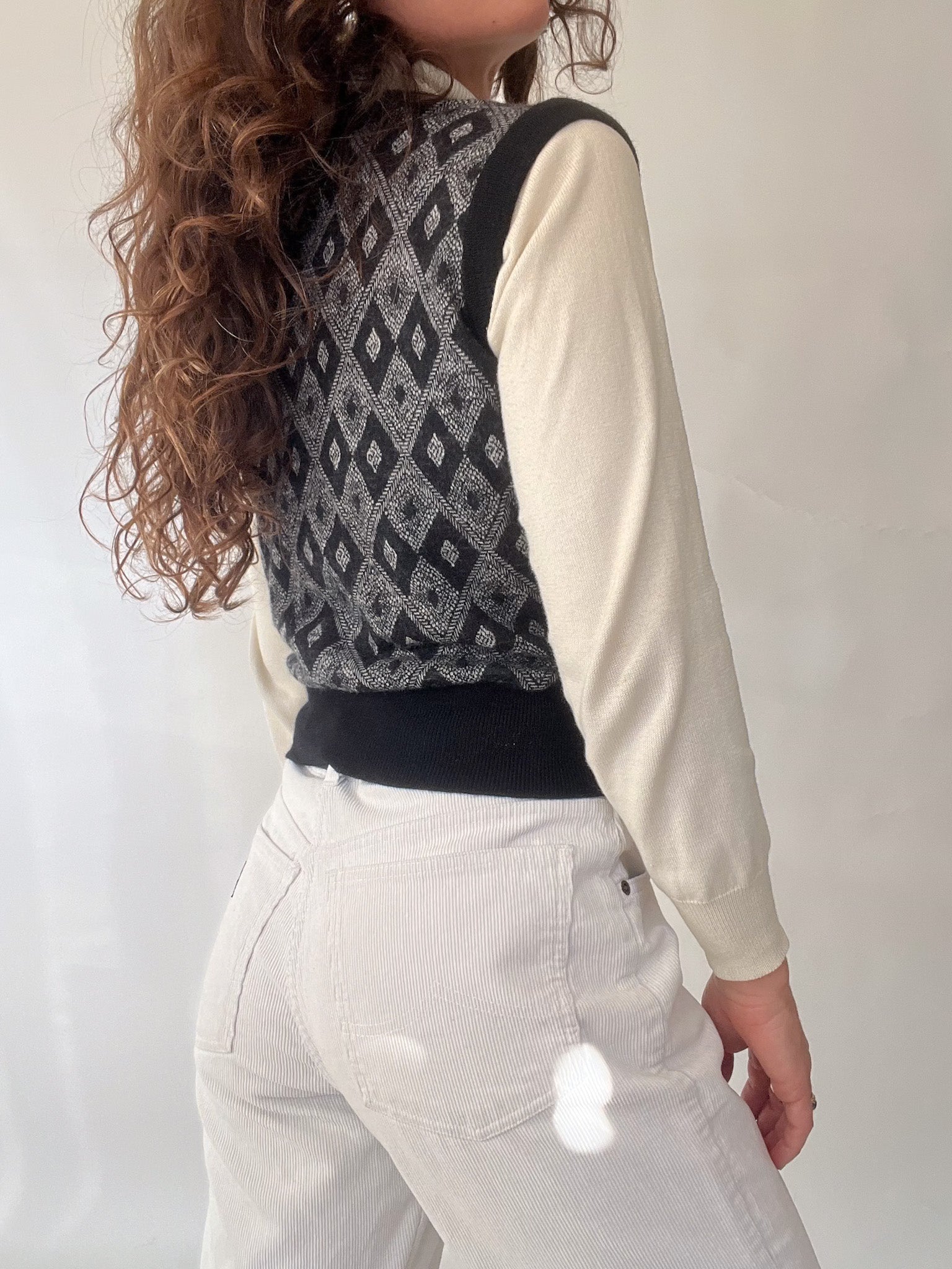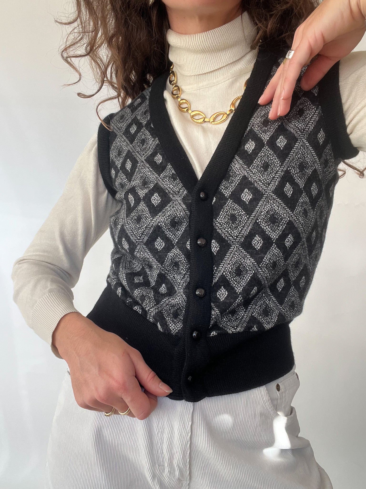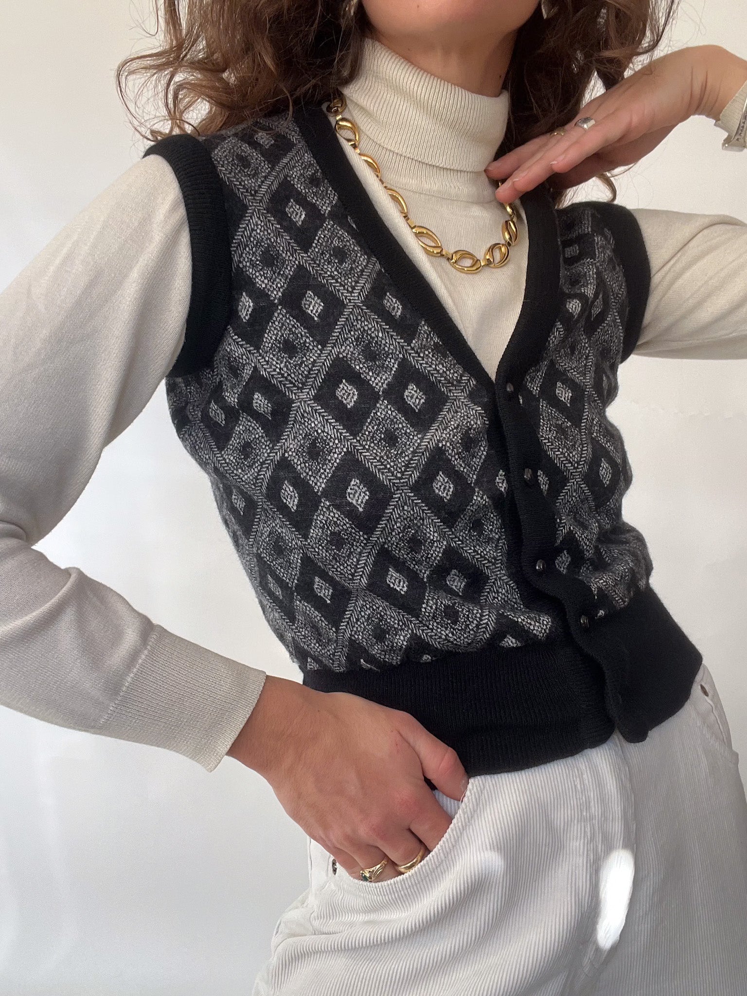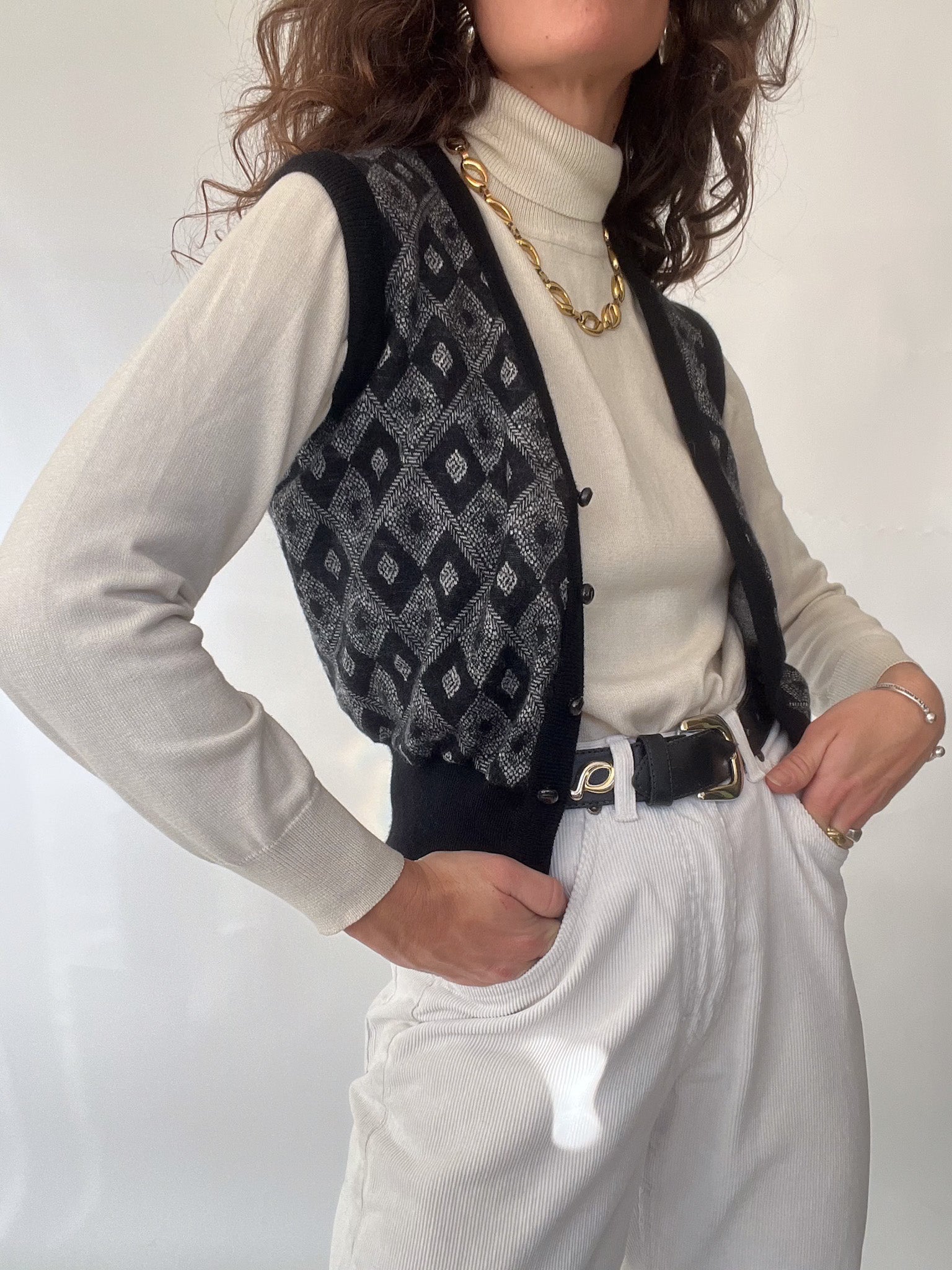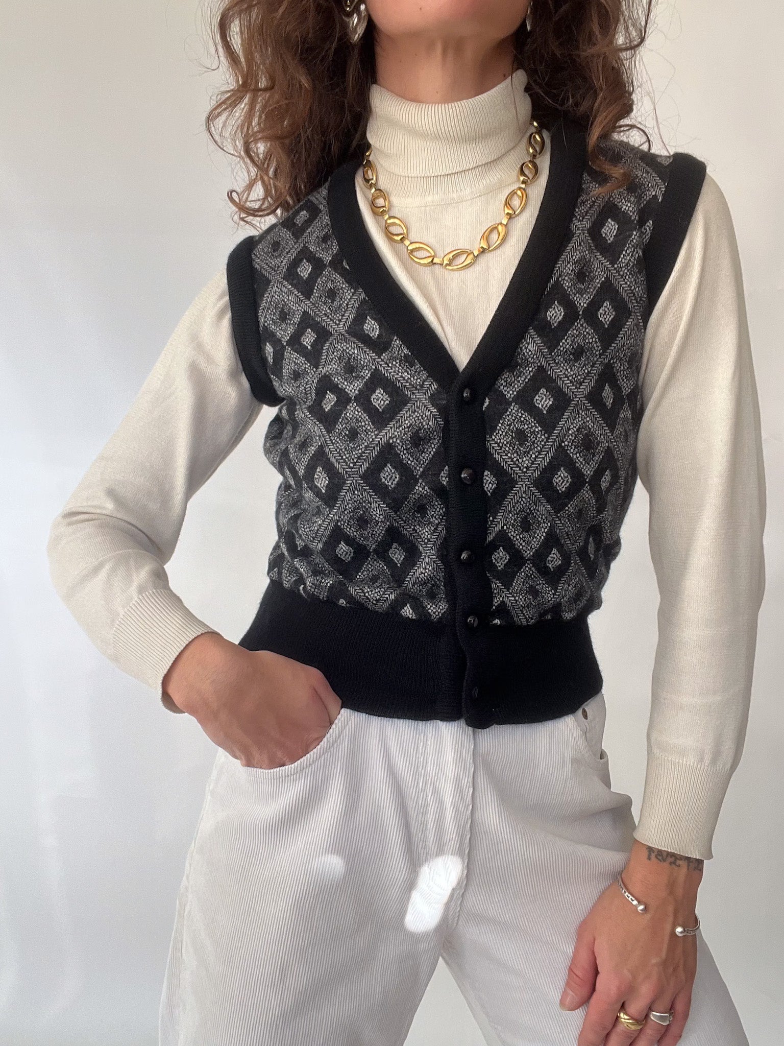 A beautifully structured vintage vest that instantly elevates any silhouette. This Italian-made piece brings together intricate diamond knitwork and a soft, refined texture, creating a timeless layer that feels both classic and effortlessly modern. True to the Skorpiones Vintage essence, it blends authenticity, craftsmanship, and that subtle touch of empowerment—making it the perfect piece for women who love expressing their individuality through iconic vintage staples. Worn over a turtleneck or a crisp shirt, it becomes that understated statement you’ll reach for again and again.