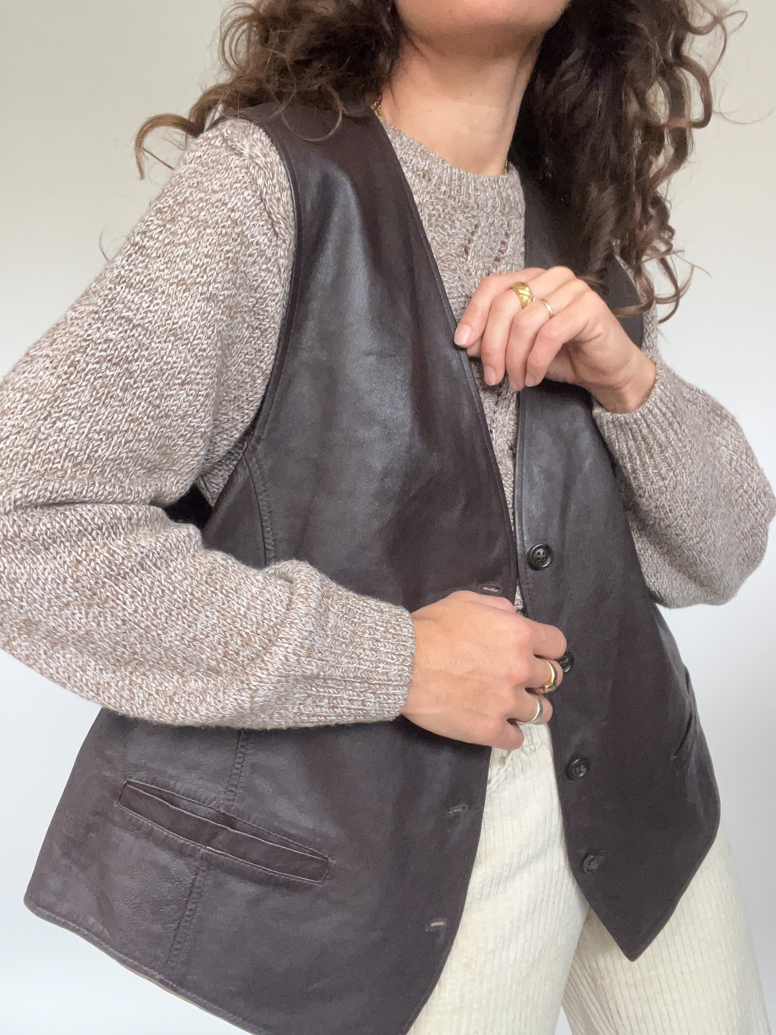 A timeless vintage leather vest that embodies strength and effortless sophistication. Crafted from genuine Italian leather, its clean silhouette and tailored shape make it a versatile layering piece — from soft knits to silk blouses. This piece reflects the authentic spirit of Skorpiones Vintage: bold yet refined, celebrating individuality with a hint of rebellion.