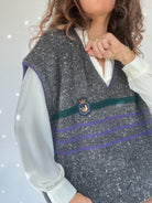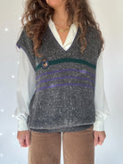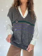 A true preppy essential straight from the 80s, this sleeveless knit embodies that classic collegiate charm. Featuring a speckled charcoal grey knit with green and purple stripes and a crest patch on the chest, it channels the effortless academic style once seen on British students layering sweaters over crisp shirts. Perfect to add a touch of vintage sophistication to any look.