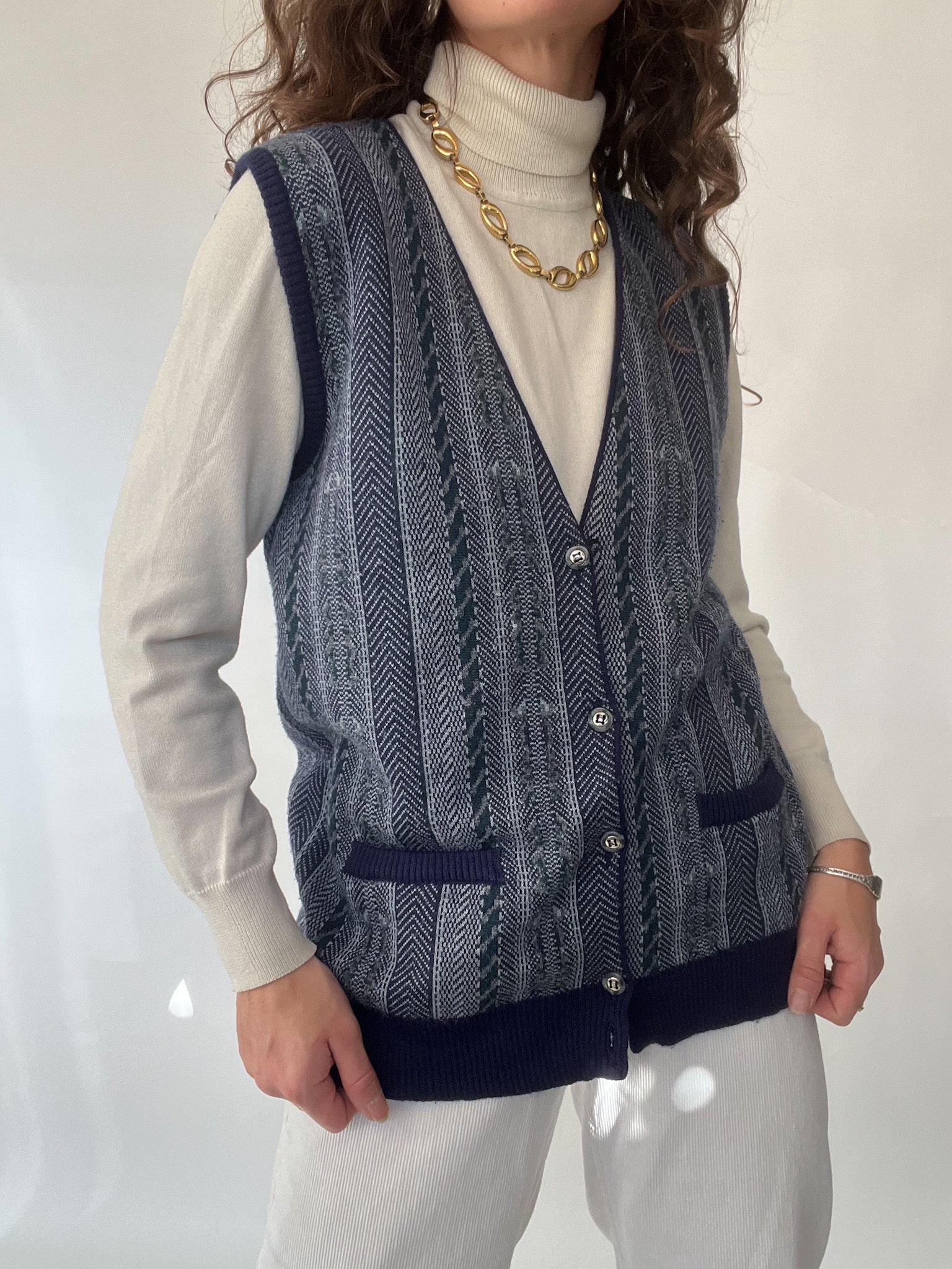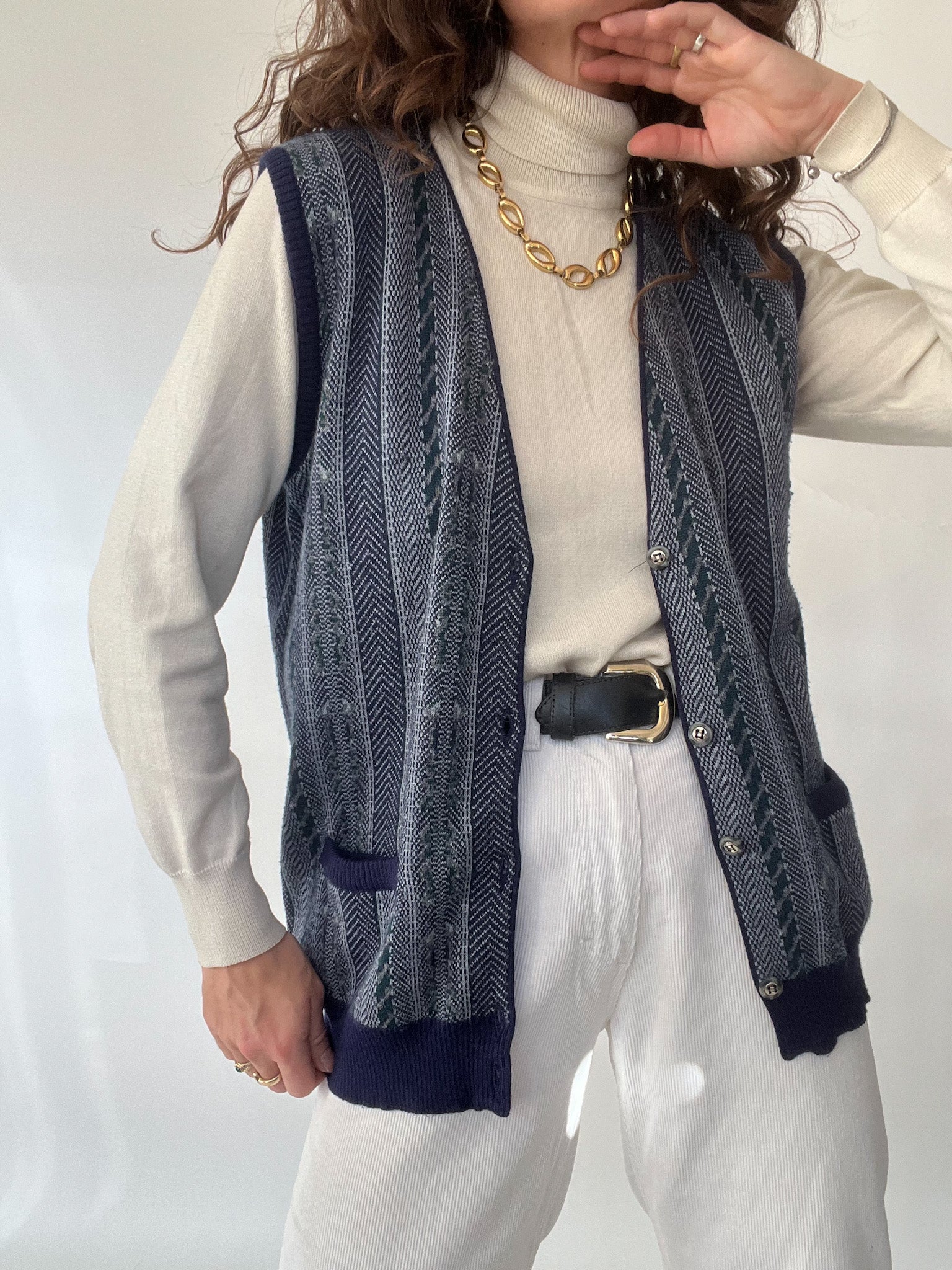 A soft, structured vintage knit that brings a subtle dose of sophistication to winter dressing. This navy geometric vest blends warmth, texture, and timeless Italian craftsmanship — a piece that perfectly reflects the Skorpiones Vintage philosophy: authentic materials, unique patterns, and designs that empower you to express your individuality with quiet confidence. Wear it layered over a turtleneck for an elegant, city-ready look, or styled casually with denim for a modern vintage twist. A beautifully balanced piece that feels both nostalgic and effortlessly current.