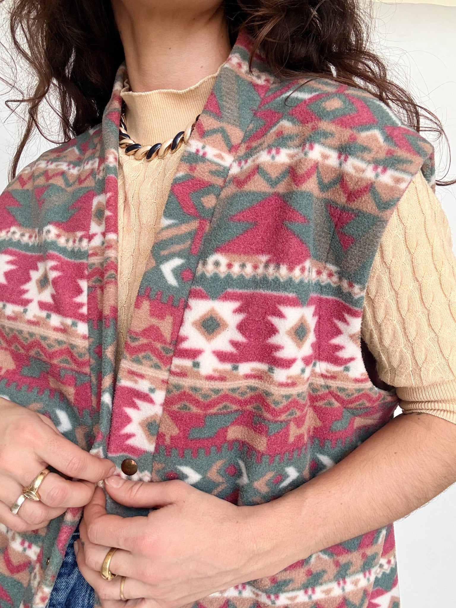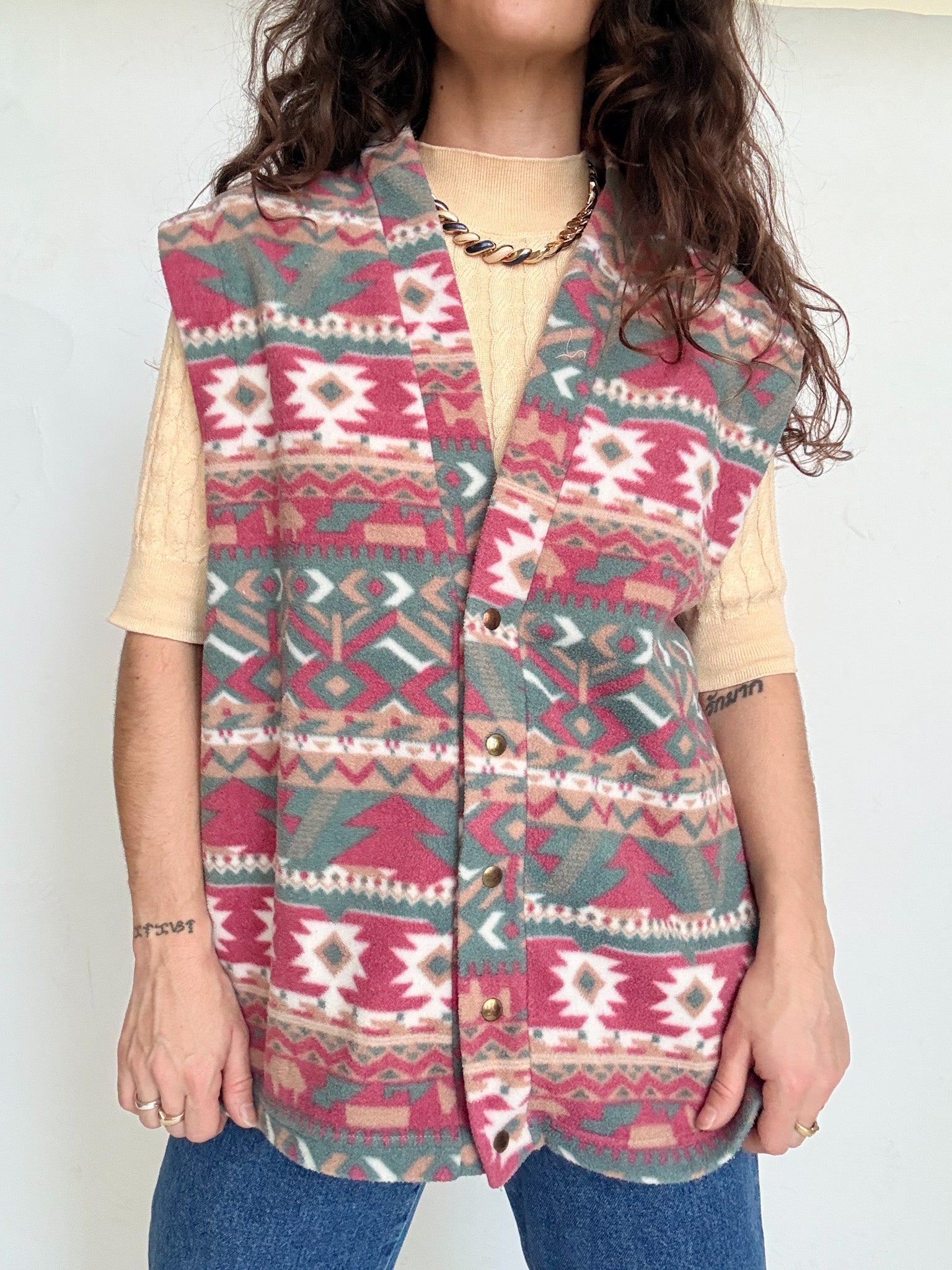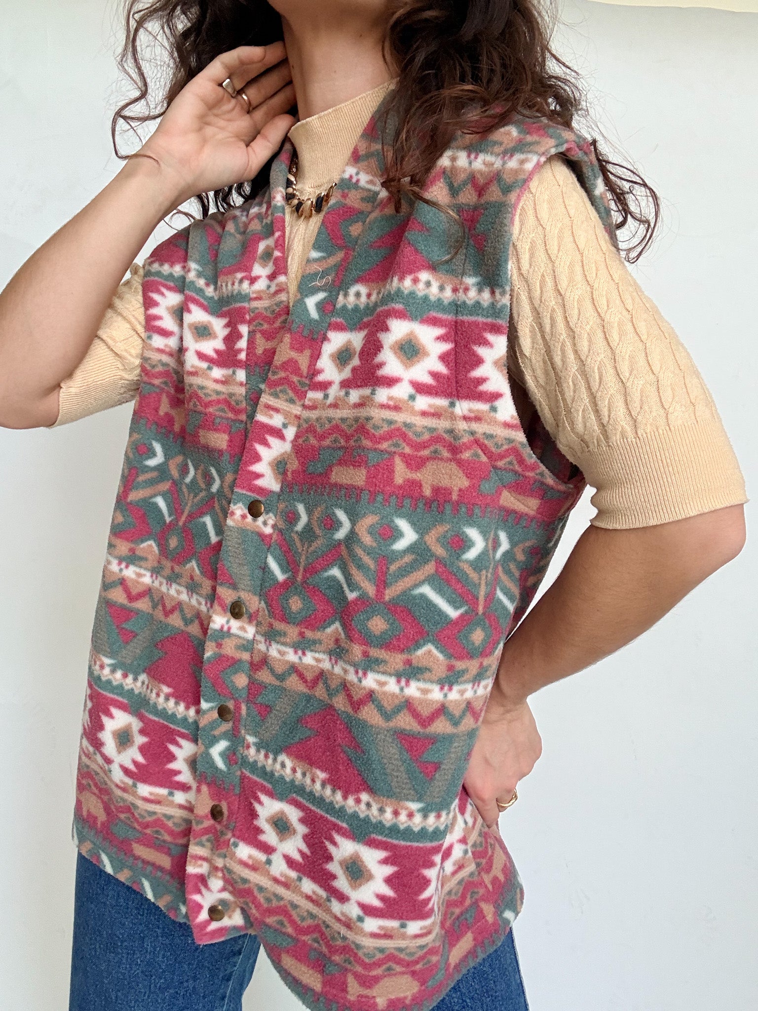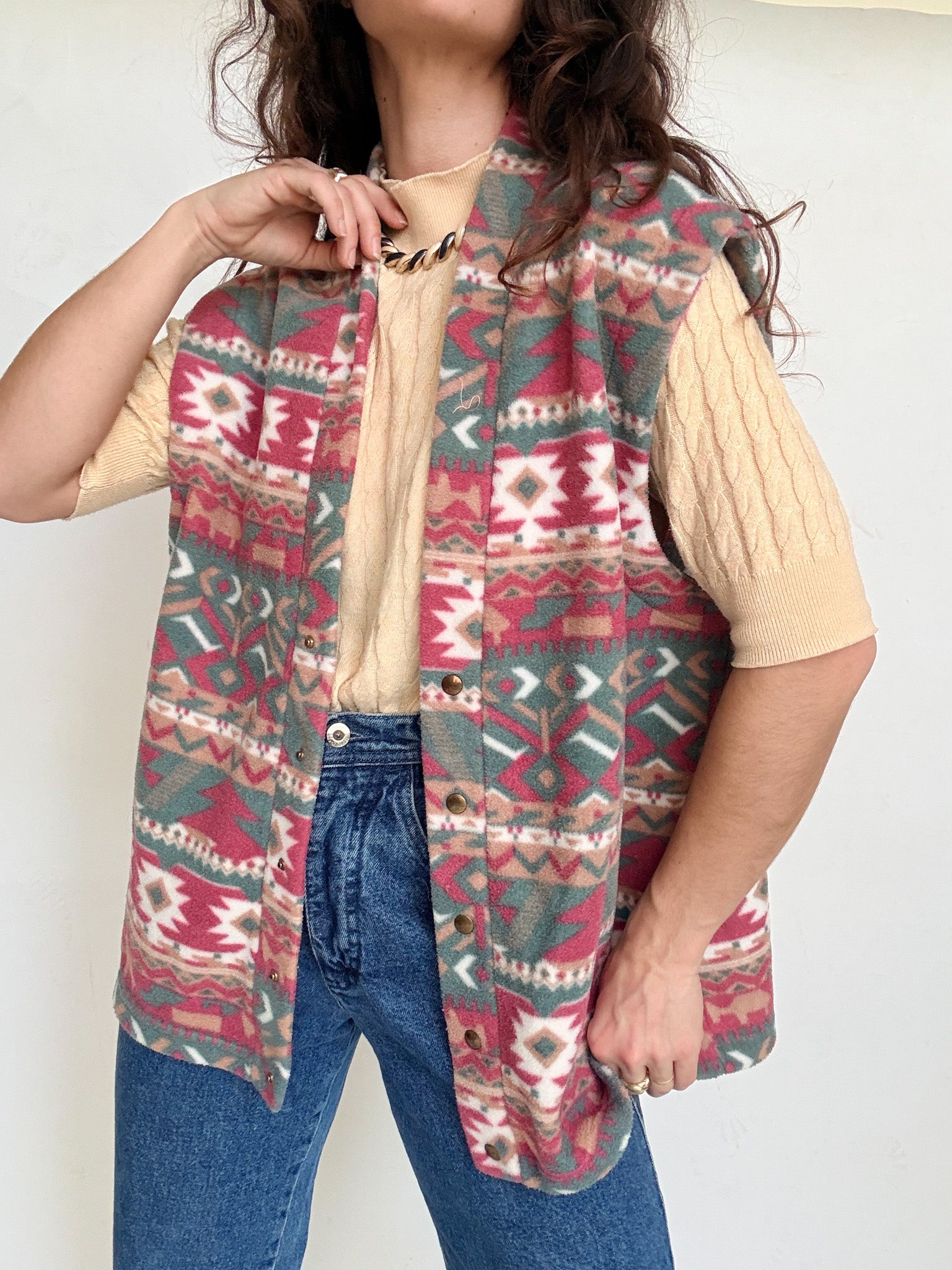 Chosen for its cosy feel and its bold yet easy to wear design, this vintage fleece vest is a perfect layering piece. The aztec inspired pattern brings character without overpowering a look, while the soft polar texture adds warmth and comfort. Selected for its versatility, it works effortlessly layered under a jacket or worn on top of a shirt or knit to highlight textures and silhouettes.
