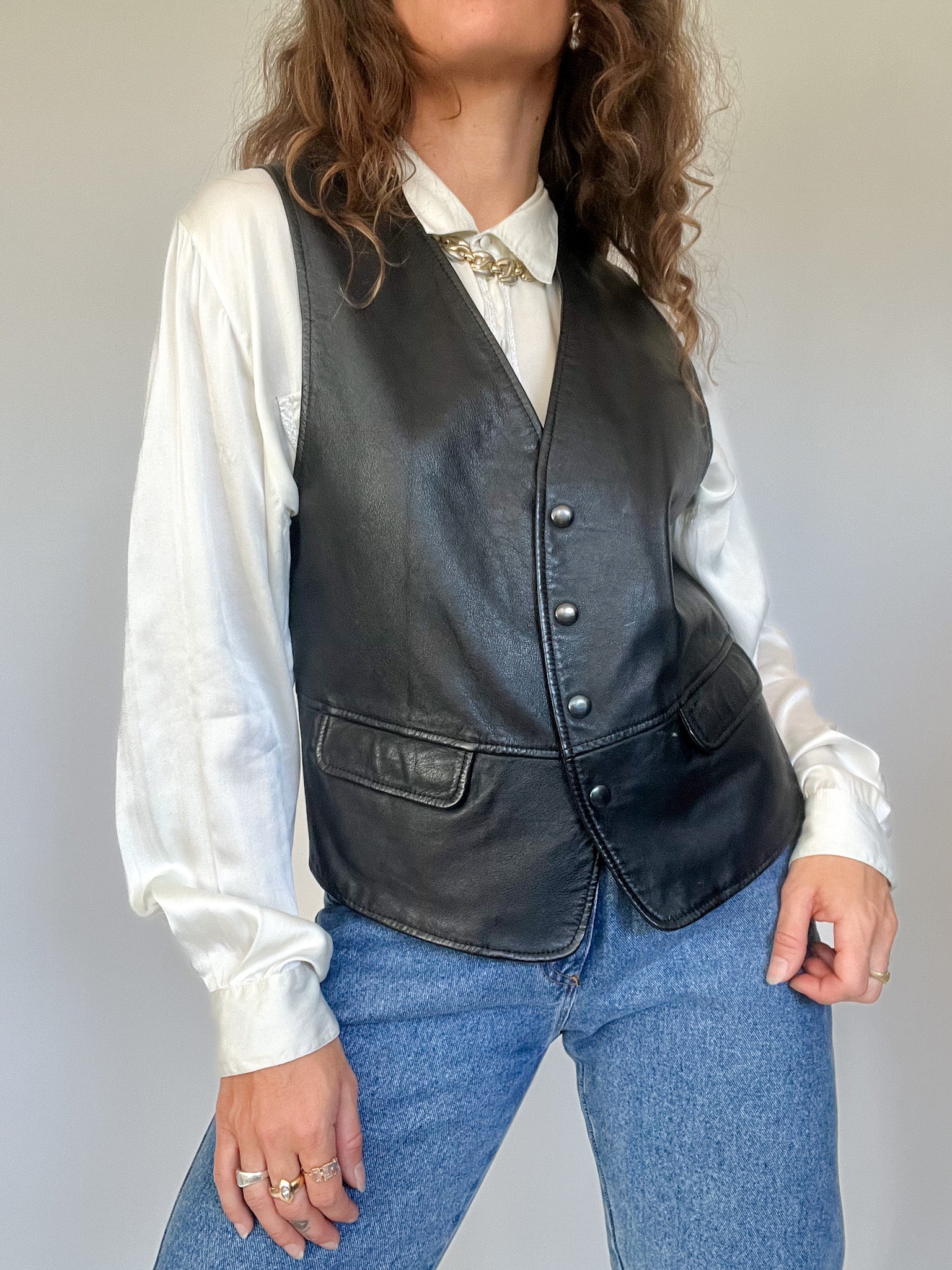 Minimalist yet bold, this 90’s black leather waistcoat is a versatile layering piece that adds instant edge to any look. Made from 100% genuine leather, it features snap button closures and flap pockets for a touch of utility. Whether worn over a silk blouse for contrast or styled alone for a daring statement, it embodies the Skorpiones Vintage philosophy—authentic, timeless, and empowering. A rare essential for those who want to play with silhouettes and attitude.