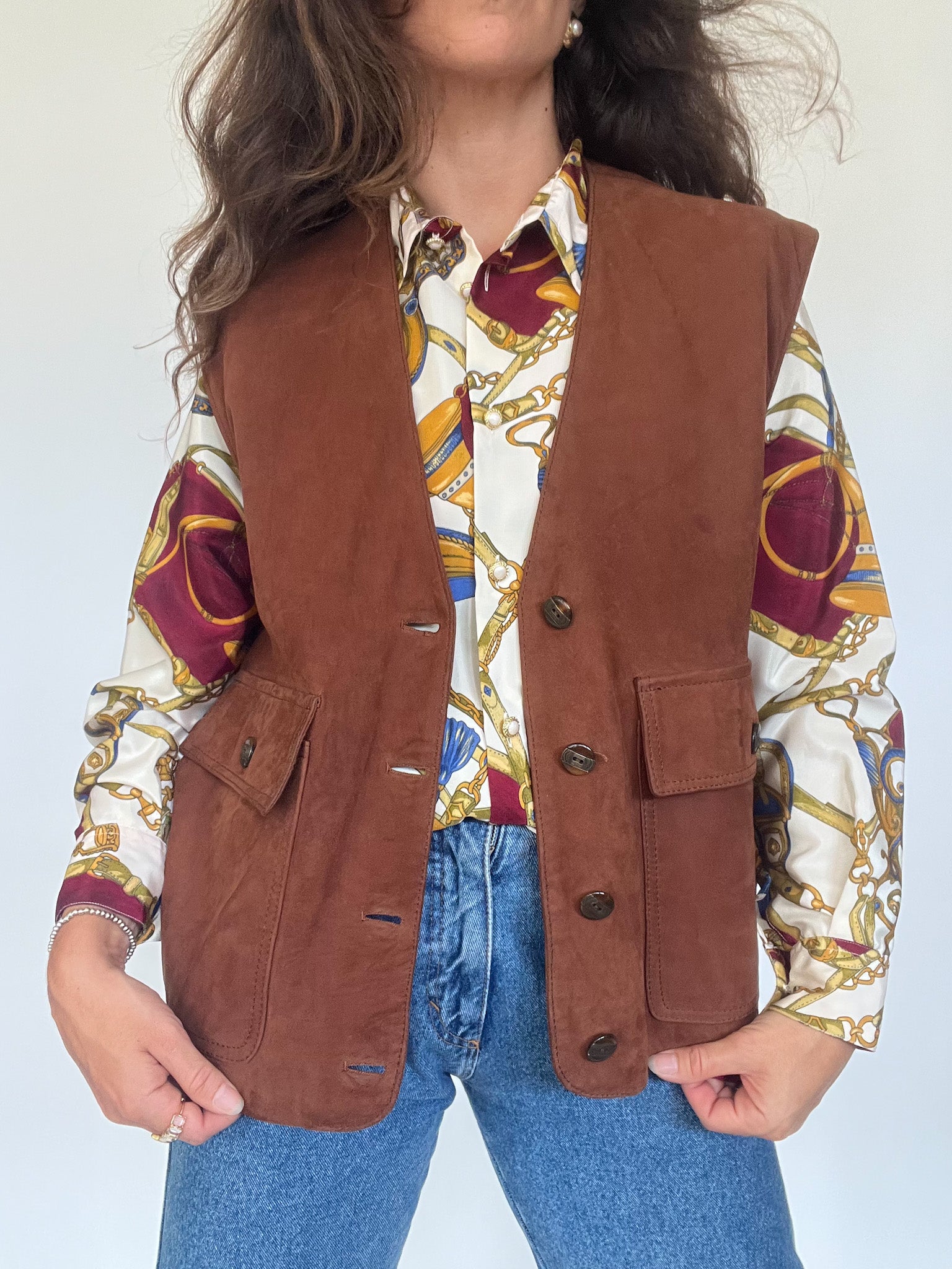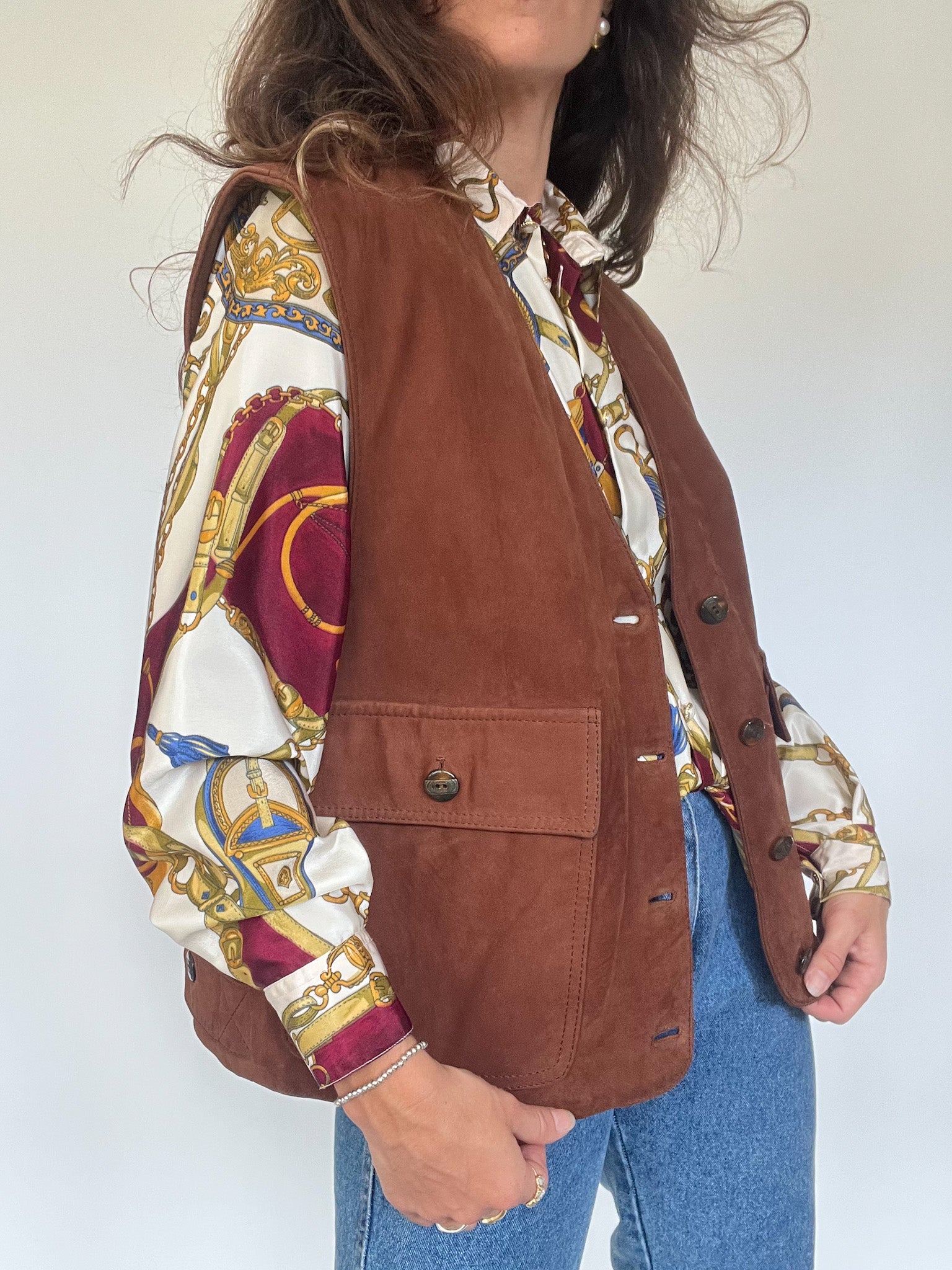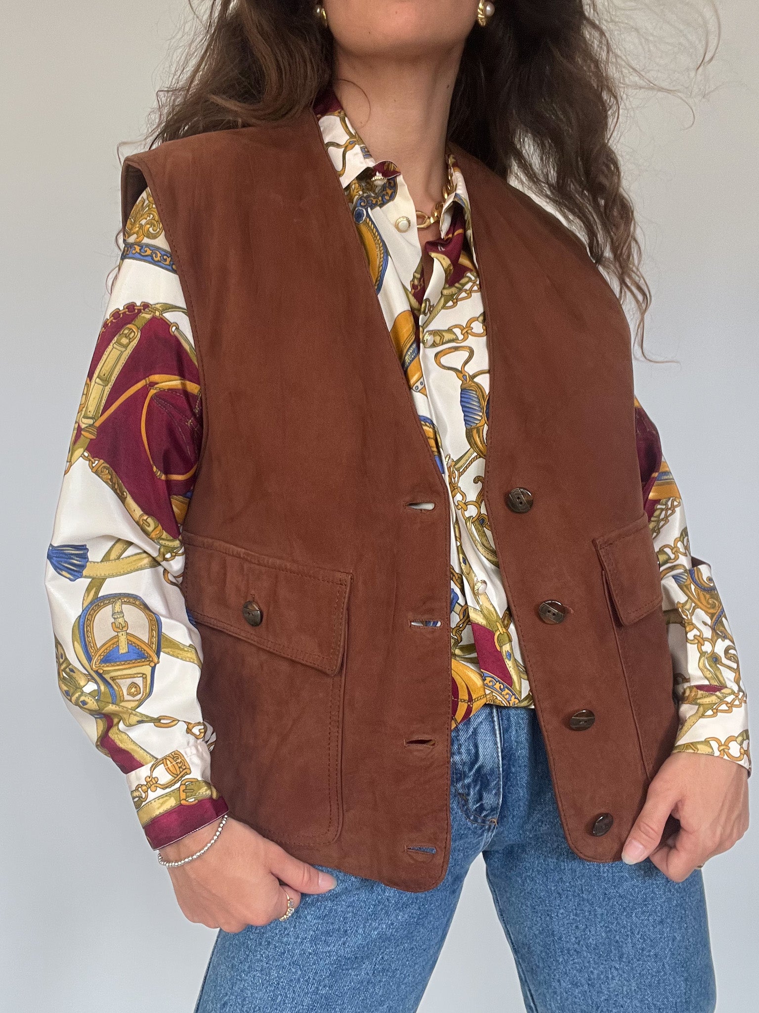 This vintage suede vest is a versatile layering piece that embodies 90’s casual sophistication. Crafted from 100% leather in a warm chestnut brown tone, it adds structure and texture to any outfit while keeping a laid-back yet refined vibe. The generous pockets and button-front closure highlight its utility-inspired charm, making it perfect worn over blouses, dresses, or simple tees. A timeless piece that reflects the authenticity and understated power of Skorpiones Vintage.