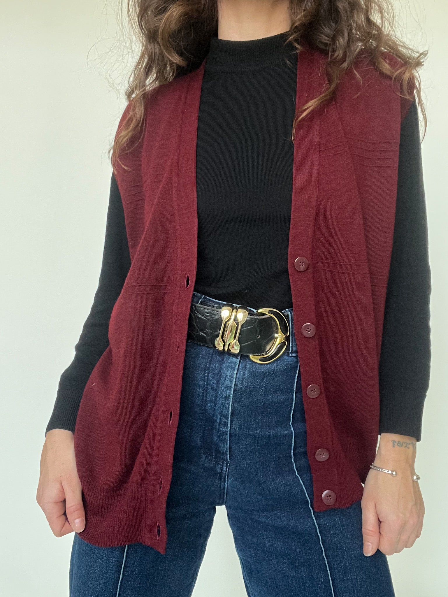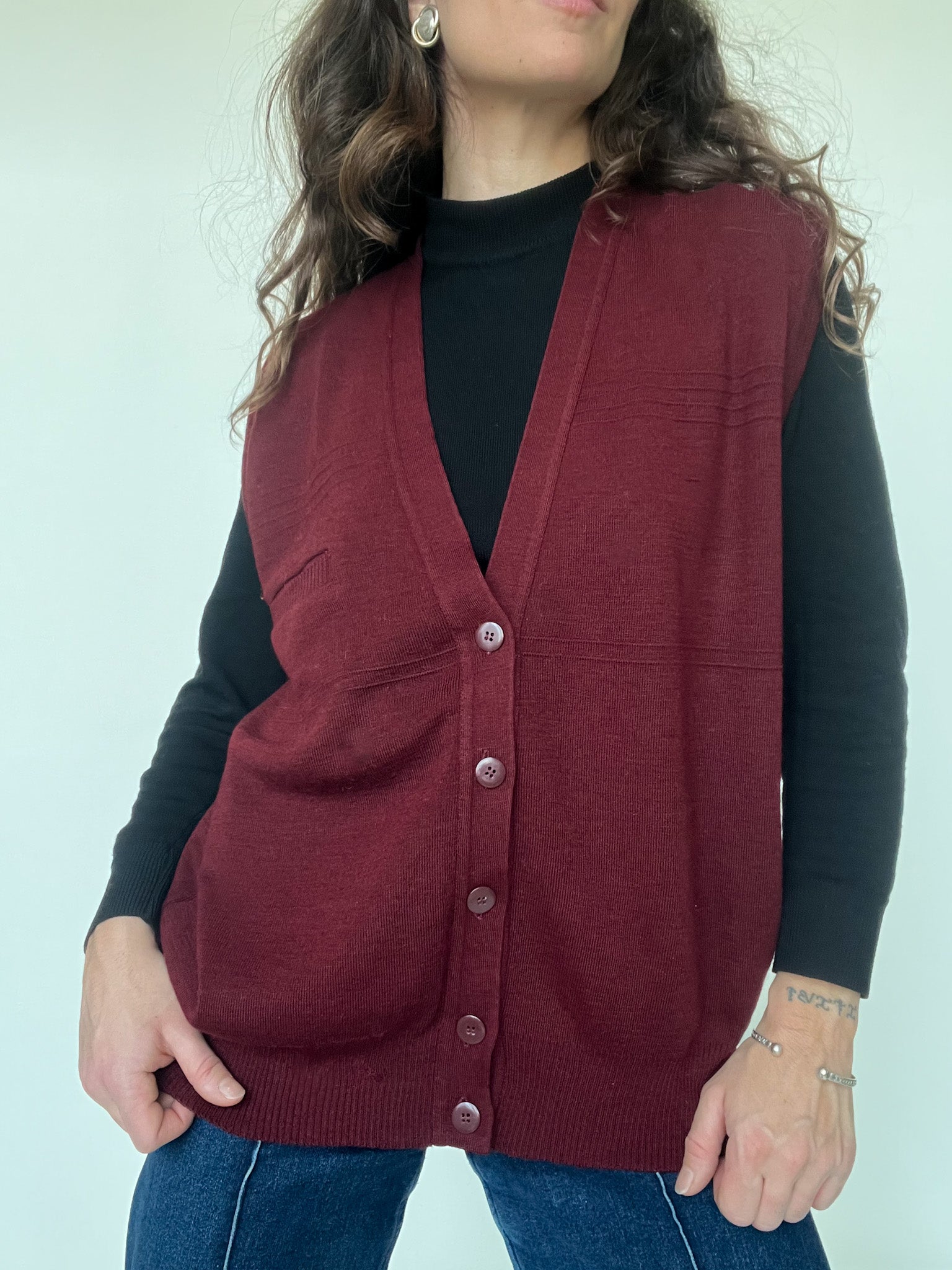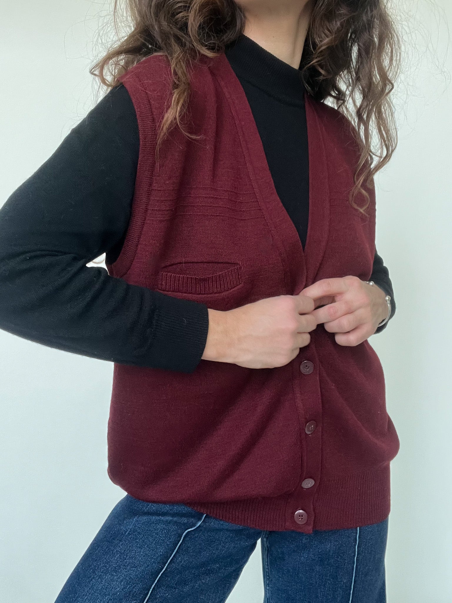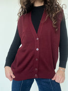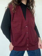 - Special features: Sleeveless knit vest, deep burgundy tone, button front closure, subtle ribbed finishes, small front pocket