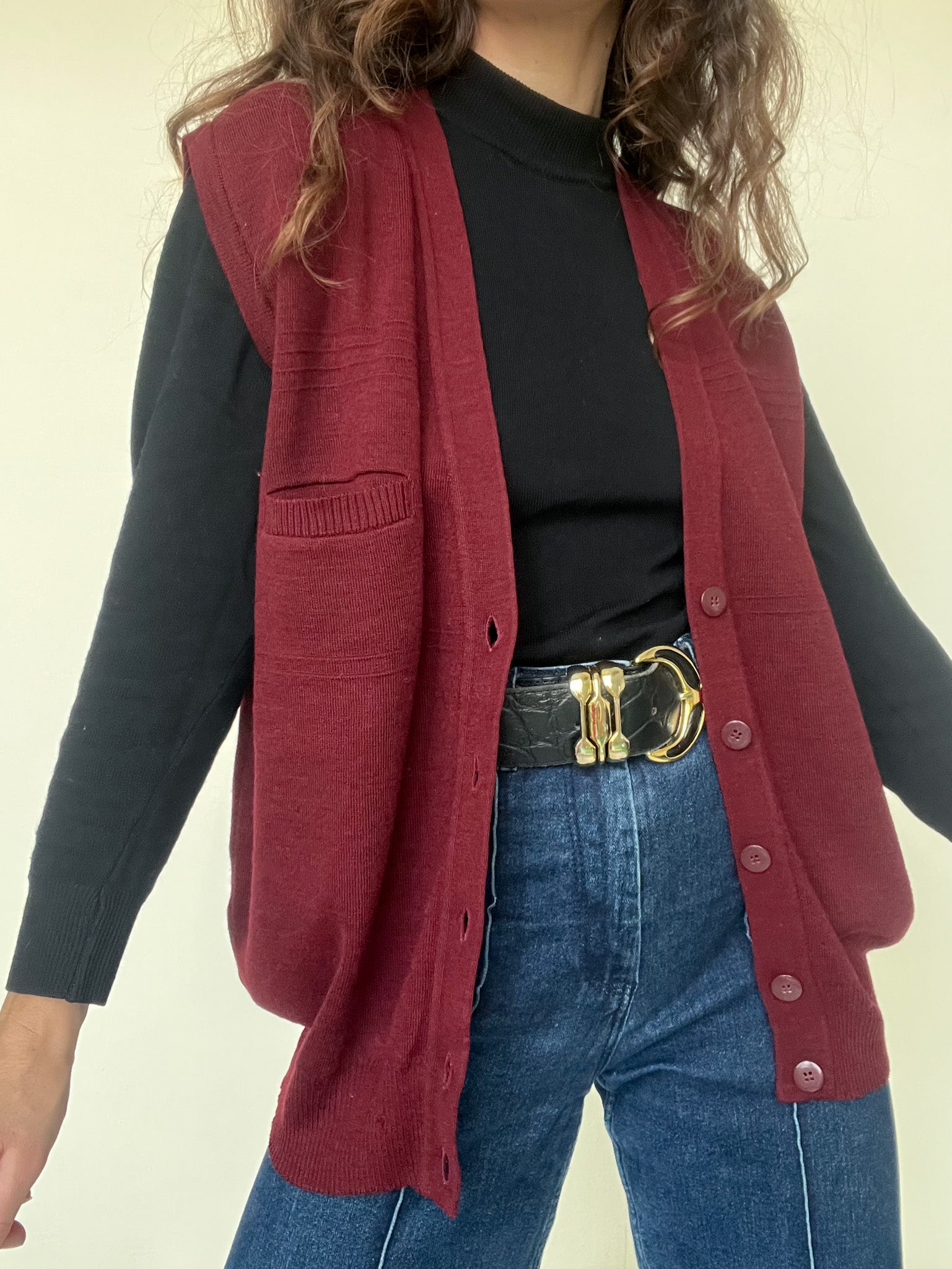 This deep burgundy knit vest embodies the understated elegance of 90’s silhouettes. Its clean lines, rich tone and softly structured knit make it an easy yet powerful layering piece. Worn over a shirt or a fine pullover, it adds warmth and character while keeping the look effortless and confident.