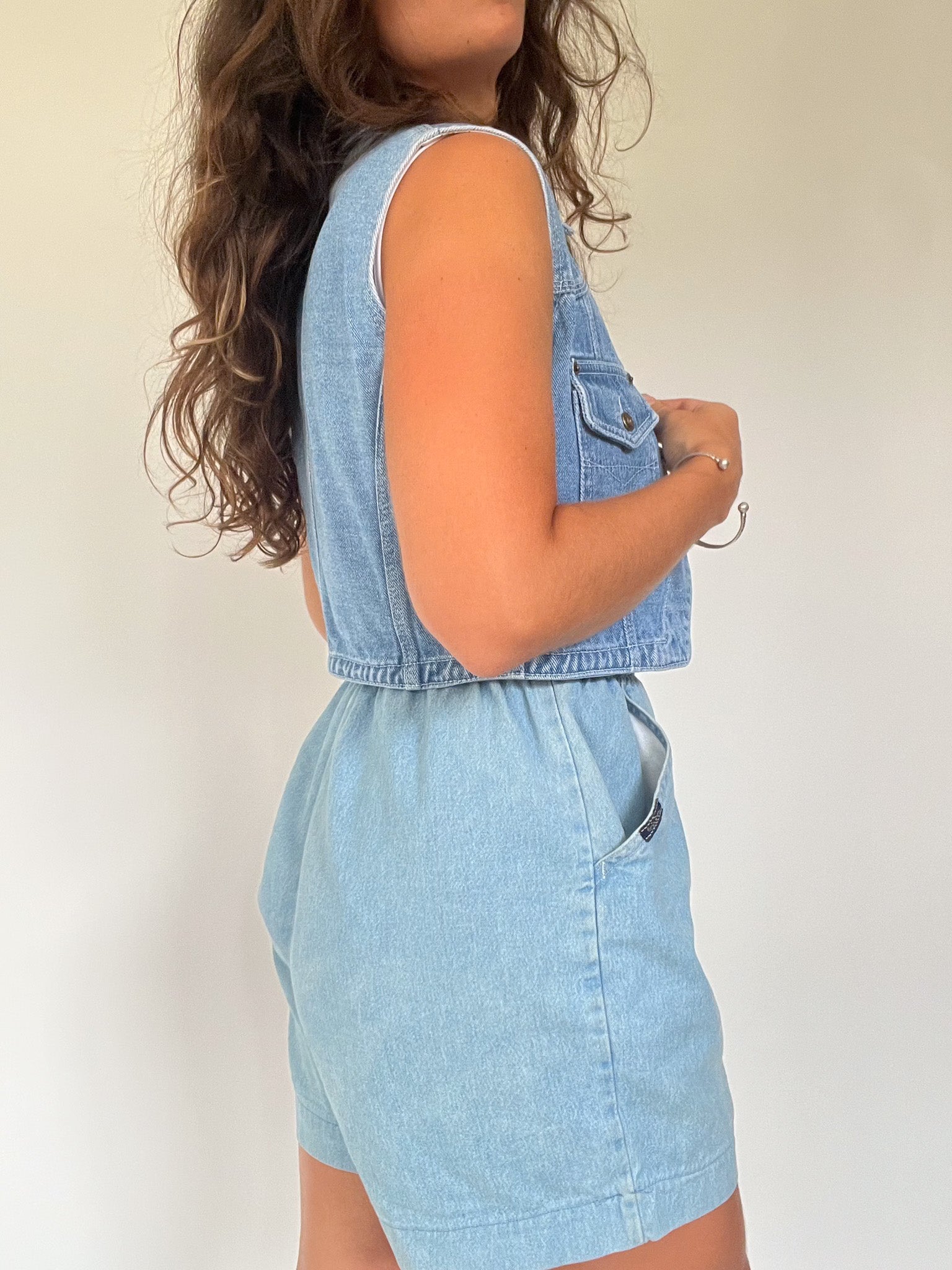 Straight from the golden era of laid-back cool, this vintage 90’s cropped denim vest is the ultimate layering staple. With its sharp collar, structured fit and iconic bronze buttons, it channels the energy of the decade with zero effort. The mid-wash denim is soft yet sturdy, and the cropped cut hits perfectly at the waist for that flattering silhouette. Worn over a tank or thrown on a summer dress, it’s a signature piece for those who dress with attitude and ease — the Skorpiones way.