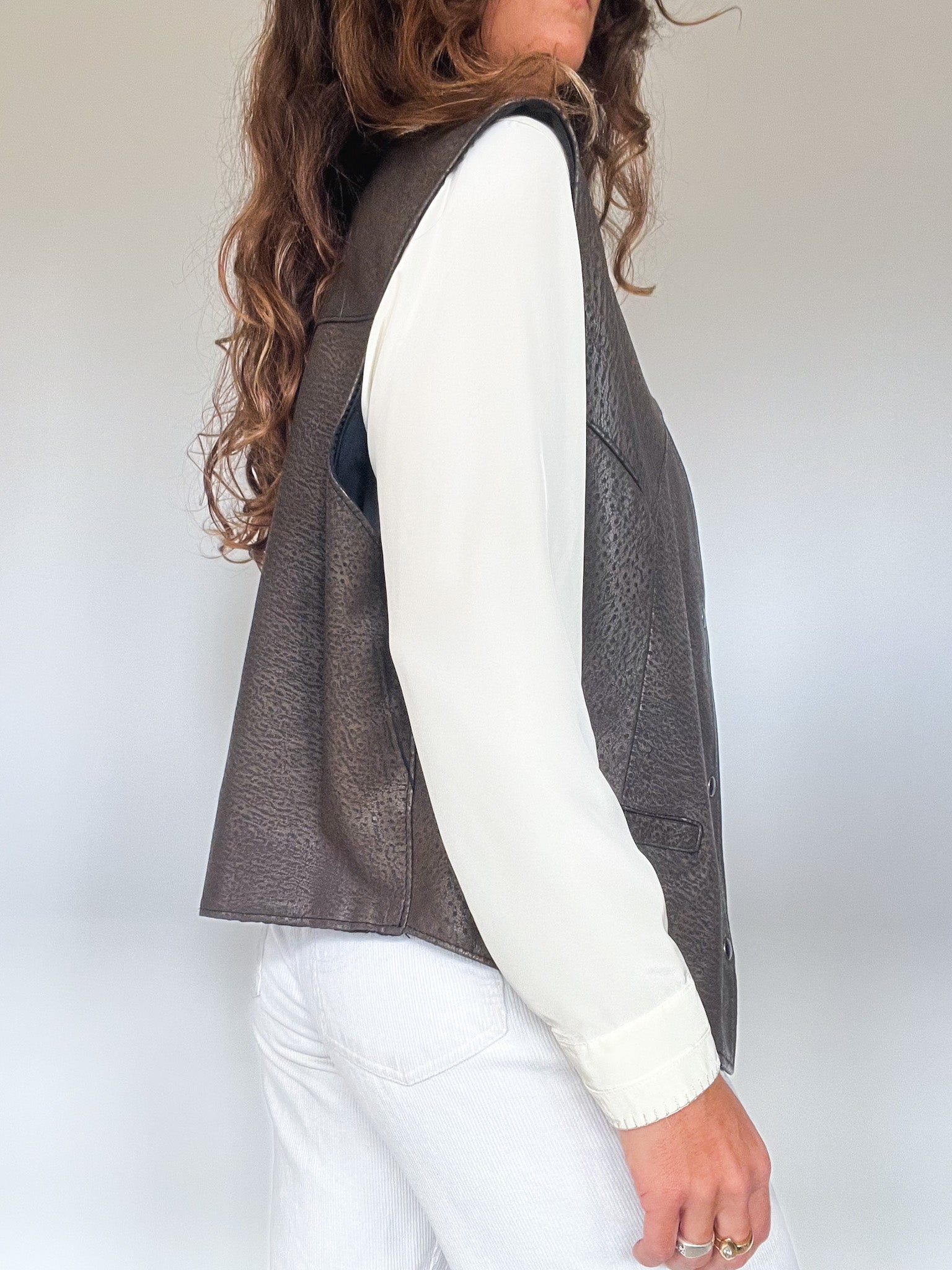 Crafted from 100% genuine leather, this Italian-made vest is a bold statement piece with a refined Western-inspired edge. Its textured finish and structured cut reflect the strength and quality of 90’s craftsmanship, while the snap button closure and welt pockets add both practicality and style. Designed to empower and distinguish, this vest is a true Skorpiones Vintage piece—authentic, exclusive, and timelessly iconic.