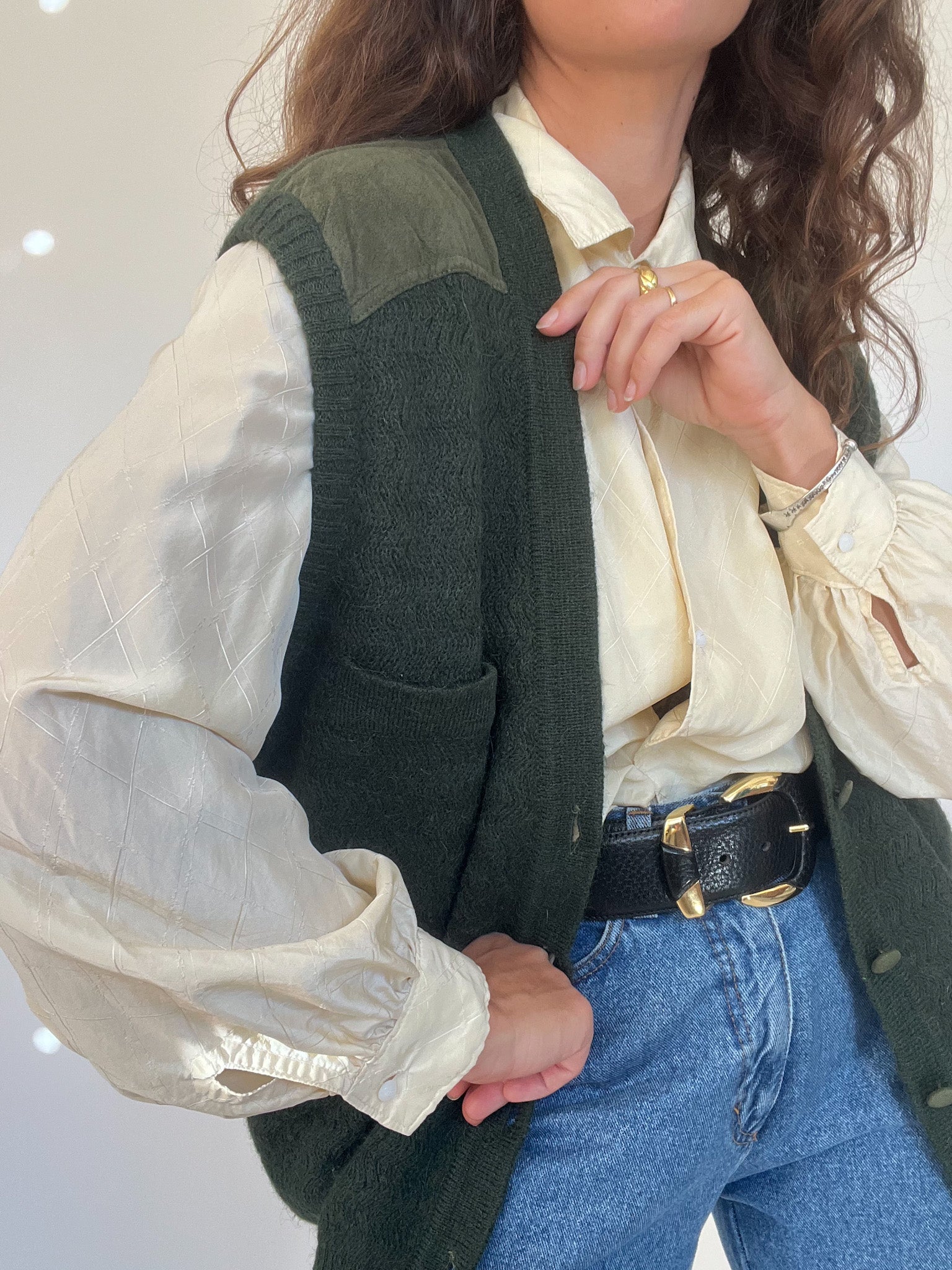 This 90’s khaki vest blends comfort and sophistication through its alpaca-rich fabric. The mix of alpaca and acrylic creates a soft yet structured texture, offering both warmth and elegance. With its earthy khaki tone and relaxed cut, it can be styled effortlessly — layered over a shirt for a chic look or worn solo for a minimalist statement. A refined yet versatile piece that perfectly embodies the Skorpiones Vintage spirit: authentic, exclusive, and empowering.