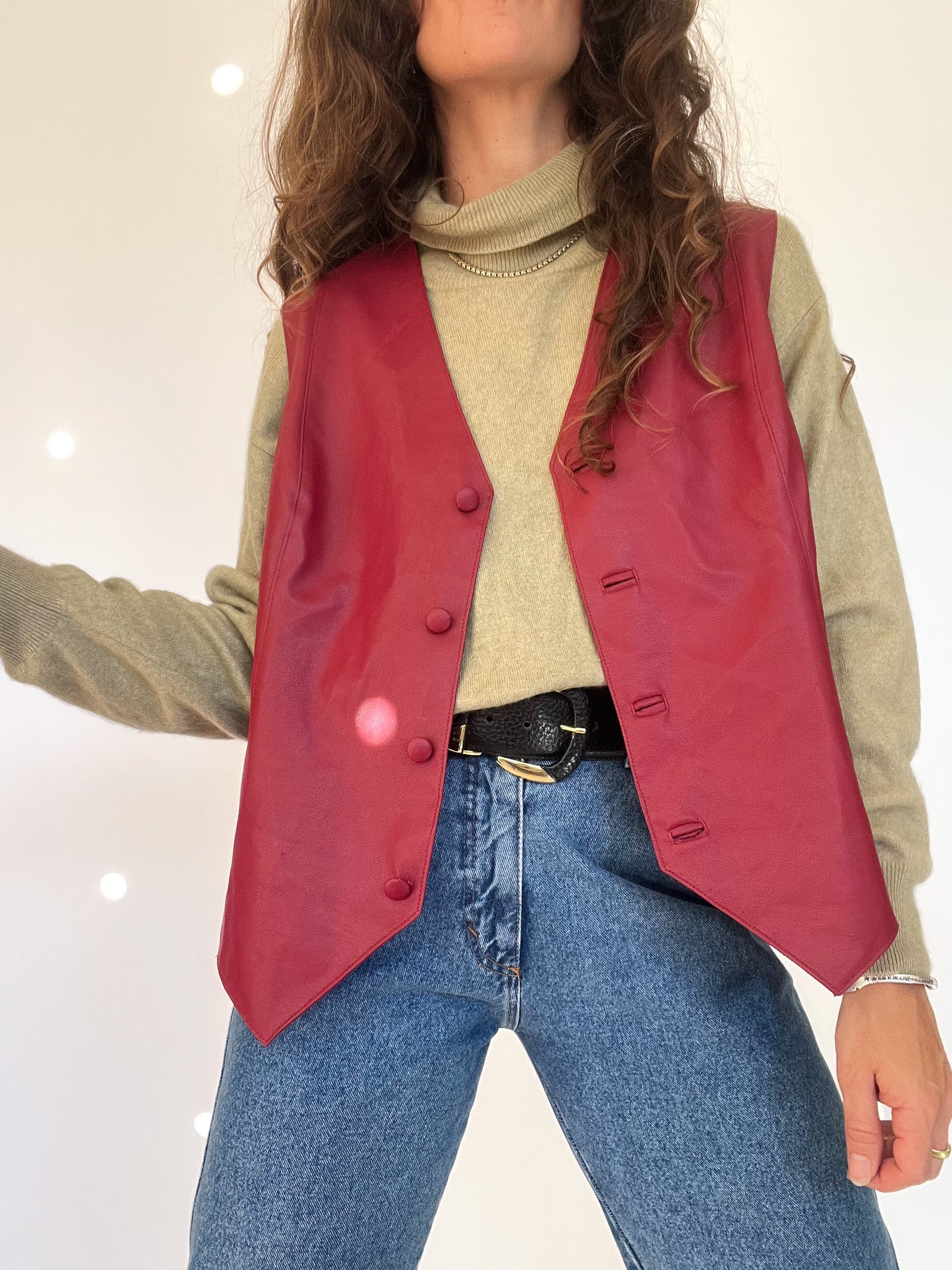 This bold 90’s red leather vest carries the spirit of rebellion with a refined edge. Its sharp pointed hem and covered buttons create a sleek silhouette, while the hidden paisley lining adds a touch of sophistication and surprise. A versatile piece that embodies the Skorpiones Vintage ethos: timeless, empowering, and unapologetically unique.
